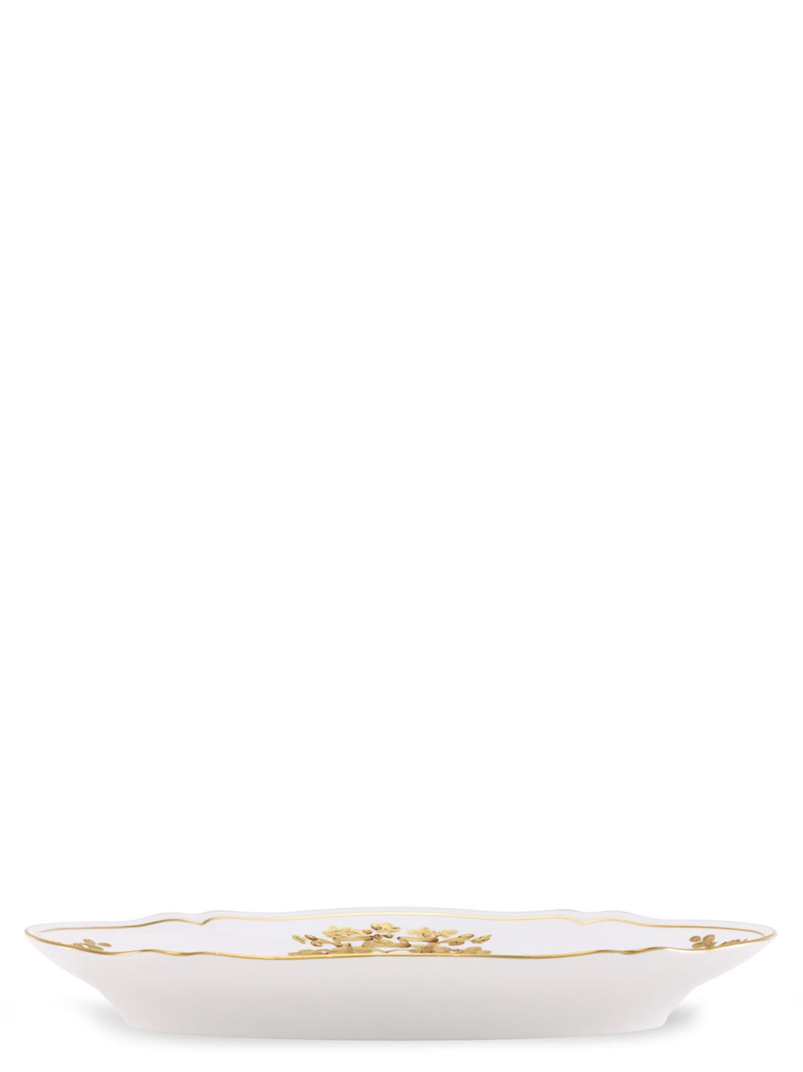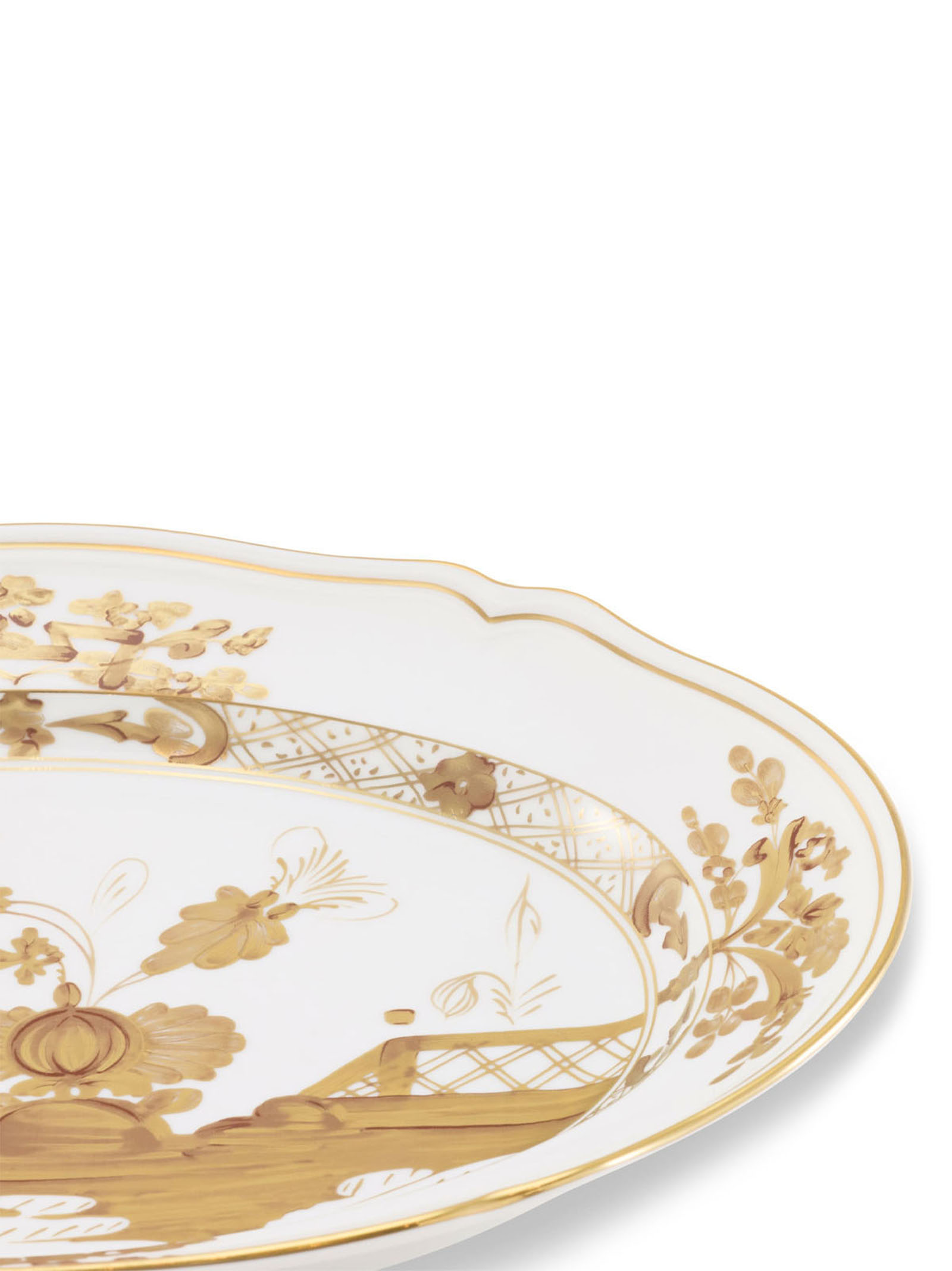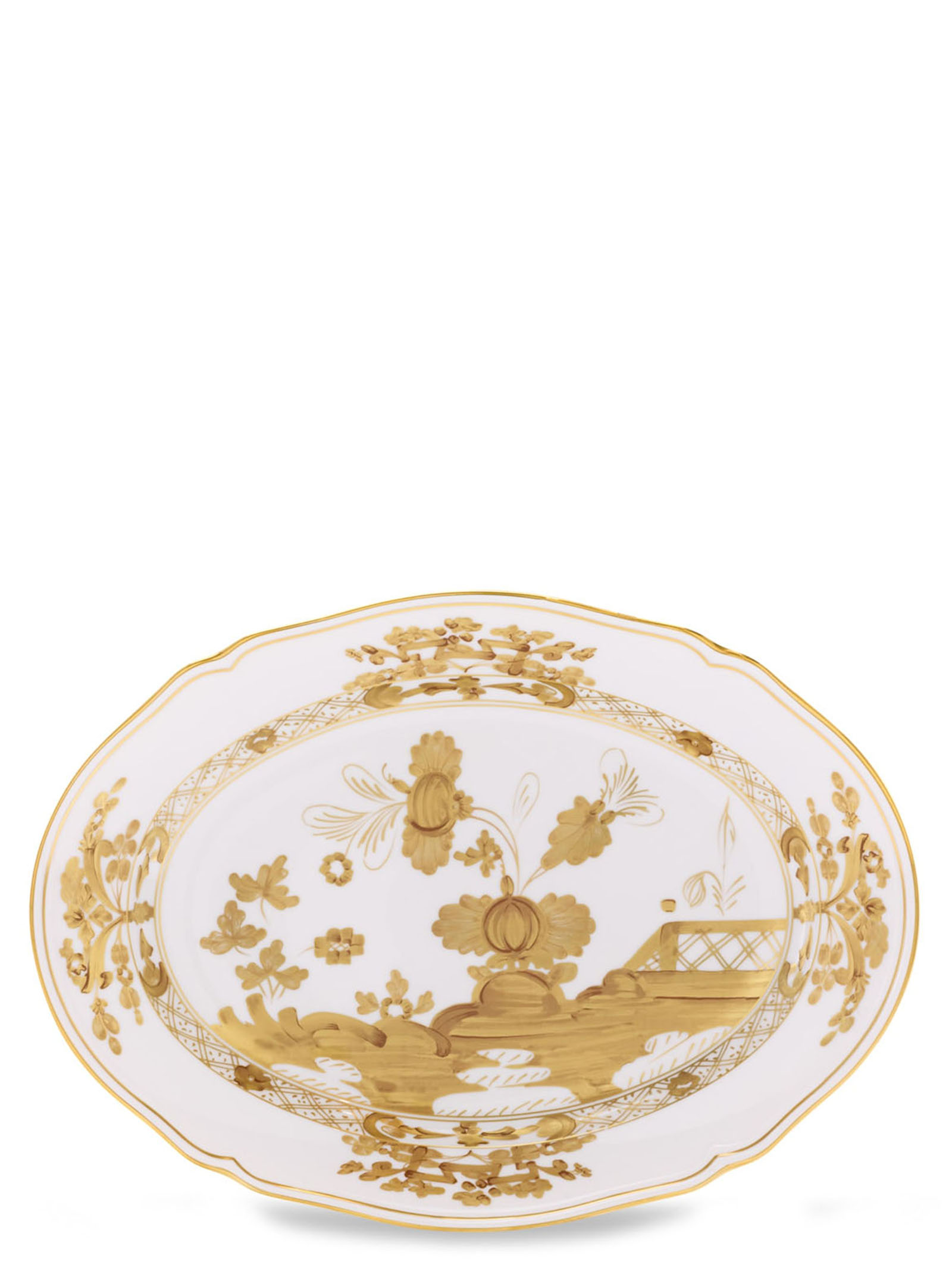 Овальне сервувальне блюдо з білим оздобленням Aurum і золотим кантем. Колекція 'Oriente Italiano'. Не придатне для мікрохвильової печі. Можна мити в посудомийній машині на делікатному режимі.