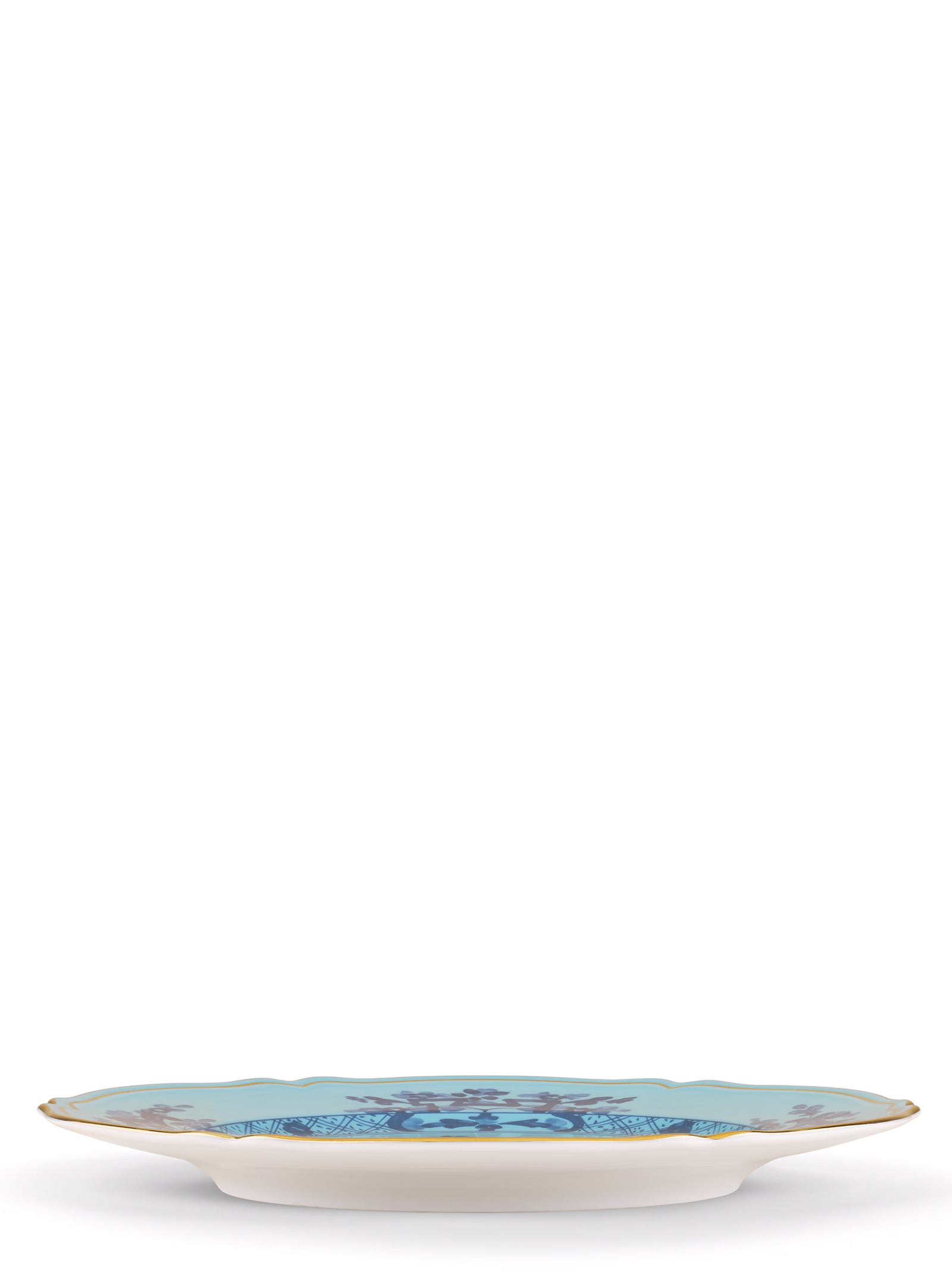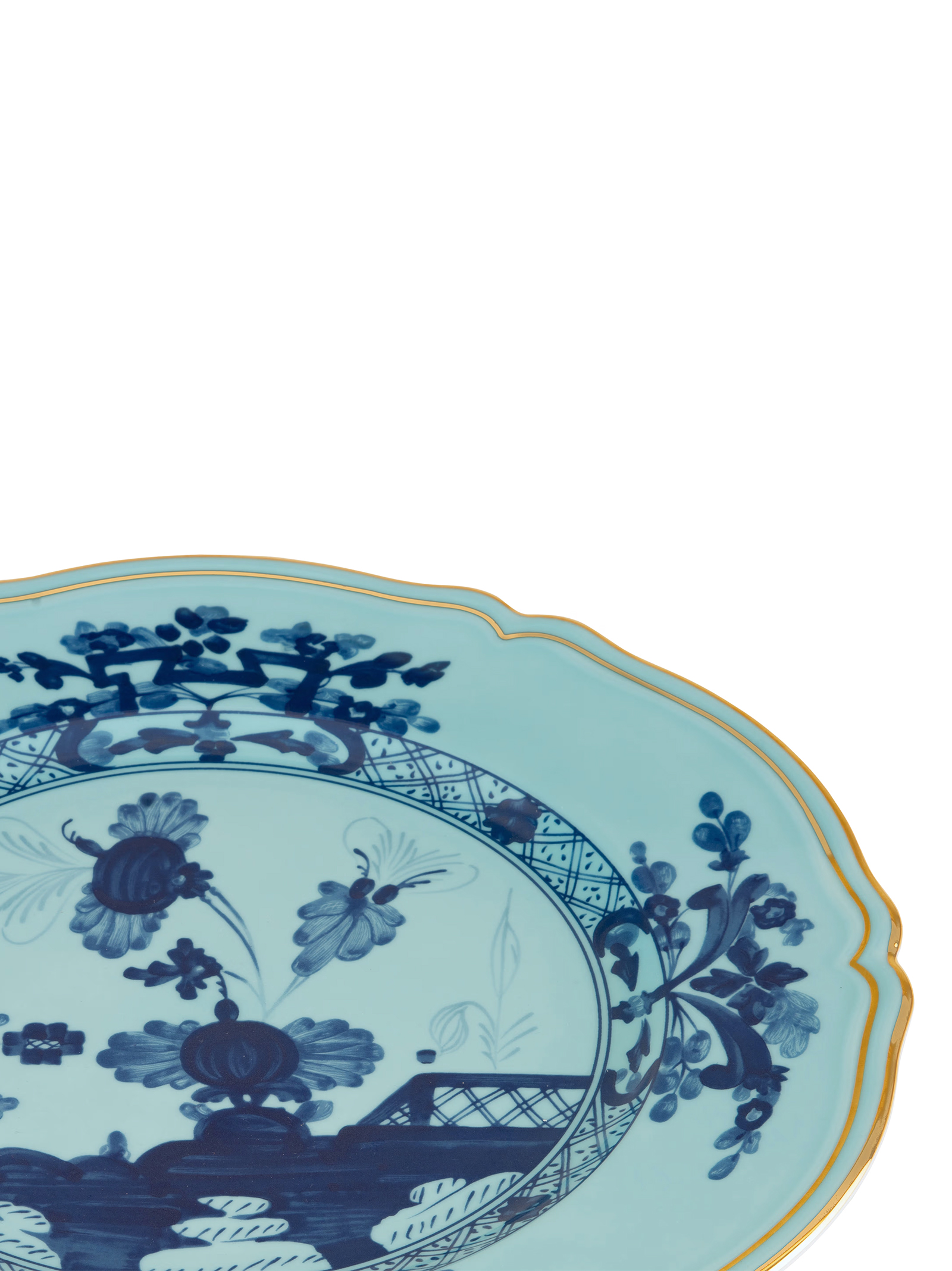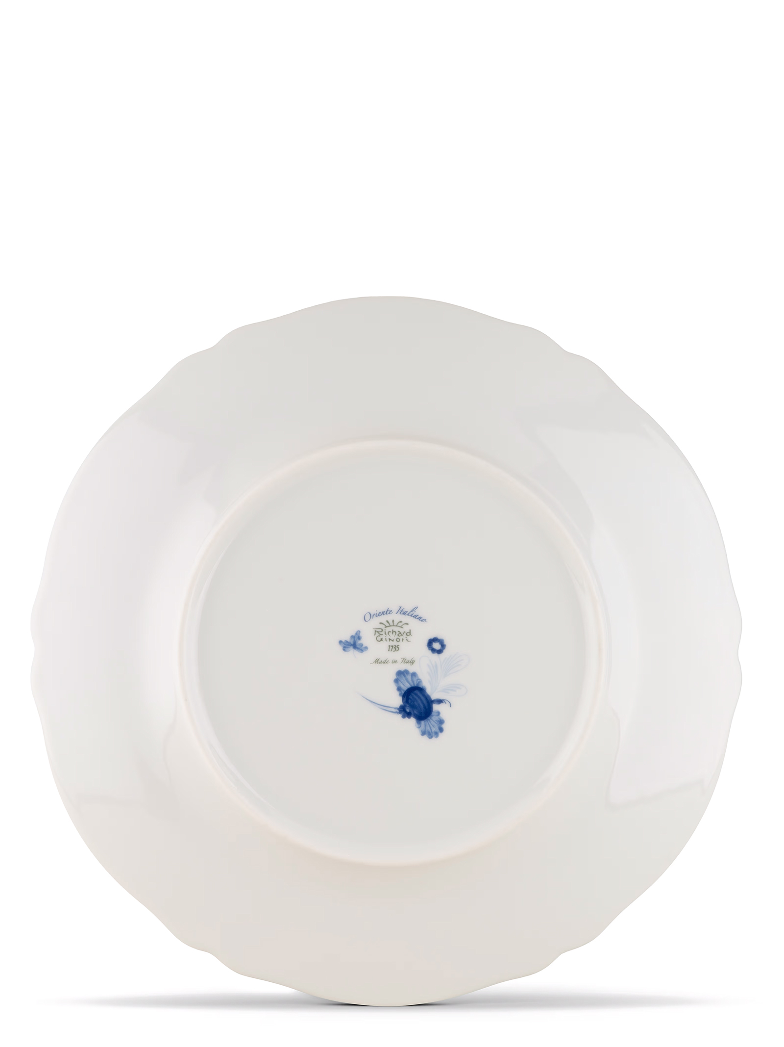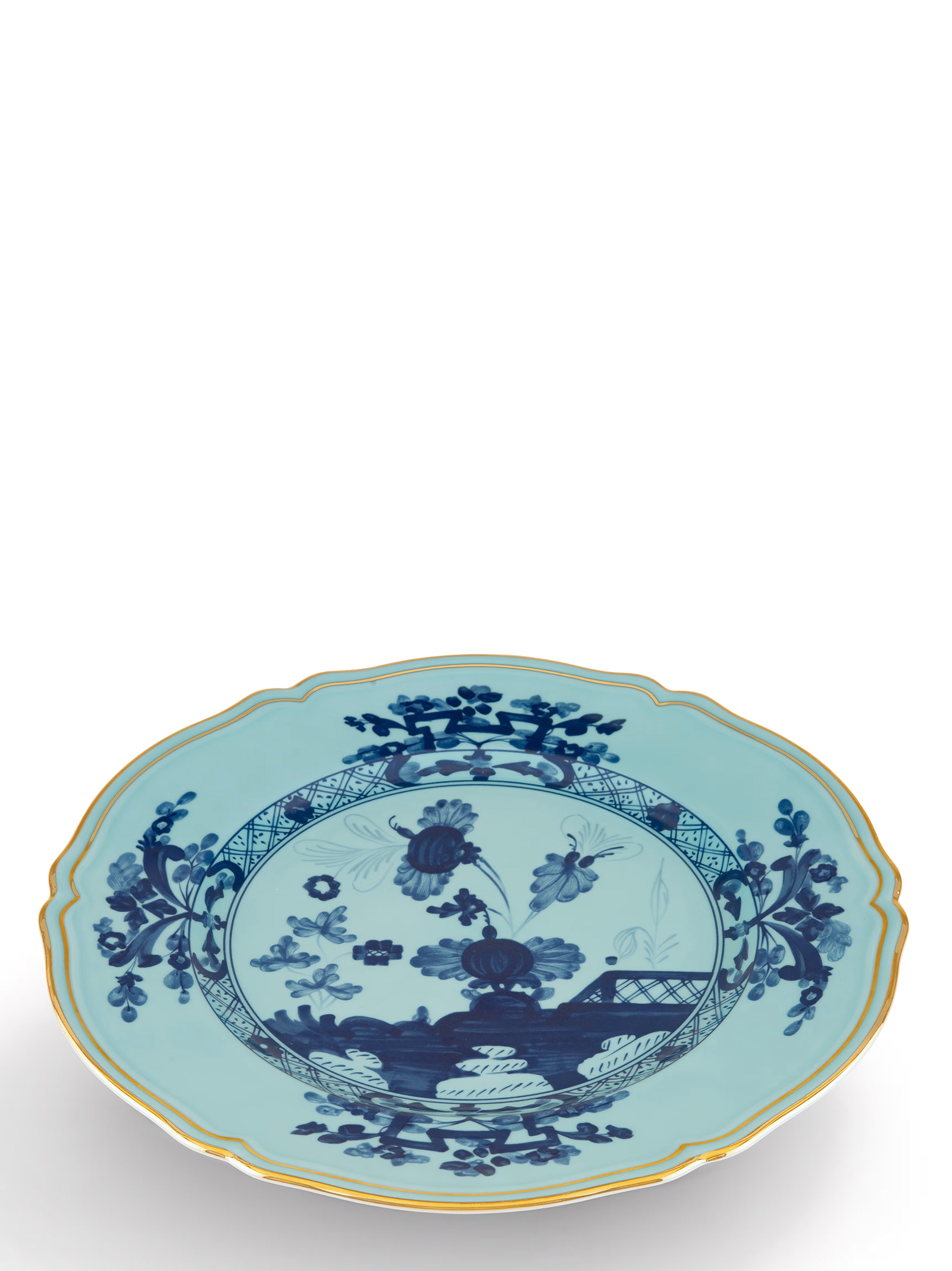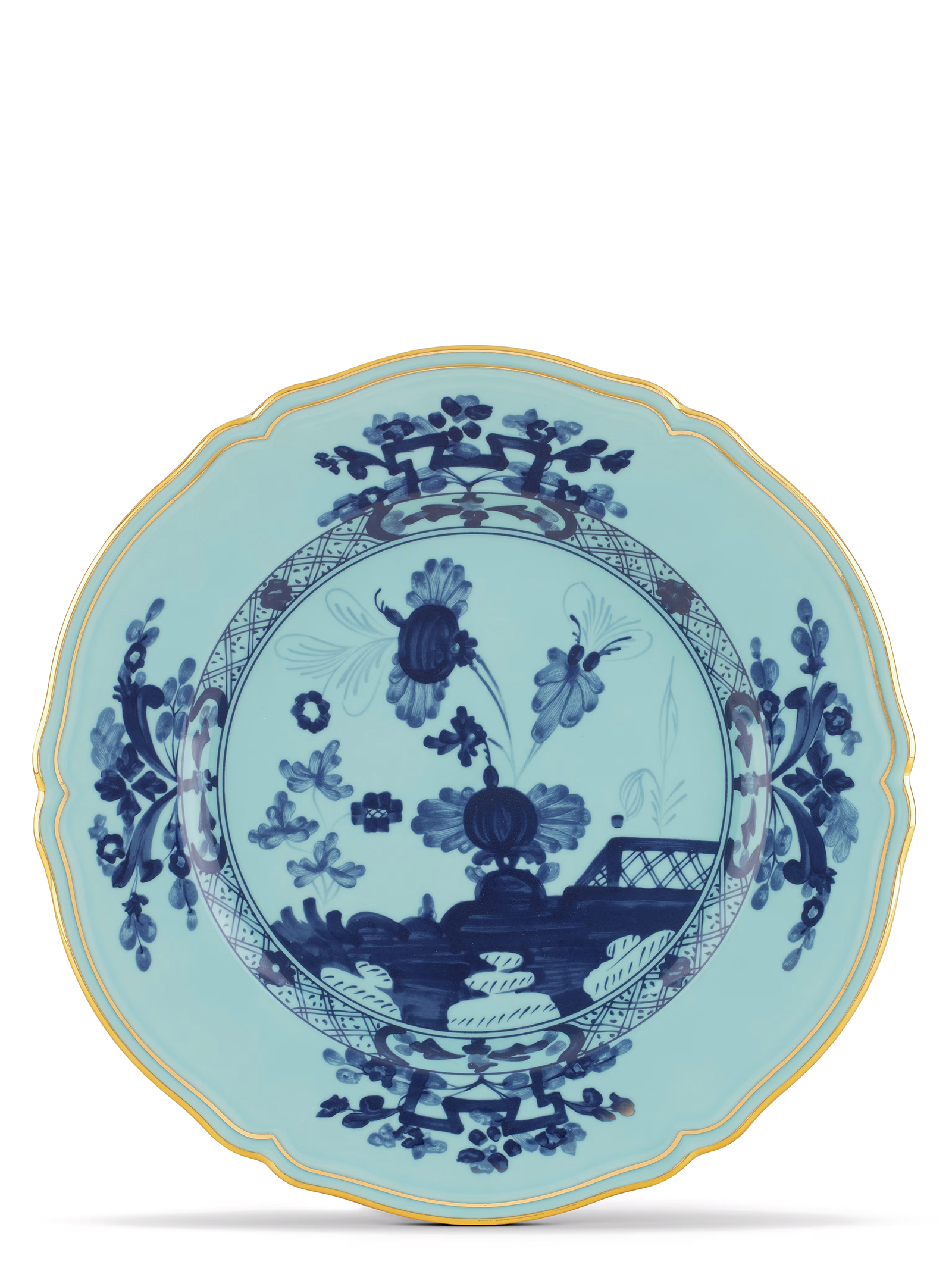 Порцелянова тарілка для сервірування з декором синьої іриси та золотою окантовкою. Колекція 'Oriente Italiano', форма 'Antico Doccia' з іконічним візерунком 'a garofano'. Не придатна для використання в мікрохвильовій печі. Можна мити в посудомийній машині на делікатному режимі.