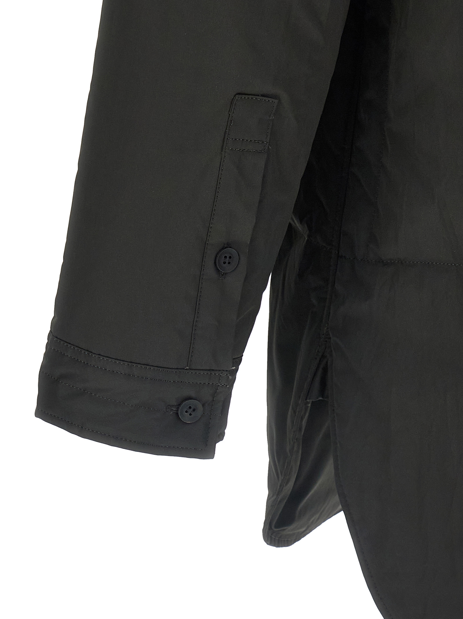 Легко наповнена нейлонова підкладка з принтом спереду, комір, застібка на гудзиках спереду, бічні розрізи, довгі рукави з манжетами.