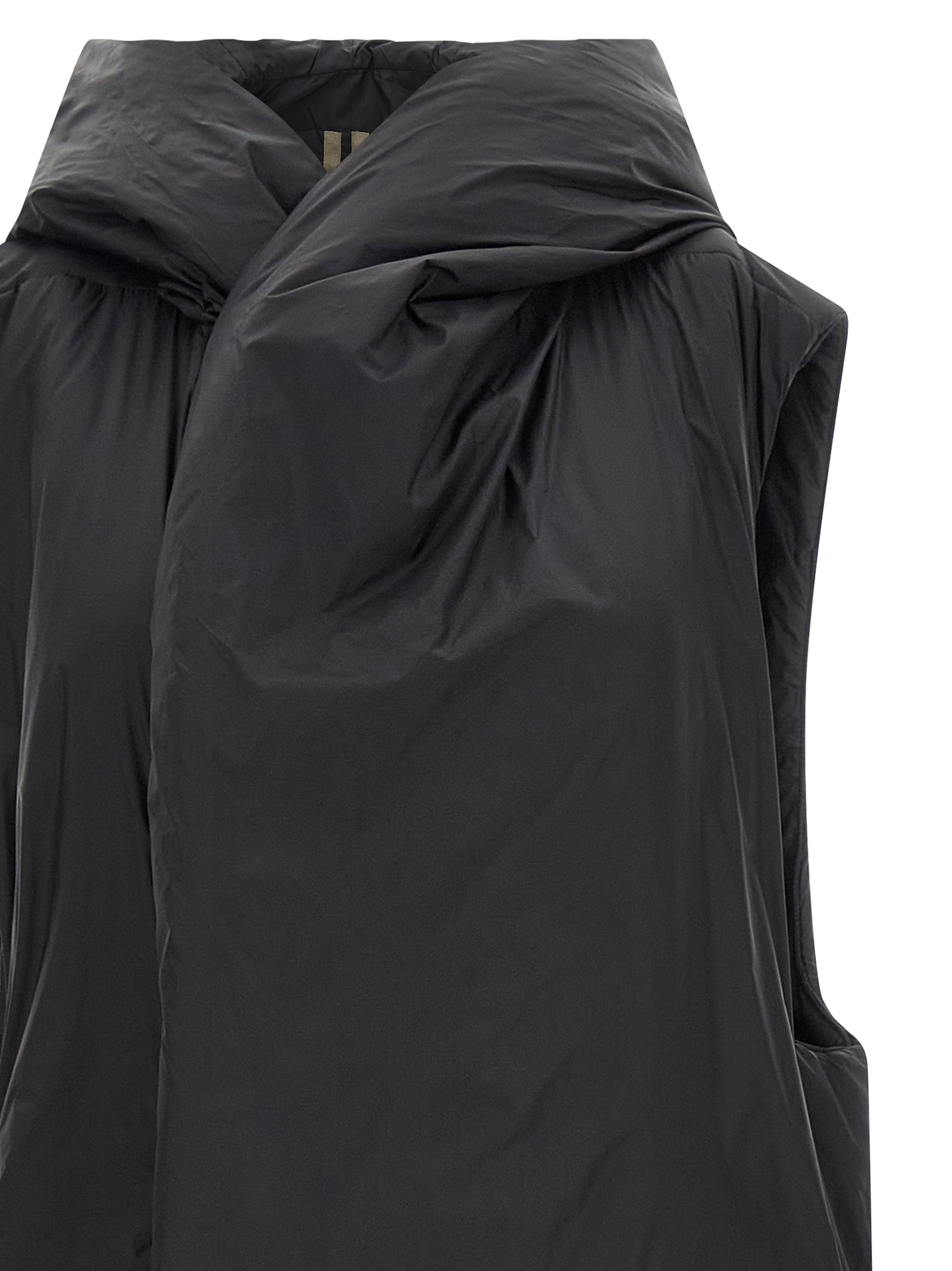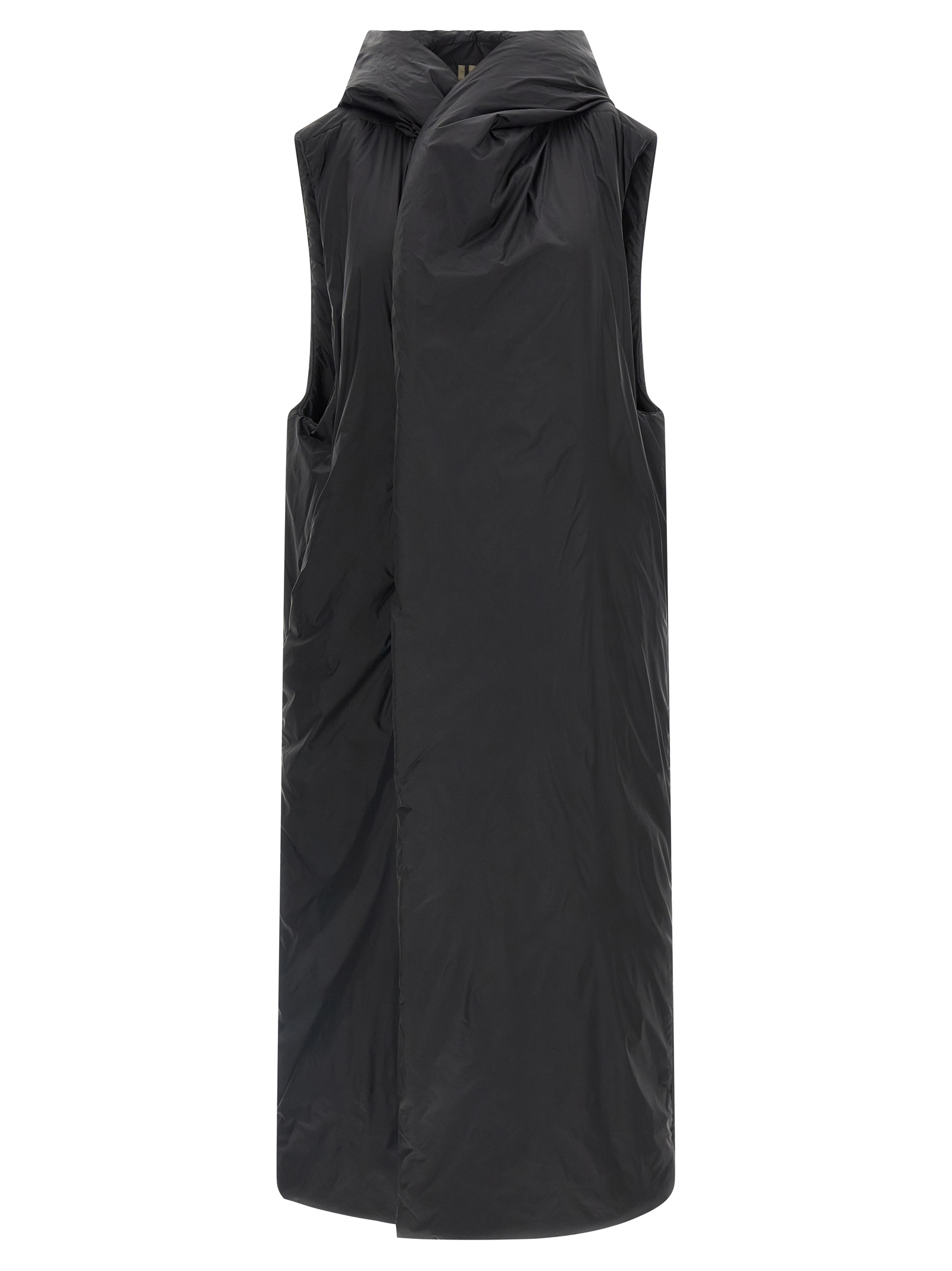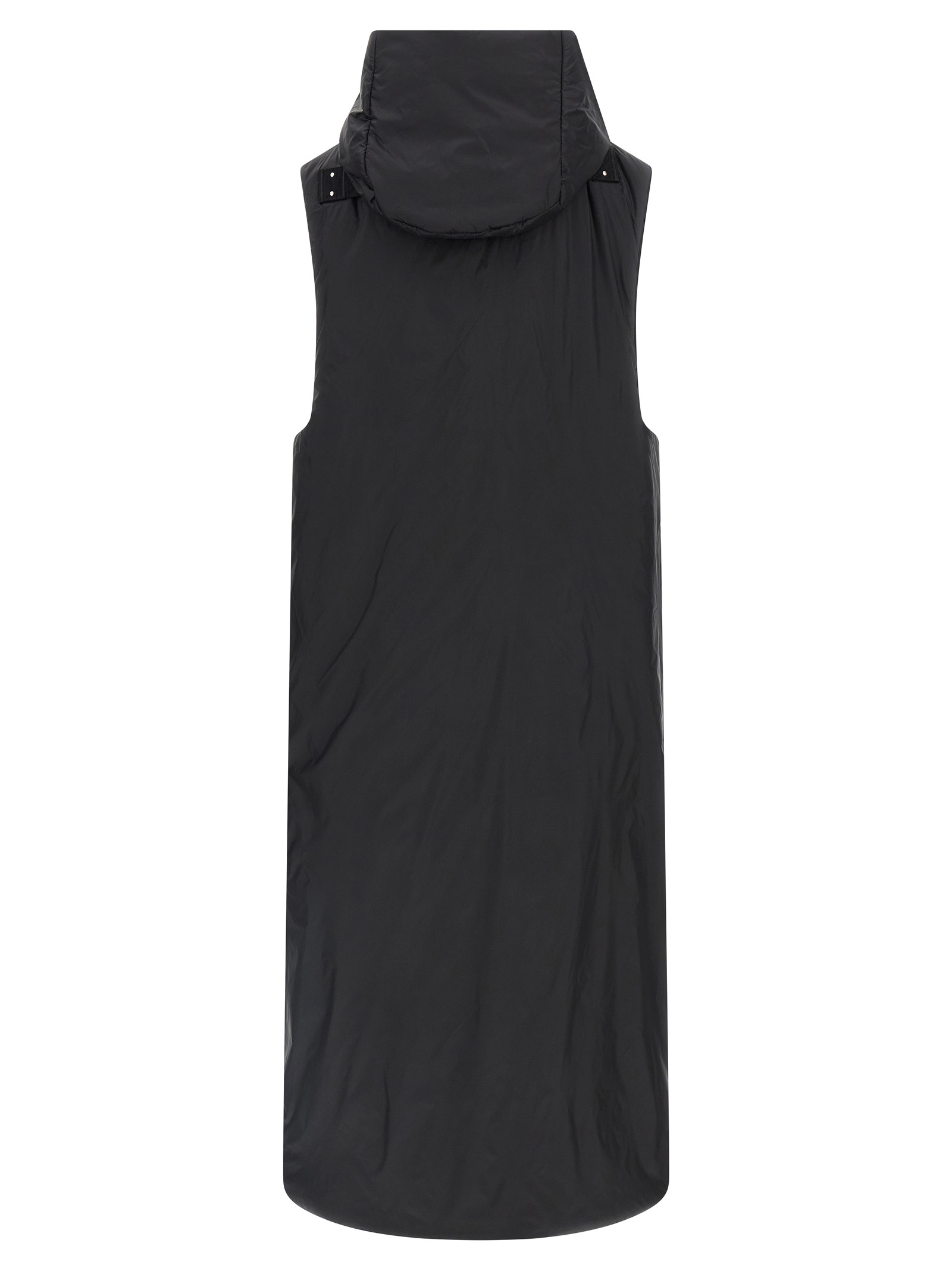 Утеплений довгий жилет з нейлону, капюшон, високий комір, асиметрична передня застібка на кнопках, кишені, бавовняна стрічка в тон з задніми заклепками. ЕКОЛОГІЧНО: Продукт виготовлений з перероблених матеріалів.