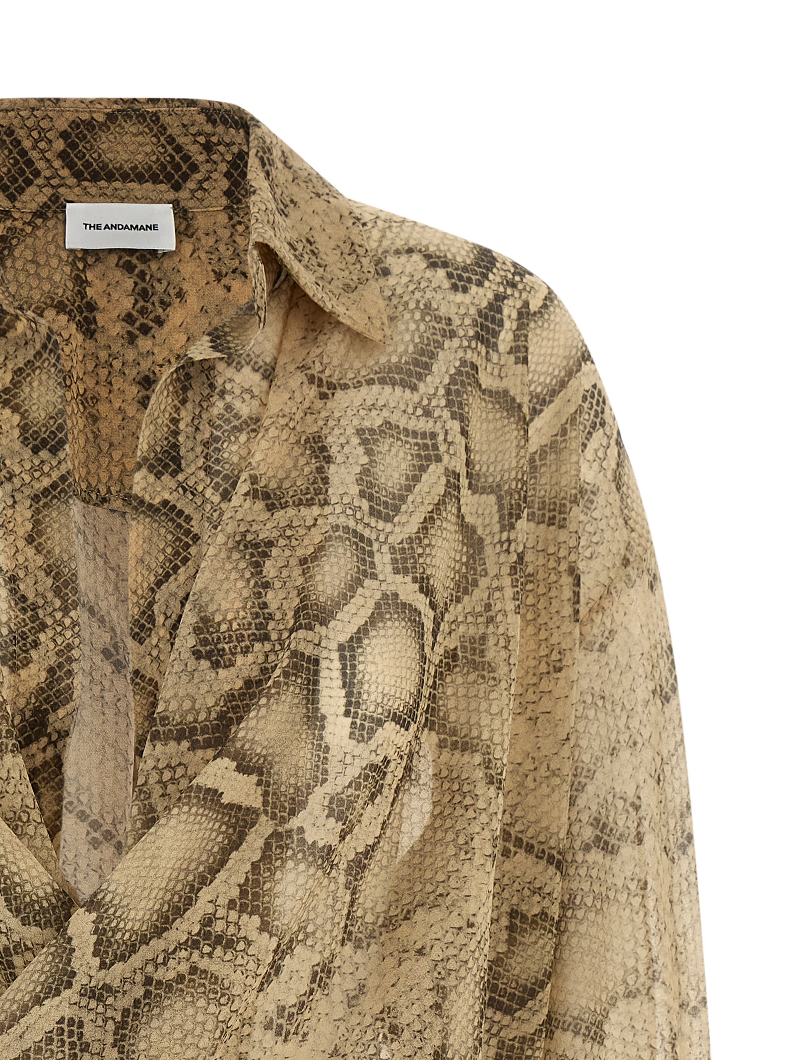 'Paloma' боді з напівпрозорої тканини з принтом пітон, комір з відкриттям, перехрестя та переднє драпірування, довгі рукави з манжетами та опущеними плечима, кнопки на нижній частині виробу.