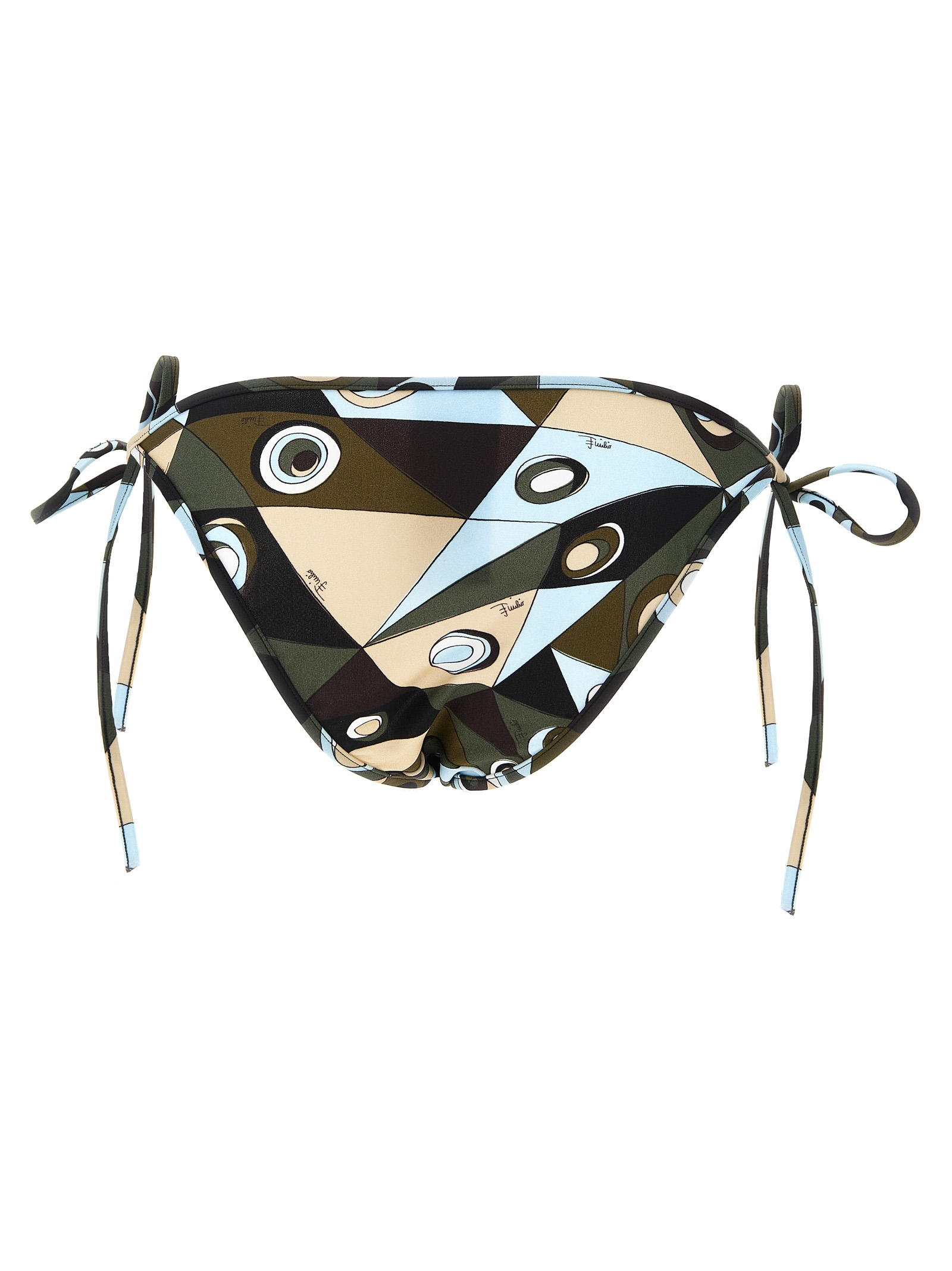 'Panties' низ бікіні з низькою талією з лайкри з принтом 'Occhi', регульованими шнурками, зав'язаними з боків. Цей виріб, як і багато інших товарів Pucci, виготовлений із тотального принта, який лягає по-різному на кожен виріб; доставлений продукт може відрізнятися від зображення. ЕКОЛОГІЧНО: Цей виріб виготовлений з екологічної анти-УФ LYCRA®.
