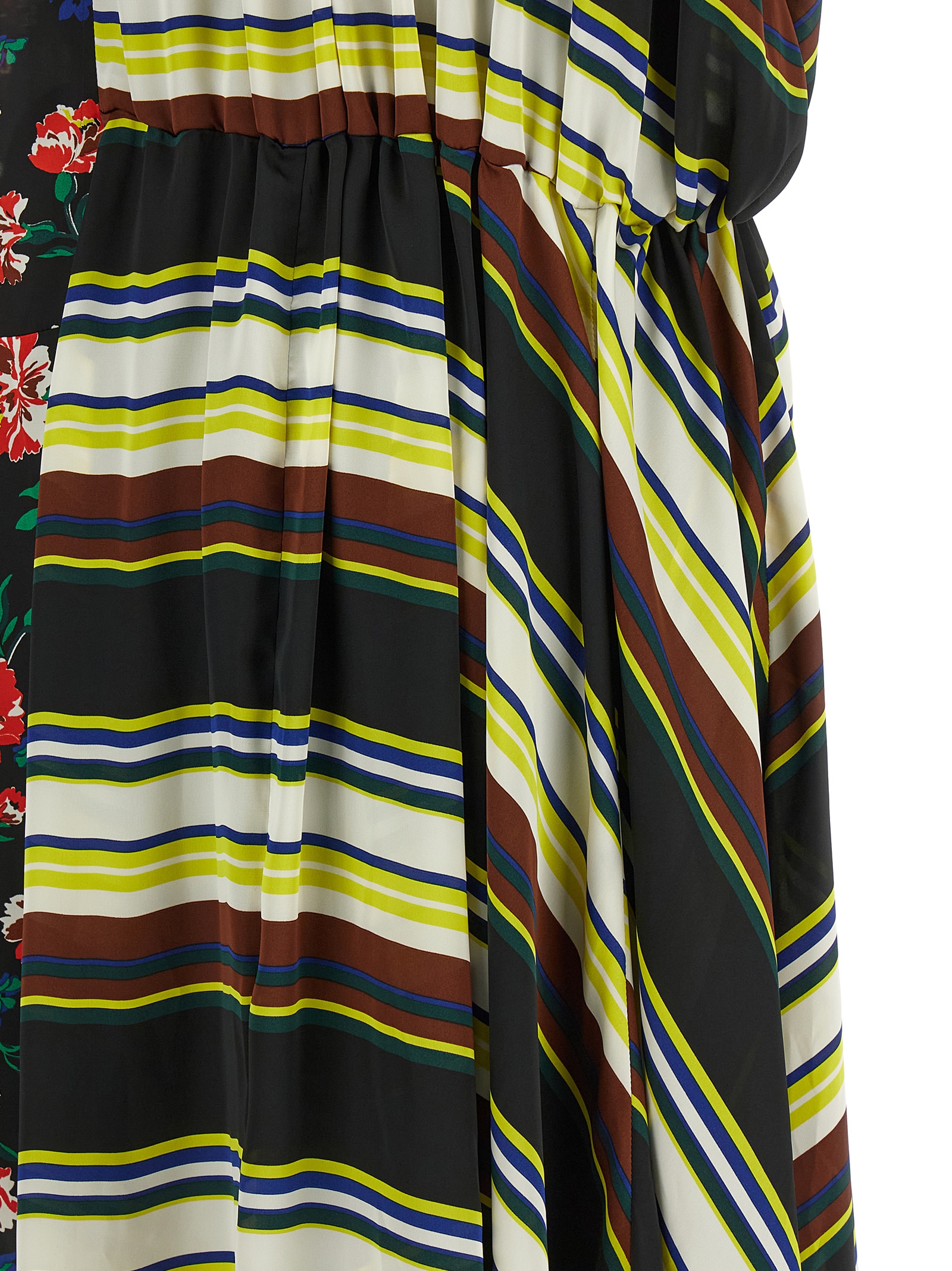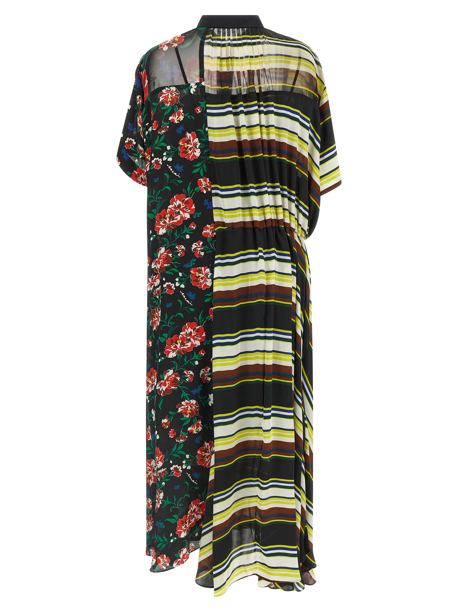 'Pattern Mix' сукня з тканини з сатиновим ефектом міді, двопанельна конструкція з різними візерунками, модель хемізьє, передня прихована застібка на ґудзики, широкі короткі рукави, шнурок на талії з тканини зі шкіряним ефектом, асиметричний поділ низу, знімний під'юбник з тонкими бретелями.