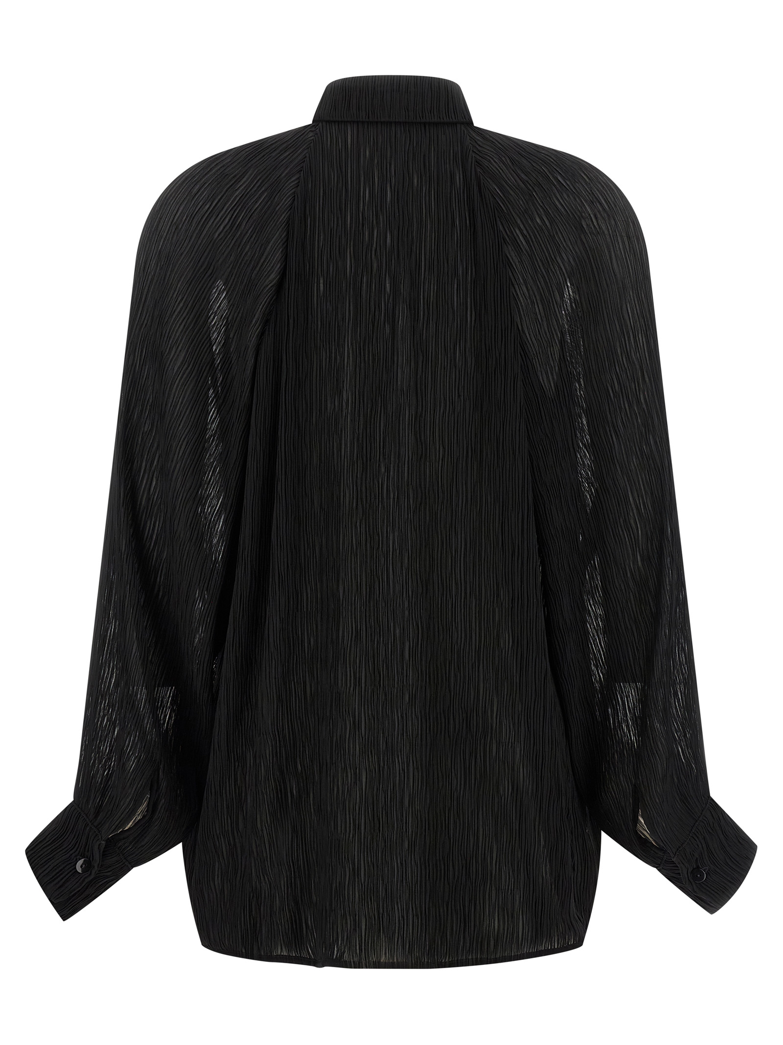 Легка сорочка з мікро плітки з плісировкою жоржет, передня застібка на ґудзики, довгі регланові рукави з манжетами.