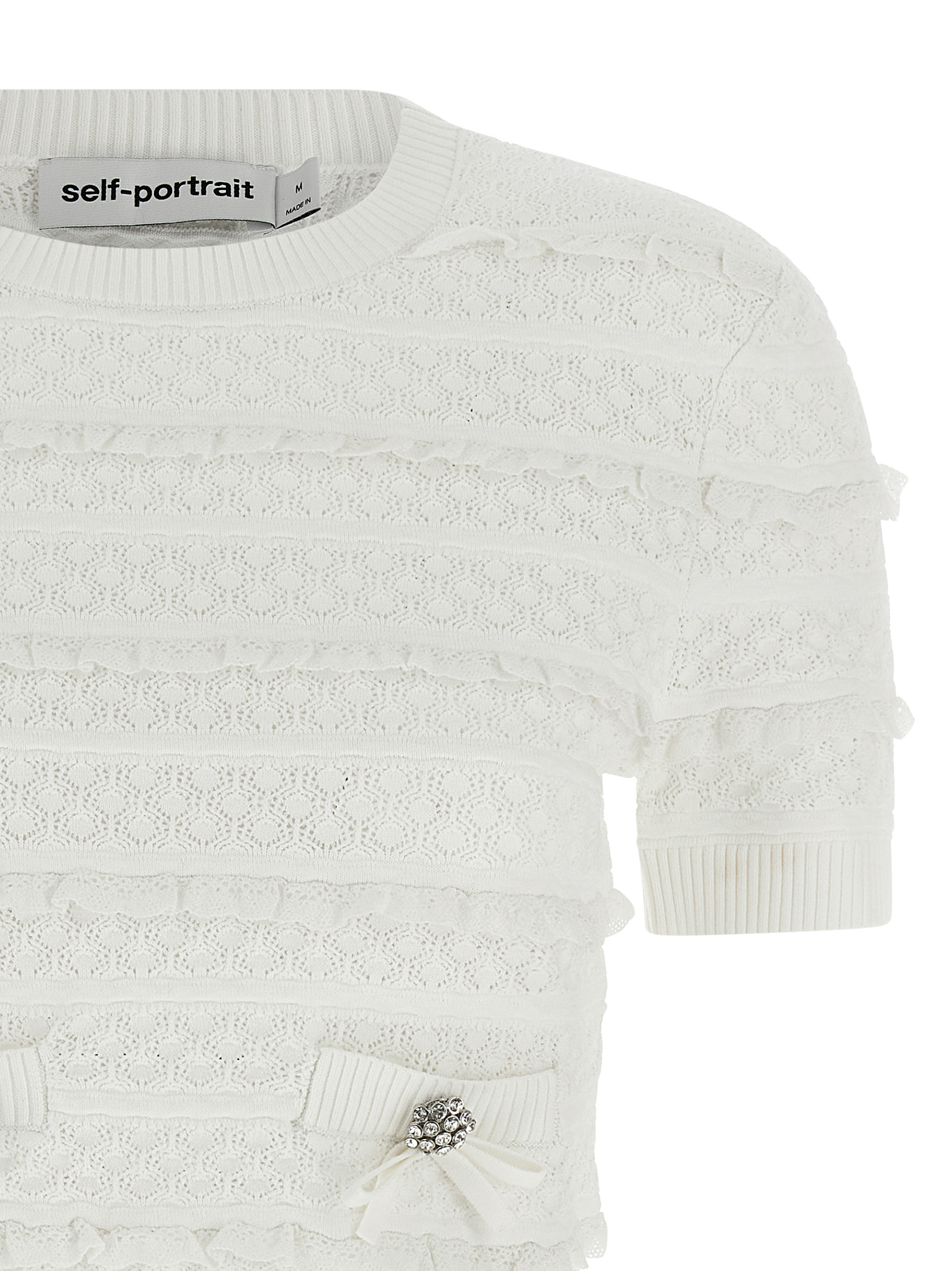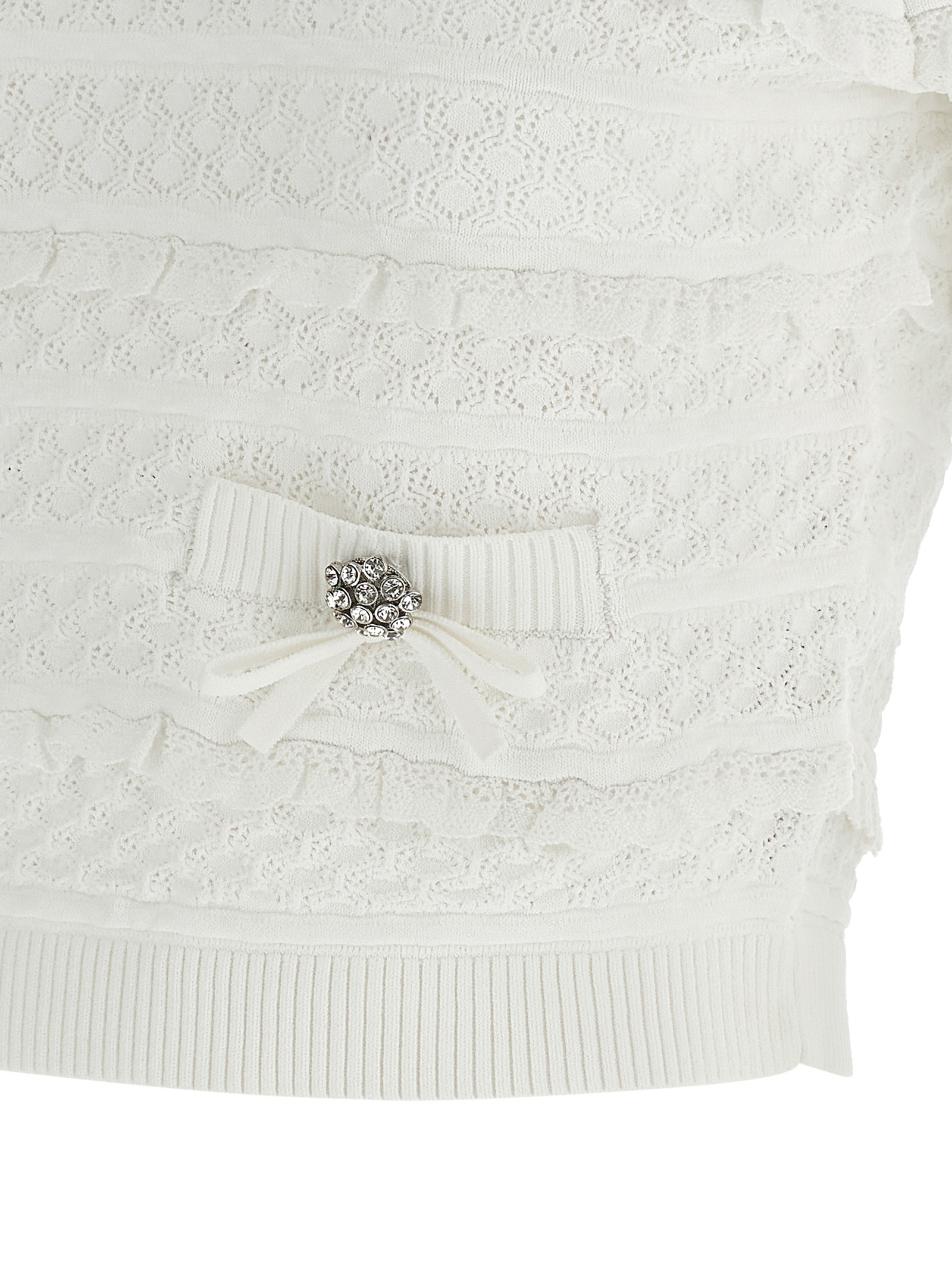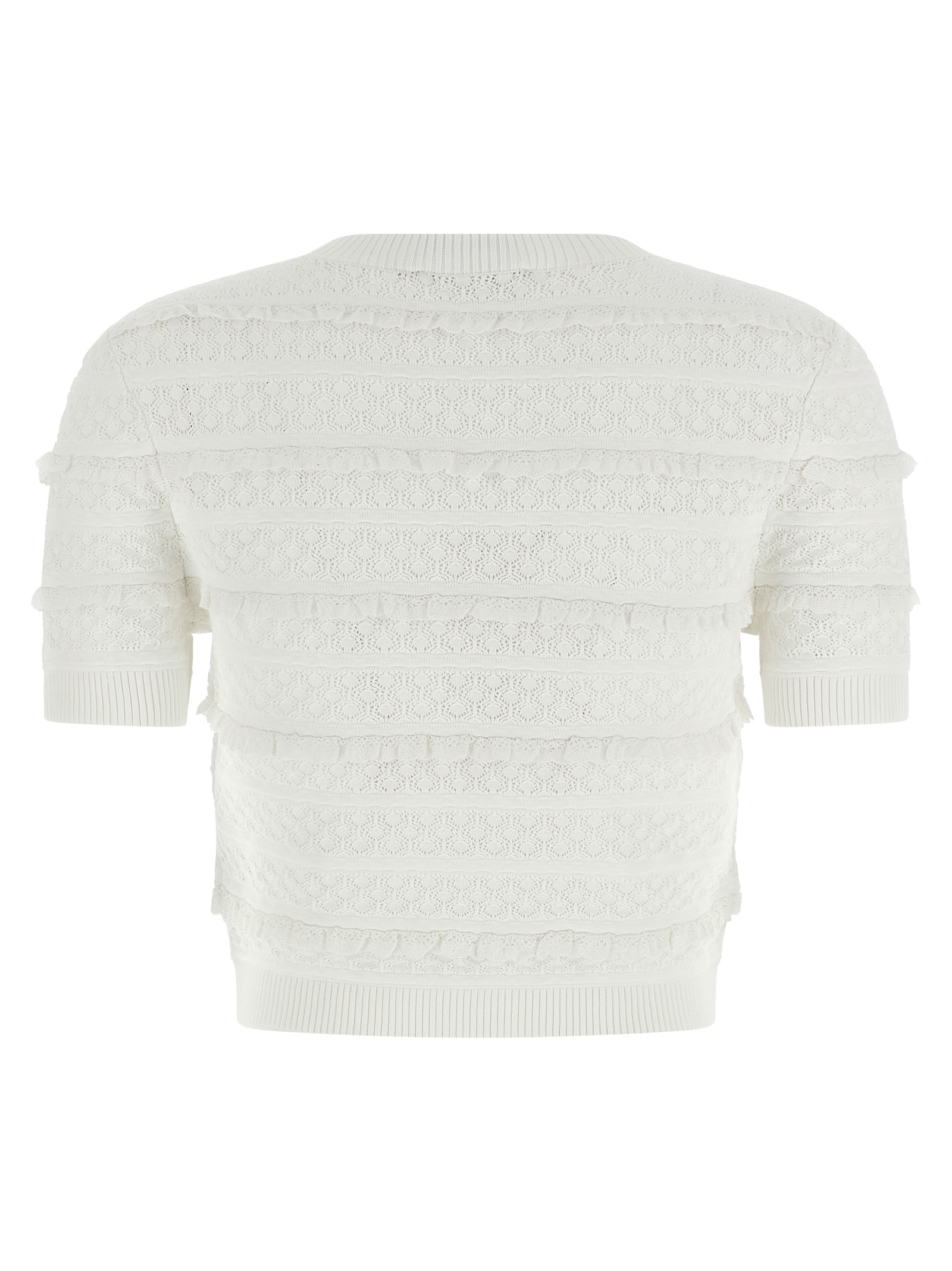 'Pointelle knit' топ з ажурною в'язкою з мереживними вставками, злегка укорочений виріз, передня деталь, кишені з декоративними ґудзиками, короткі рукави.