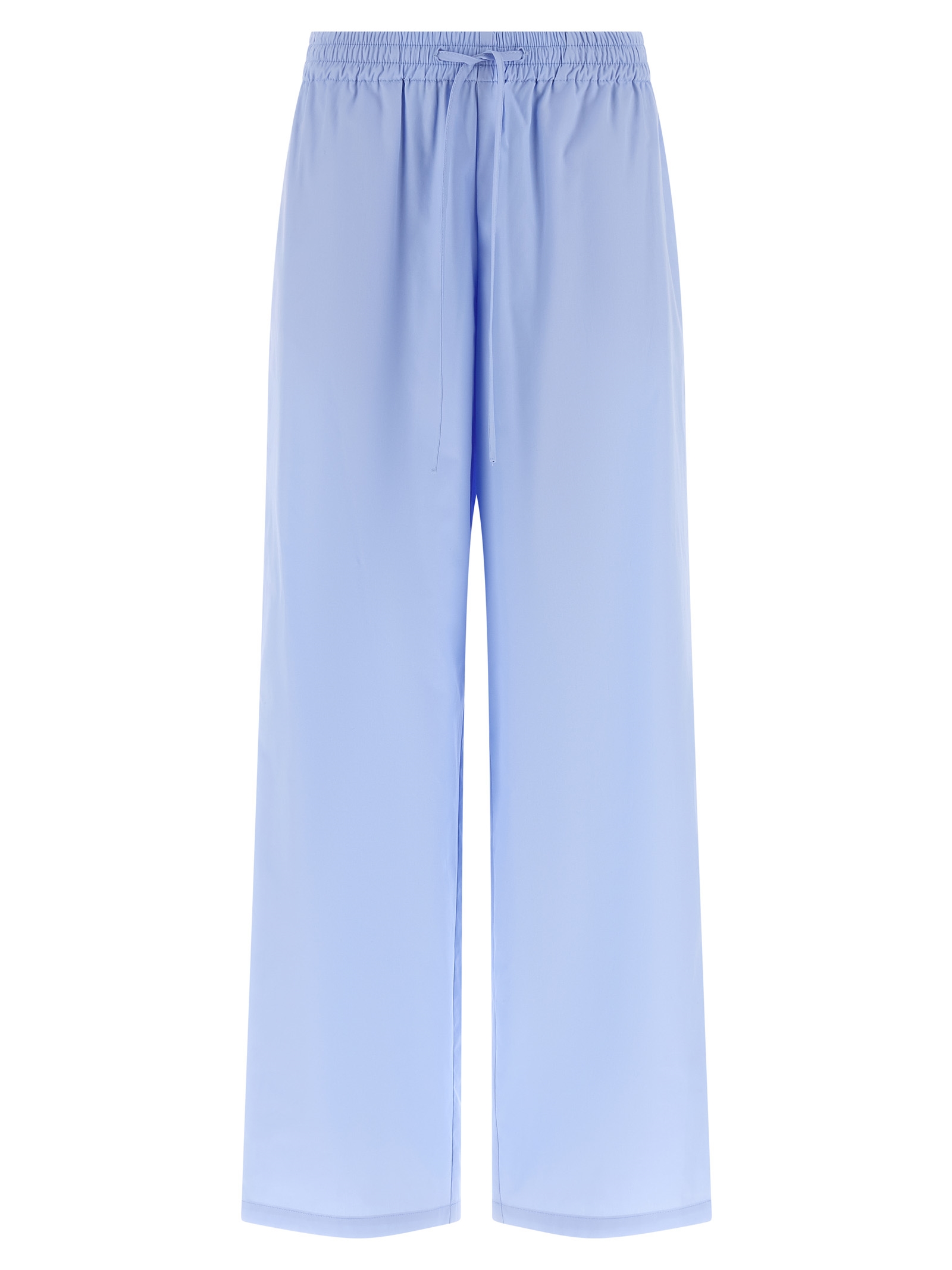 Штани-піжама з бавовняного попліну зі прямою і широкою штаниною, еластичний пояс і регульований шнурок, вертикальні бічні кишені.