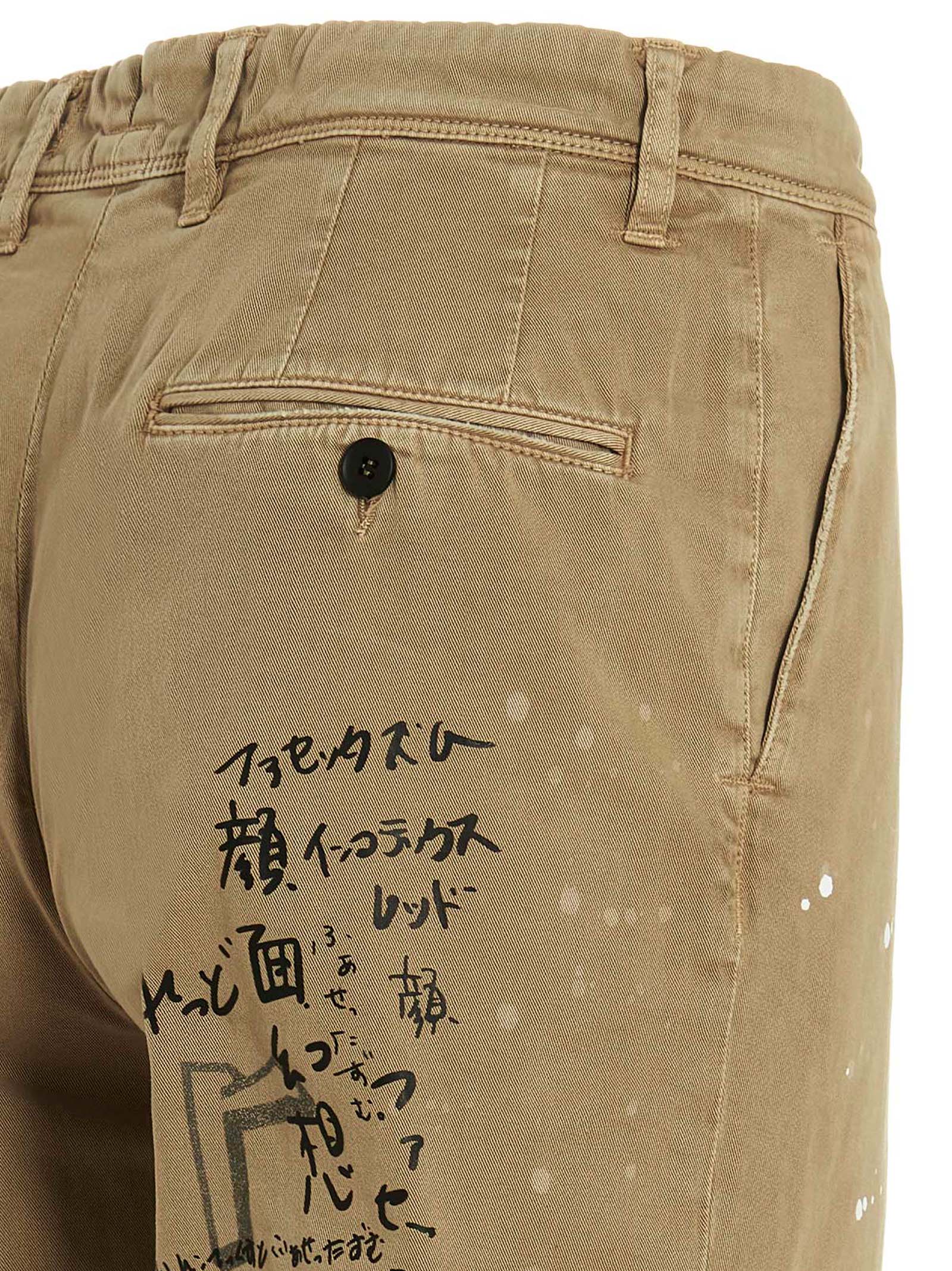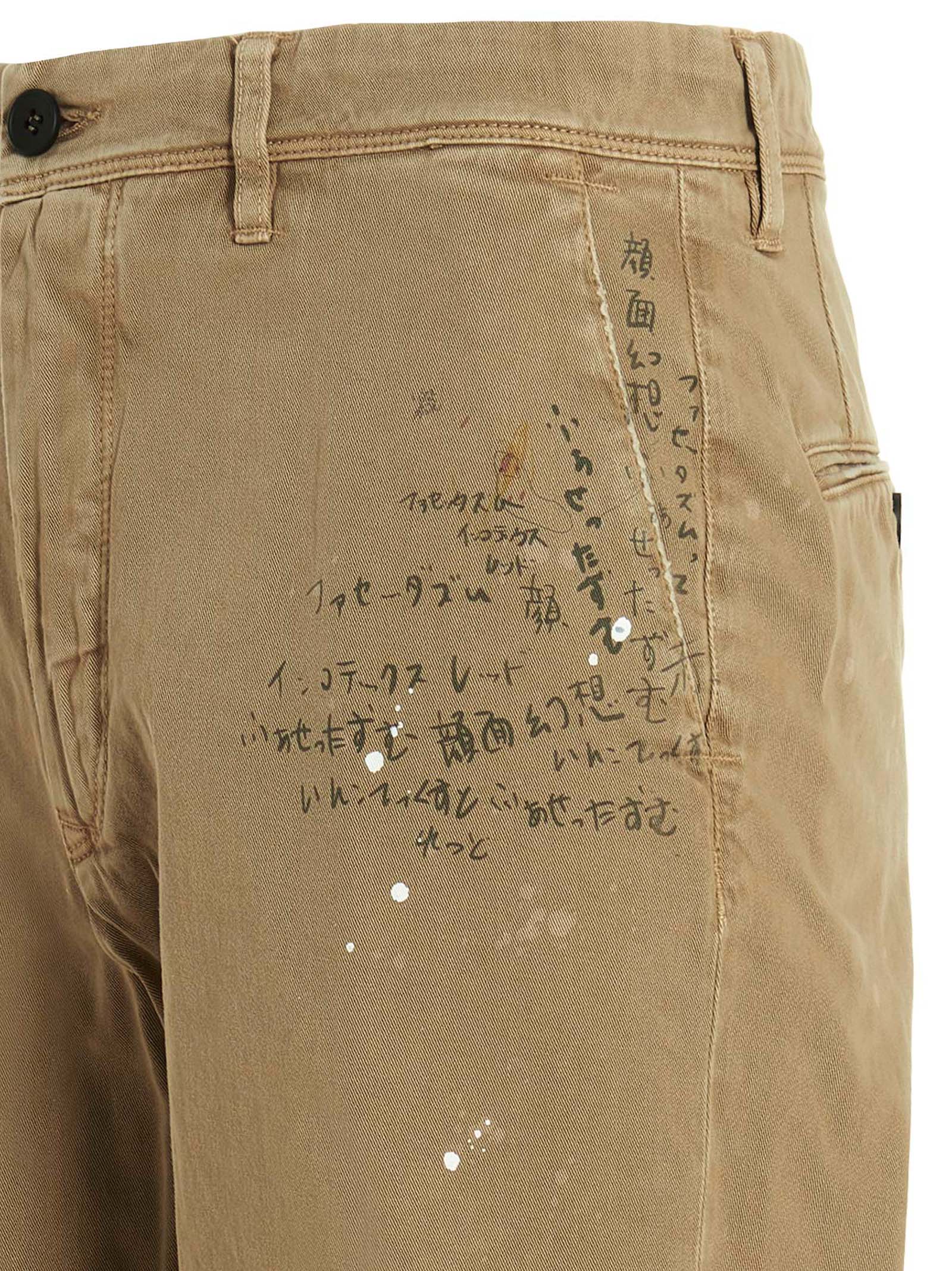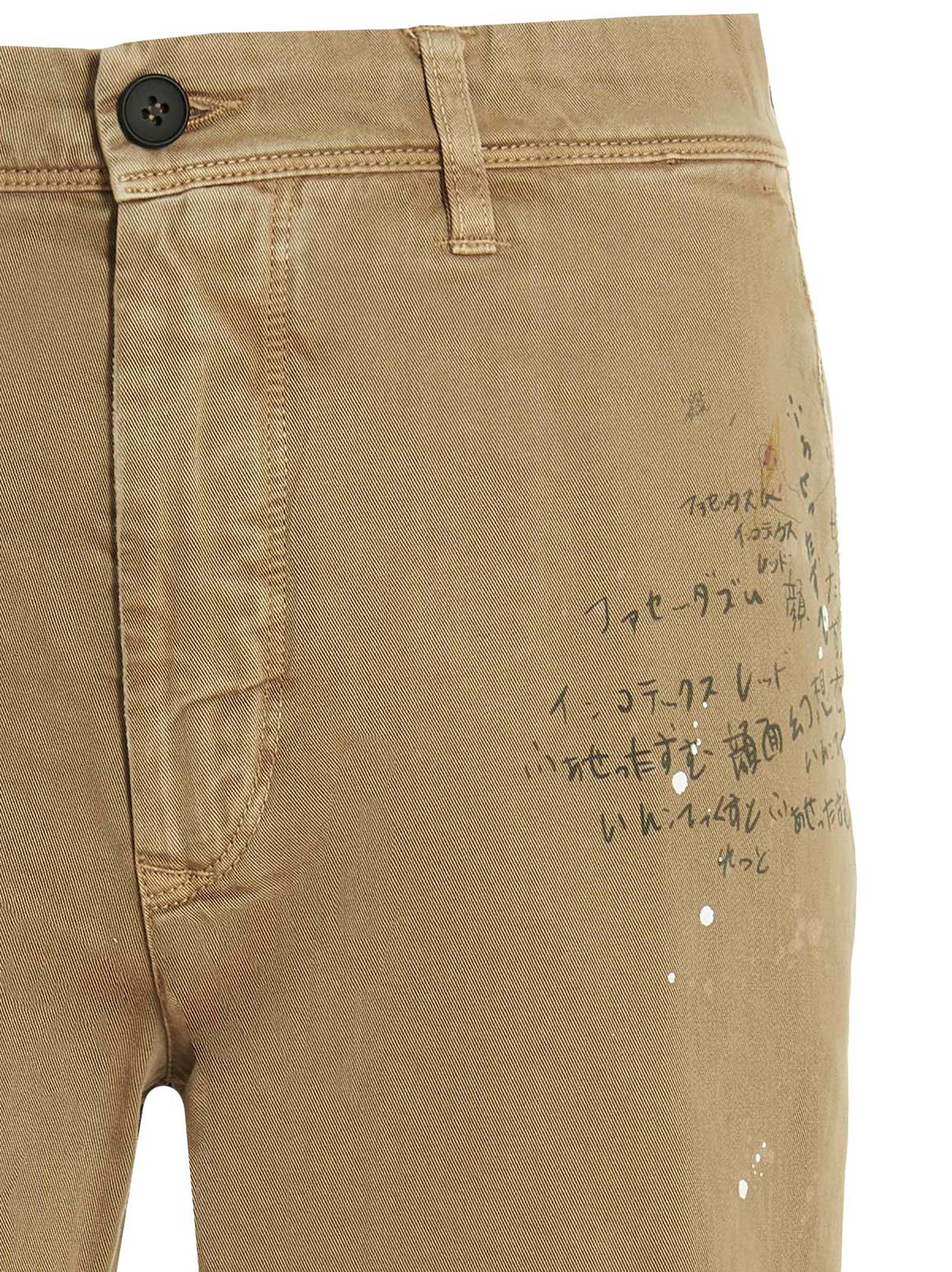 Бавовняні штани з загальним принтом, застібкою на блискавці та ґудзику, кишенями, ефектом зношеності та деталями з лакованої шкіри.