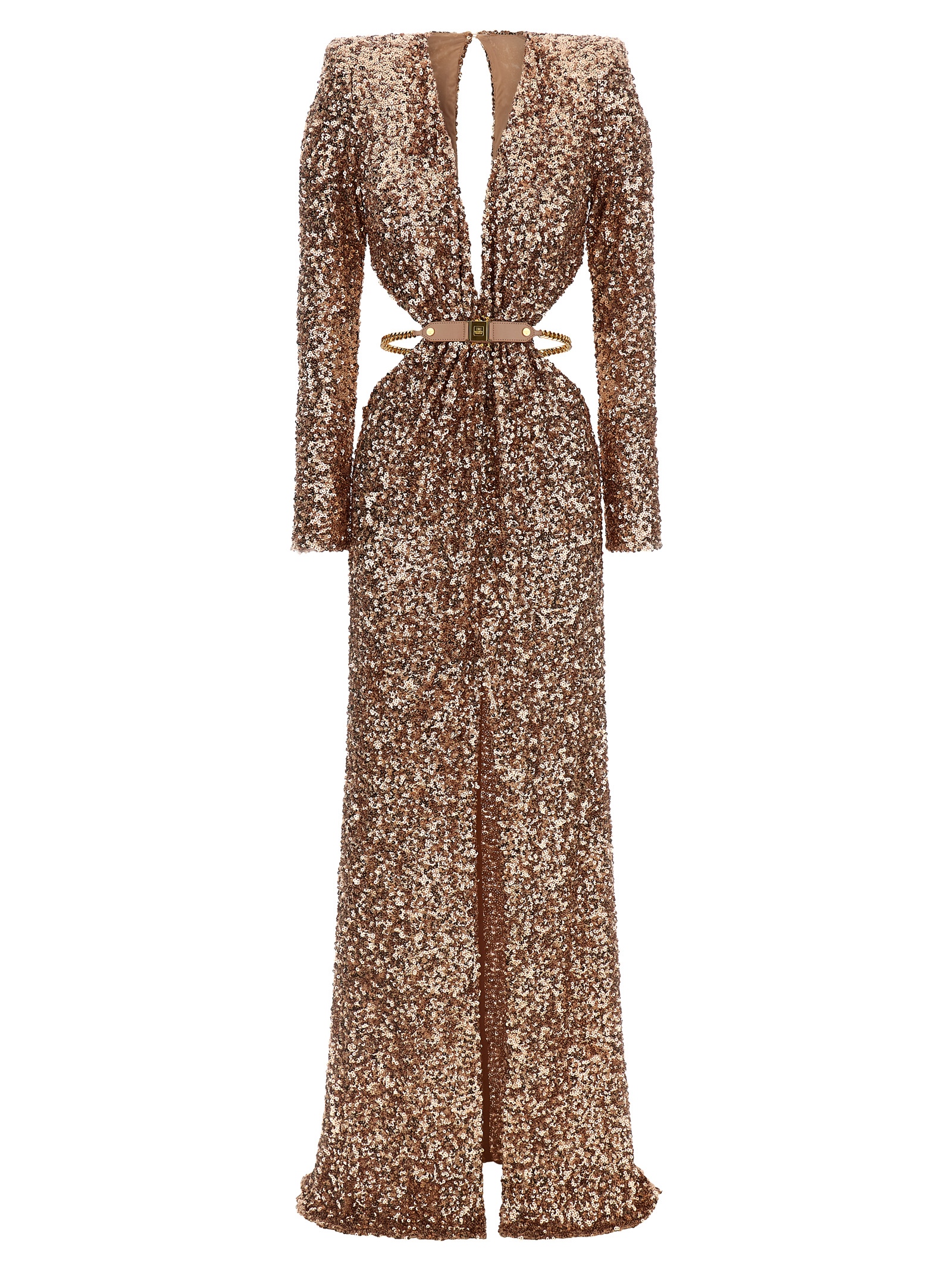 Сукня Red Carpet з усіма паєтками, широкий V-подібний виріз спереду, застібка на гудзиках ззаду з вирізом у вигляді сльози, підкладка, довгі рукави, бічні вирізи, ювелірний пояс з ланцюгом з знімним гравірованим логотипом, широкий розріз спереду, і в'язана підкладка.