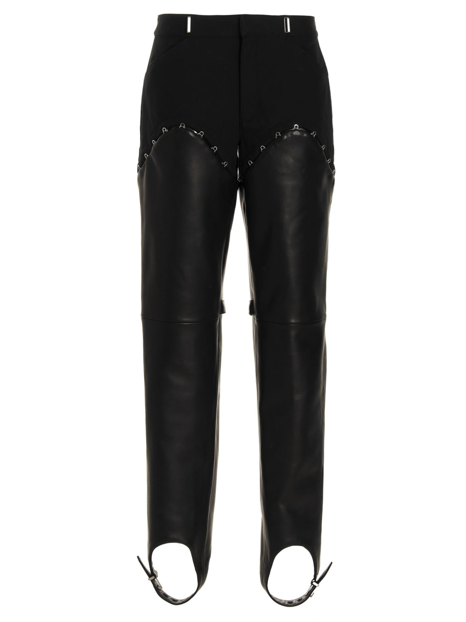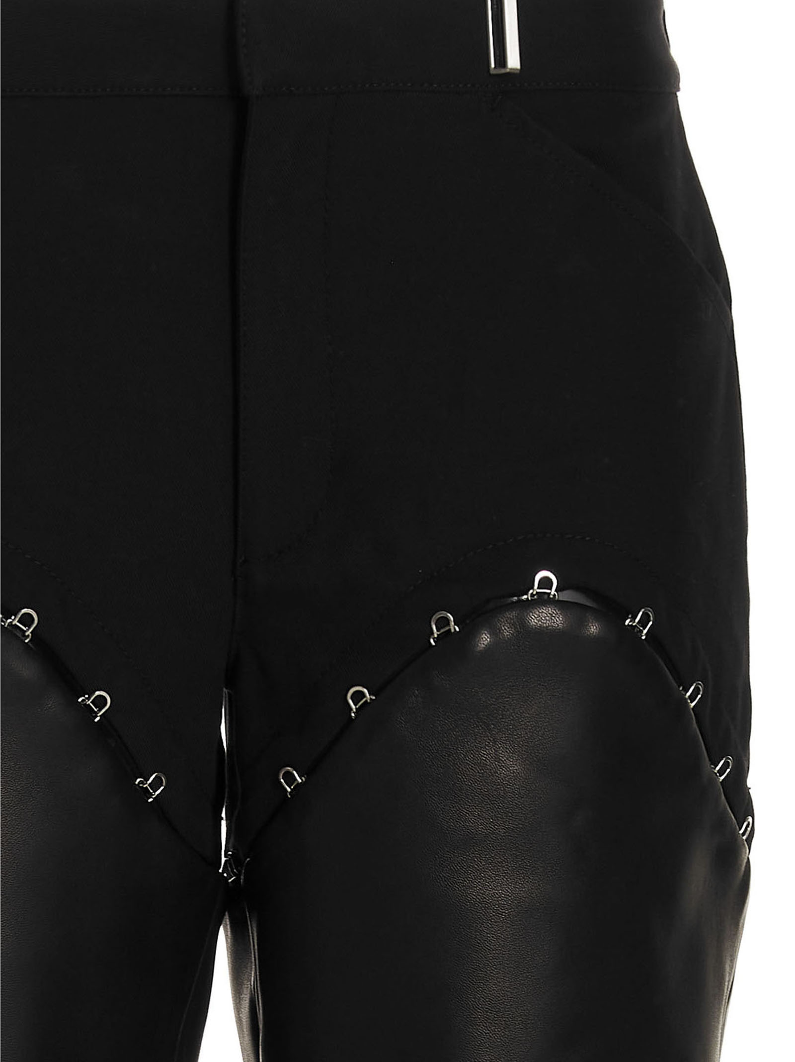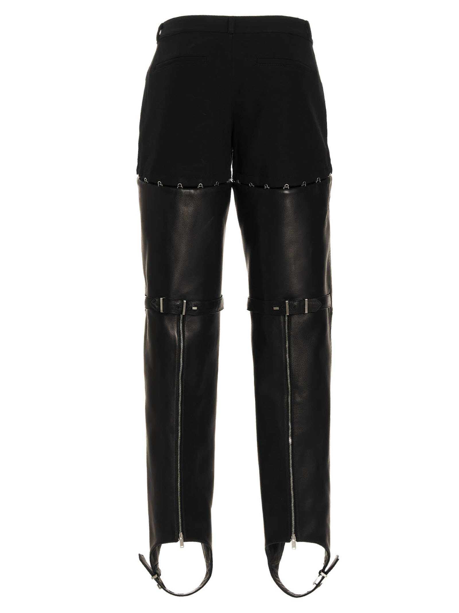 Бавовняні та шкіряні штани з від'ємним низом на гачку, високою талією, застібкою на гачку та гудзику.
