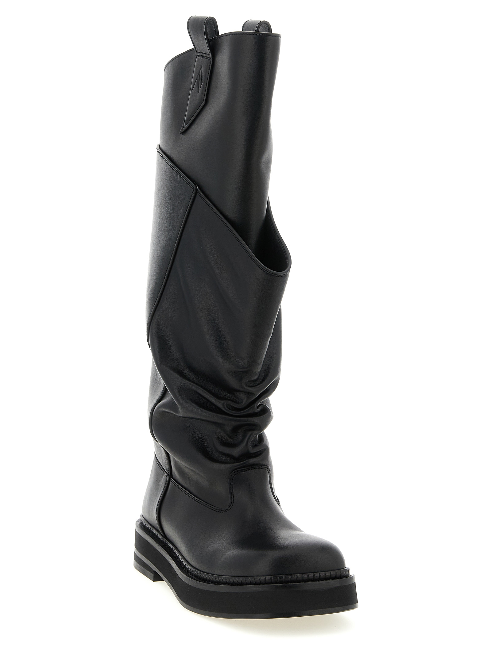'Robin Passeggiata' черевики з телячої шкіри, квадратний носок, модель Combat, двошарова конструкція з драпірованим передом, тиснений логотип на підборі, гумова підошва.