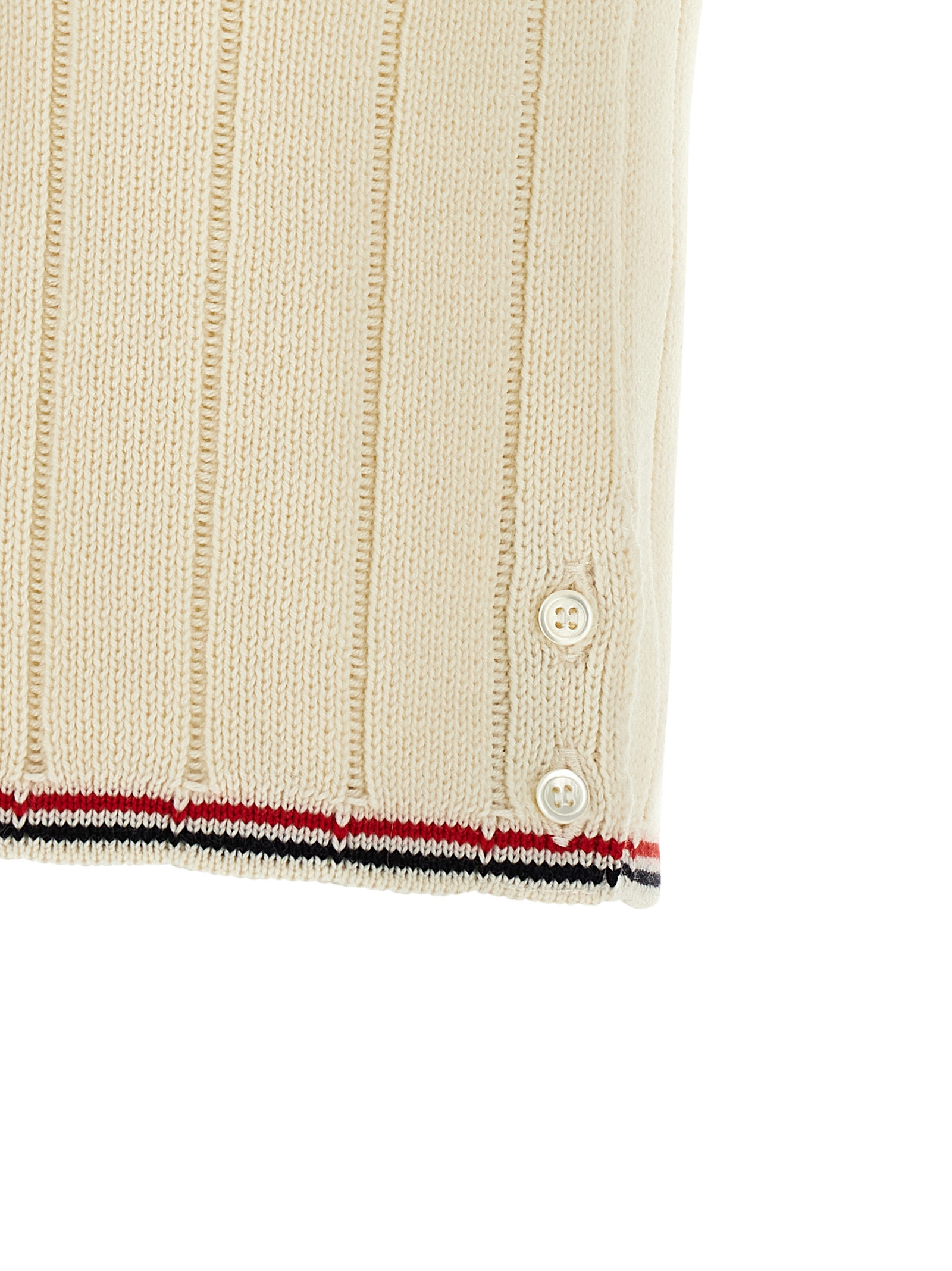 Жилет з повної голки з меріносової вовни, інтарсія RWB на подолі, V-подібний виріз, передня застібка на гудзики з стрічкою RWB, бічні розрізи з гудзиками.