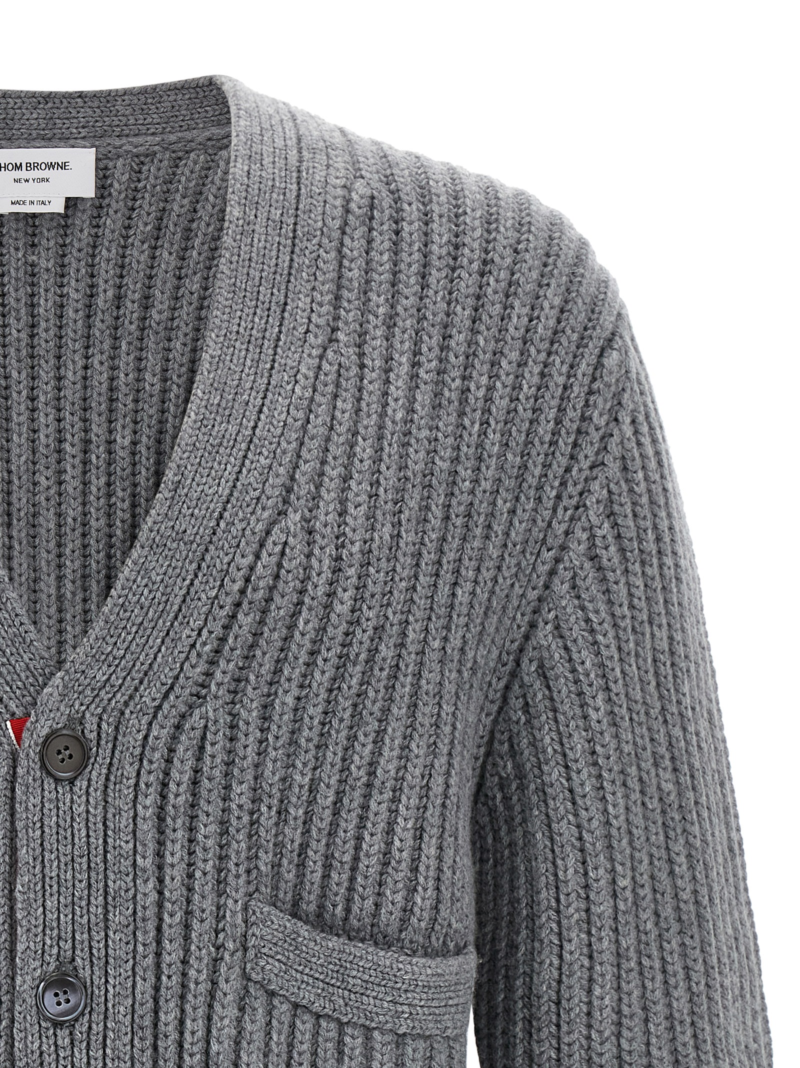 Рифлений кашеміровий кардиган з вшитою стрічкою RWB, V-подібний виріз, передня застібка на гудзиках, кишені, довгі рукави з манжетами, бічні розрізи з гудзиками.