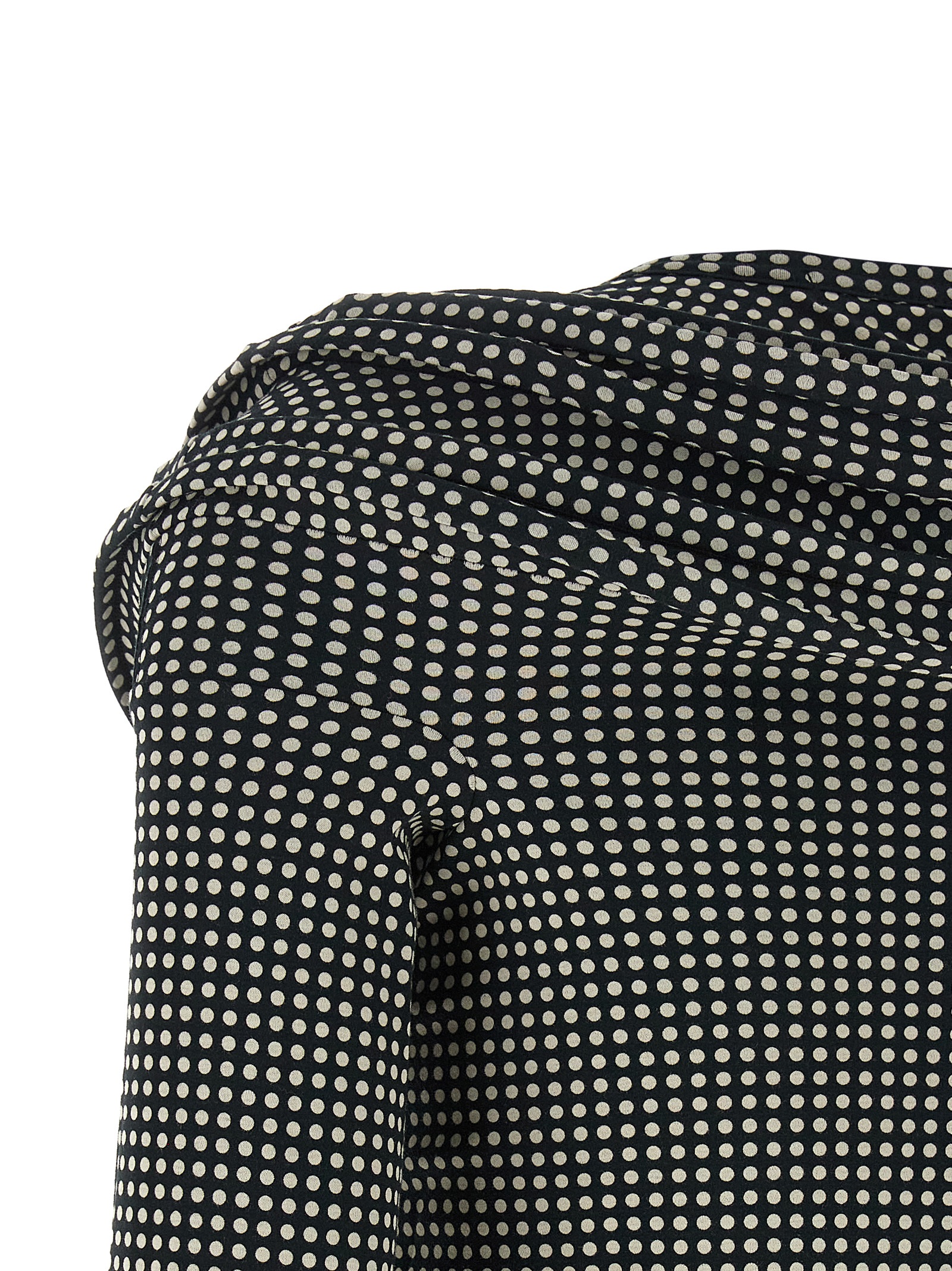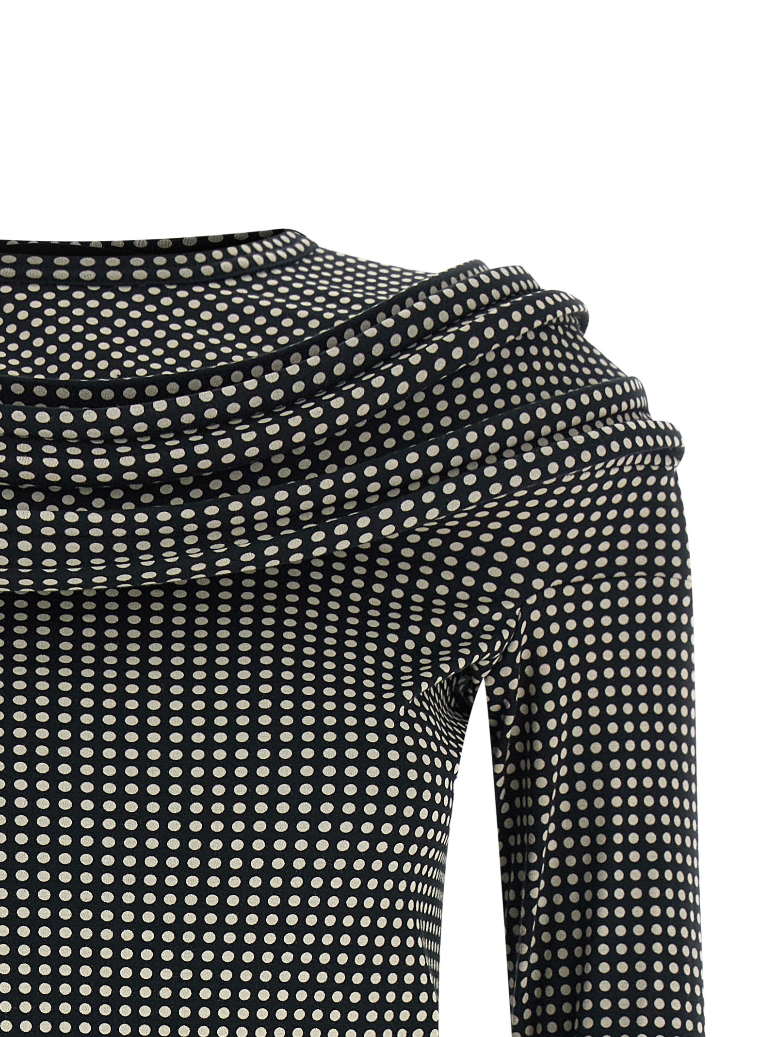 Скульптурна міні-сукня з легкого бавовняного джерсі з надтягненою еластичною гороховою візерунком, скульптурний верх з внутрішнім дротом, круглий виріз, довгі рукави.