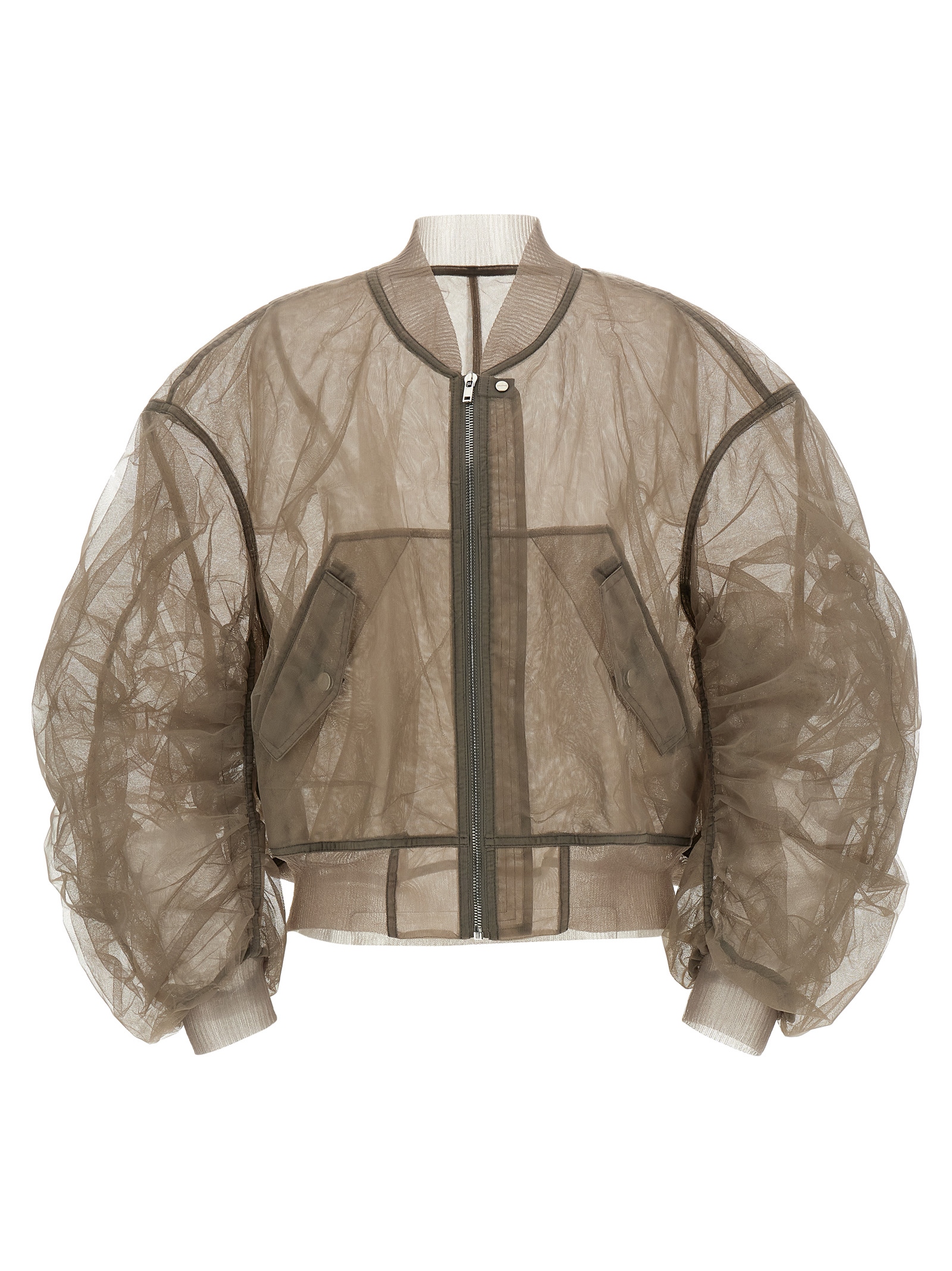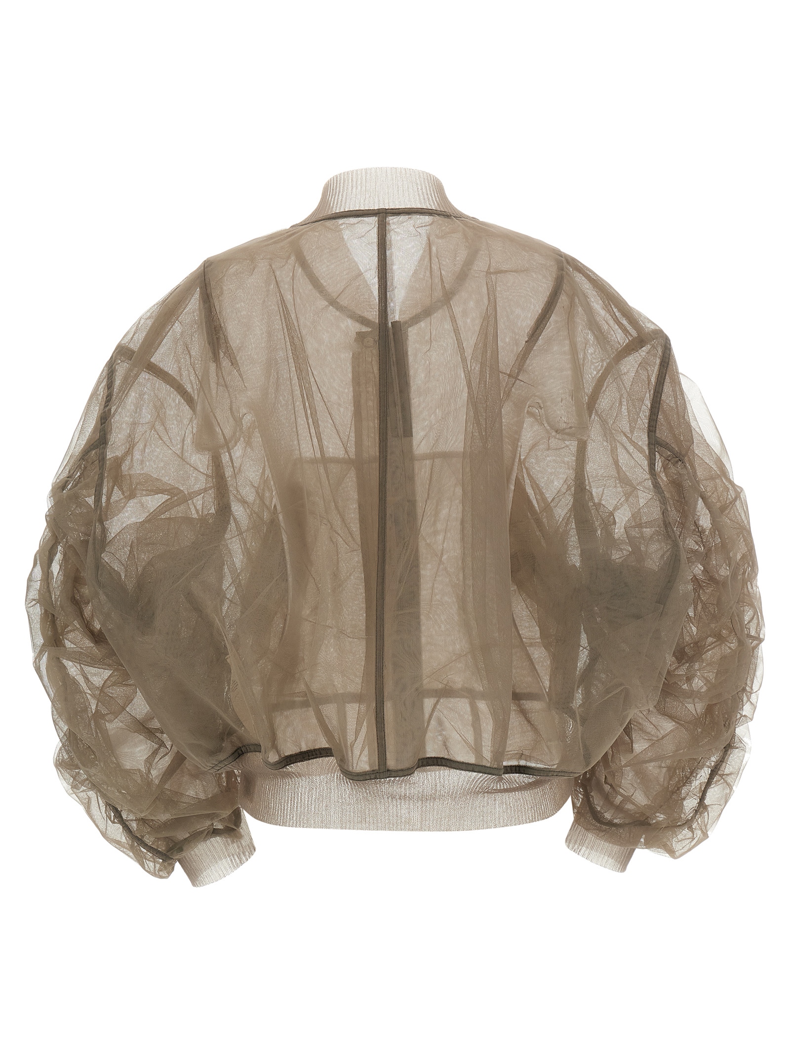 'Secchia Flight' бомбер із легкого багатошарового напівпрозорого нейлонового тюлю з жорсткою на дотик текстурою, з рельєфними трикотажними вставками, високий комір, передня застібка на блискавку, кишені, довгі зморщені рукави з манжетами та заниженим плечем, і резинка на низу. ЕКОЛОГІЧНИЙ: Виріб виготовлений із перероблених матеріалів.