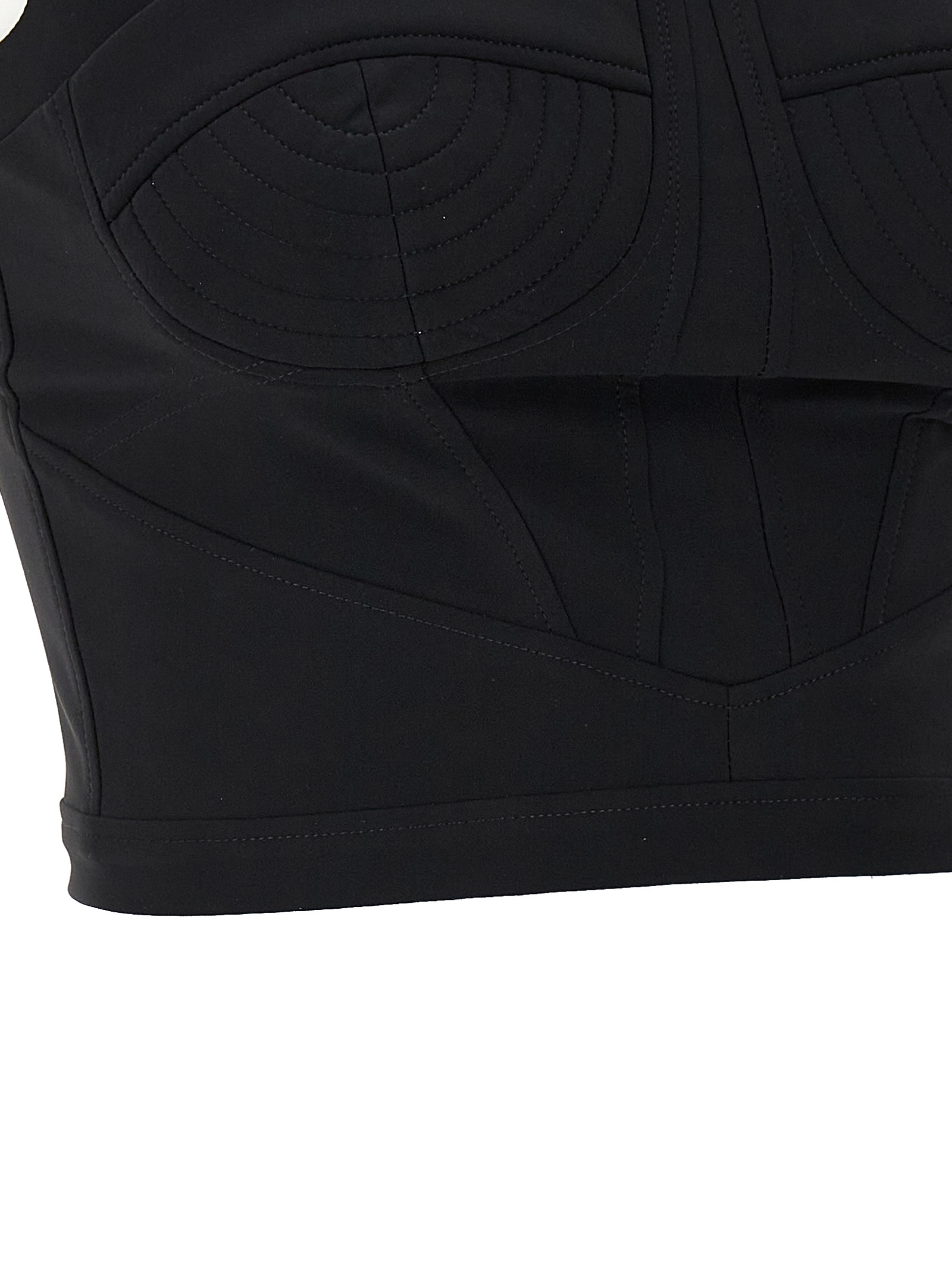 Топ з еластичної тканини, форма бюст'є, тонкі бретелі, шнурівка на шиї, застібка на блискавці ззаду.