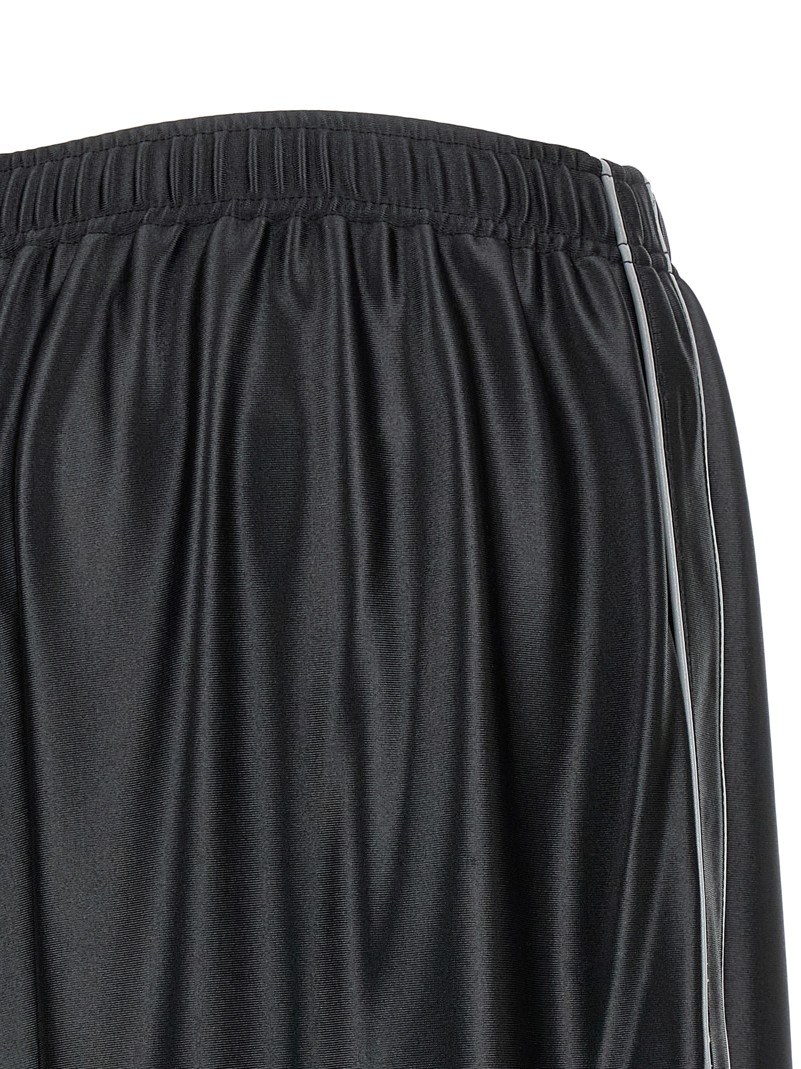 Спортивні штани з сатиновим ефектом, передній втиснений логотип, відбиваючі асиметричні бічні смуги, середня талія, дуже широкий крій, еластичний пояс зі шнурком, кишені.