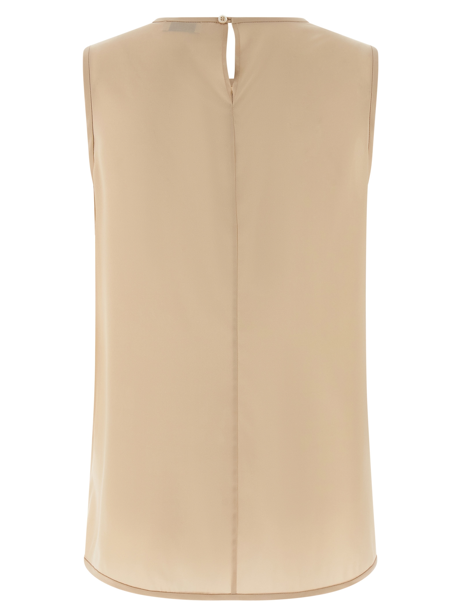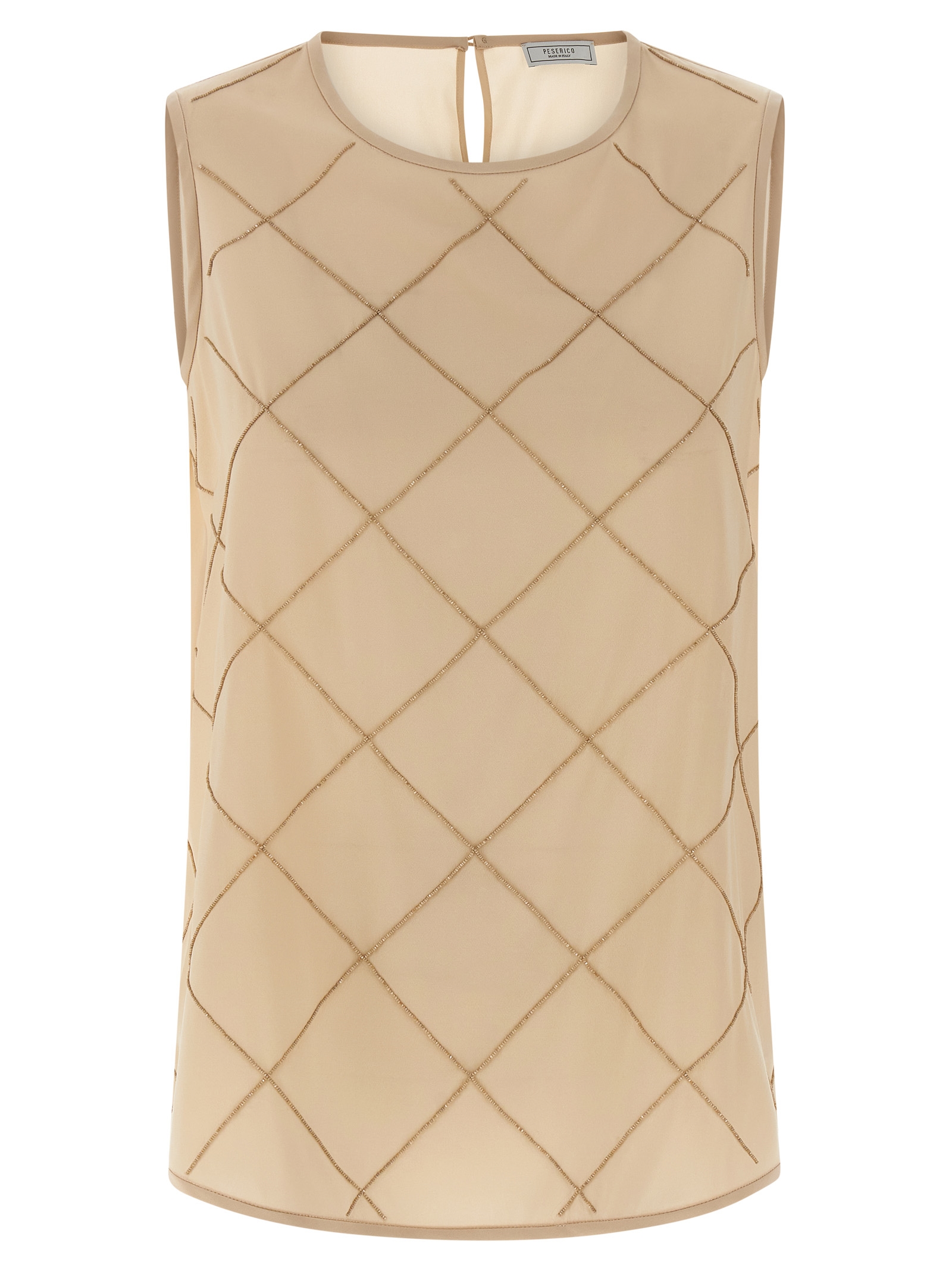 Шовковий топ з крепу де шін з геометричними аплікаціями з бісеру спереду, круглим вирізом, задньою застібкою на гудзиках з вирізом у формі краплі.