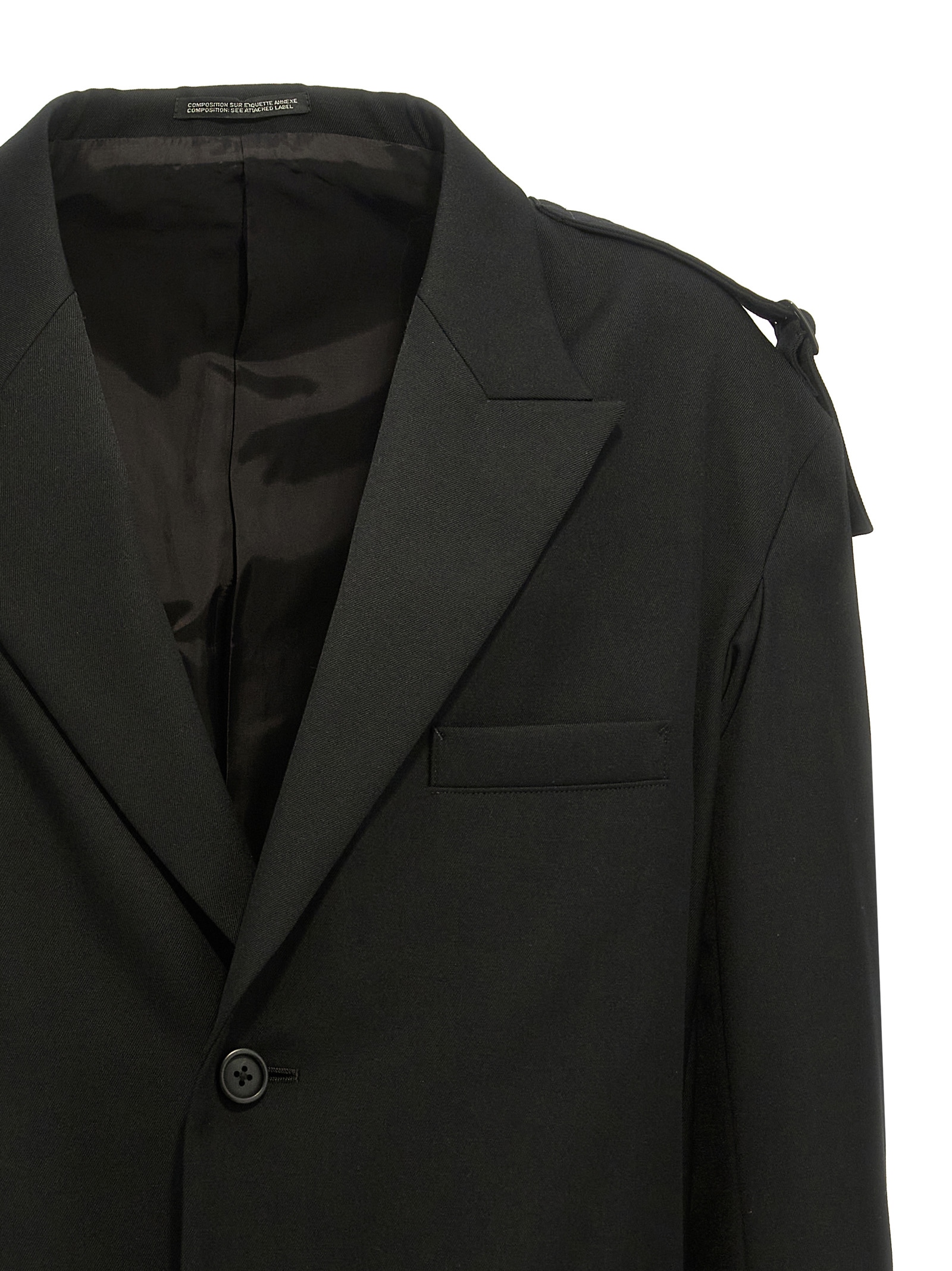 Однобортний блейзер з вовни з деталлю ремінця на плечах, застібка на гудзиках, кишені, довгі рукави, розрізи ззаду.