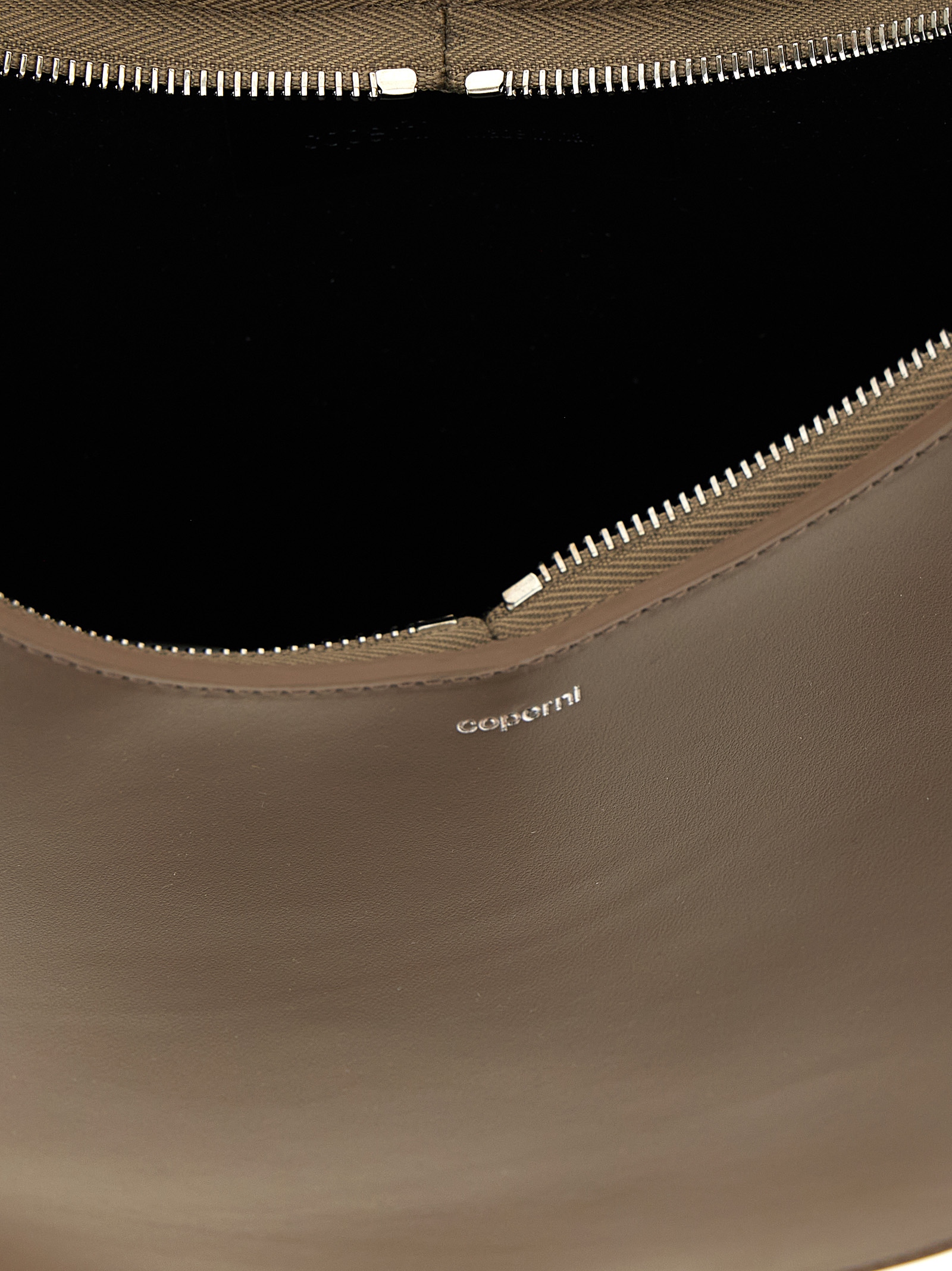 Середня 'Soft Swipe' сумка через плече з гладкої шкіри, форма натхненна іконкою 'провести для розблокування' iPhone, передній тиснений логотип, верхня застібка на блискавці, бічна вставка.