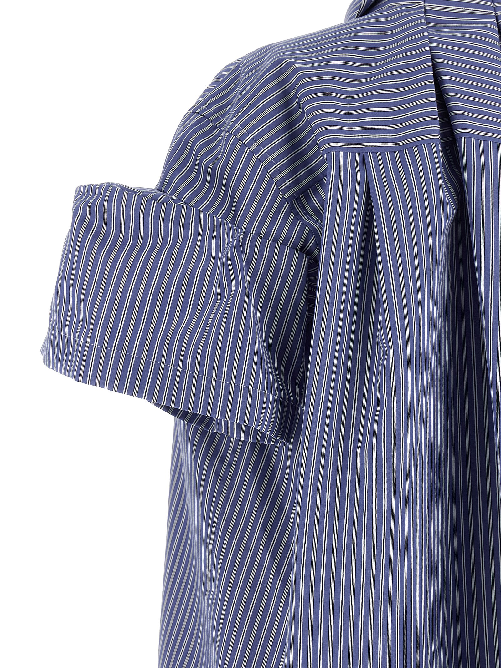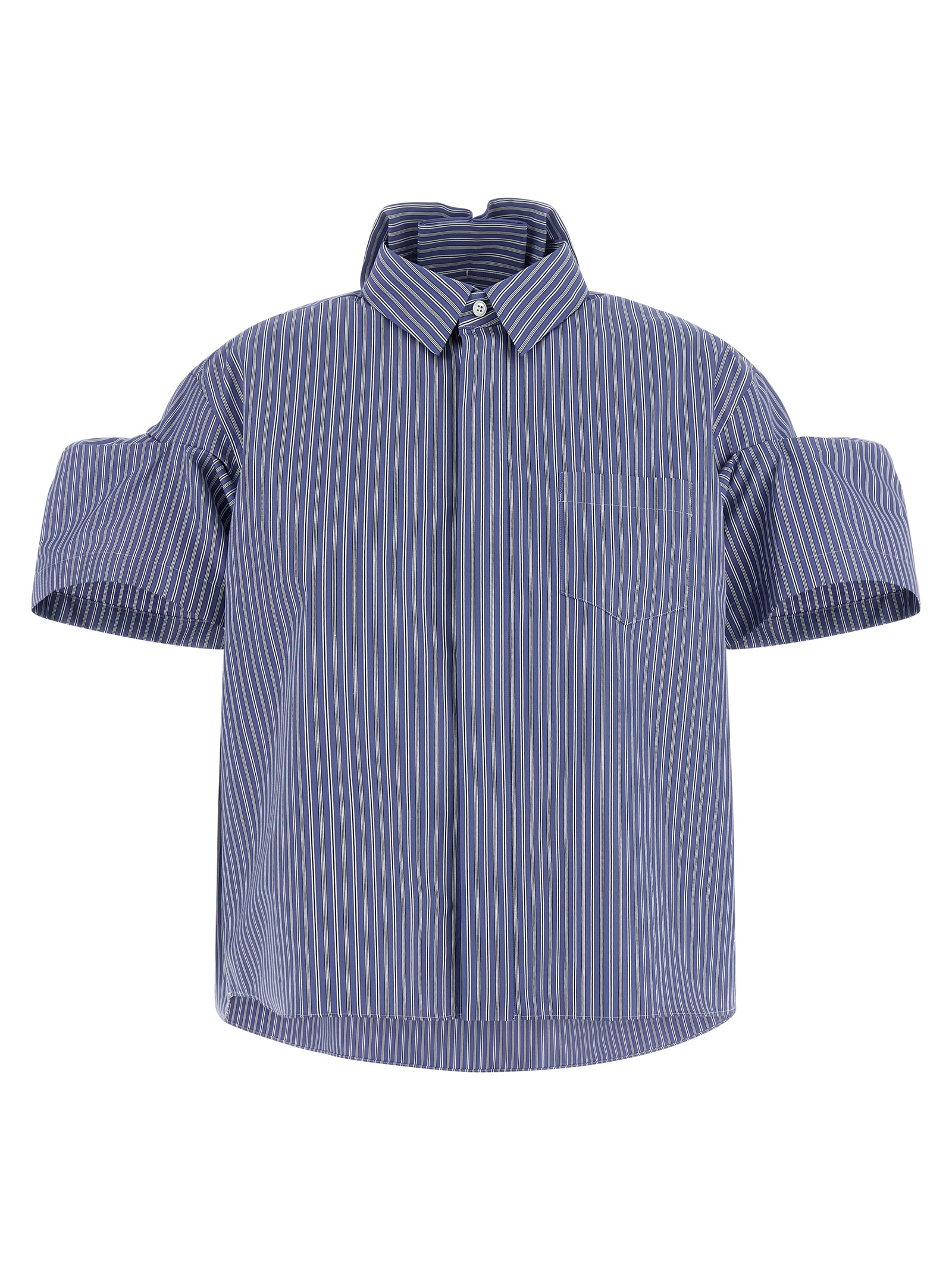 Смугаста сорочка з бавовняного попліну, нагрудна кишеня, потайна передня застібка на ґудзики, короткі рукави з рельєфною вставкою, закруглений та асиметричний поділ.