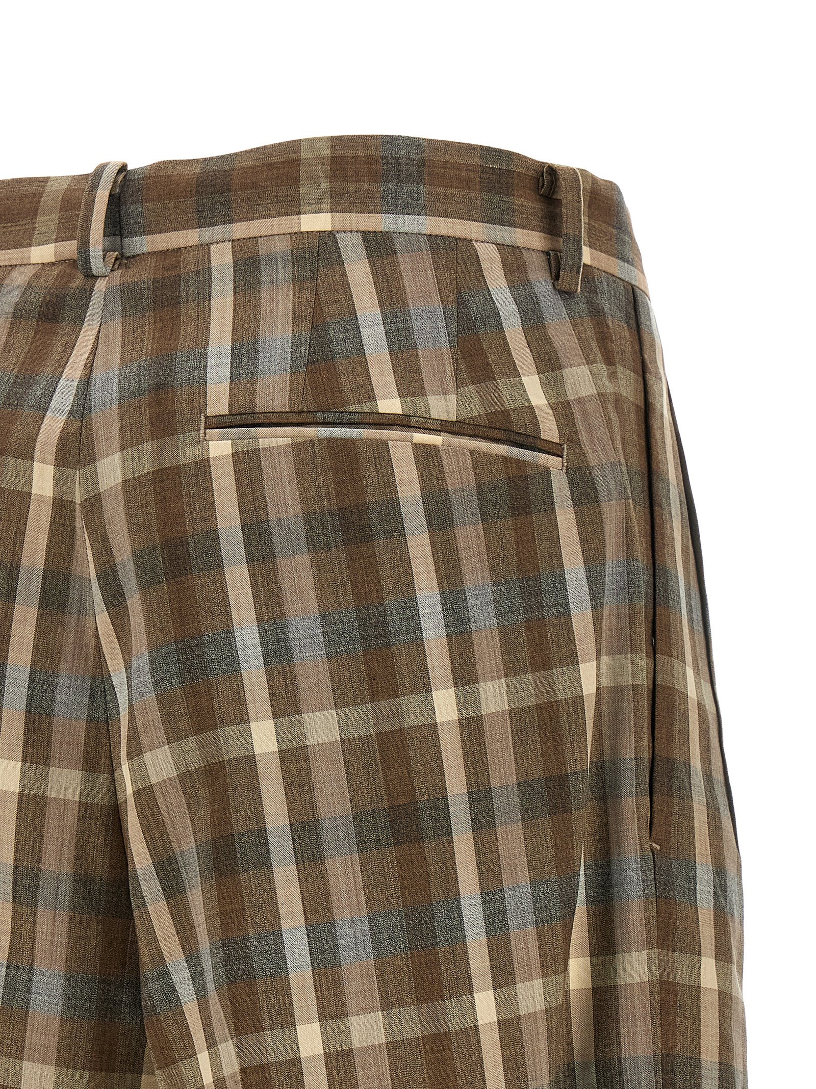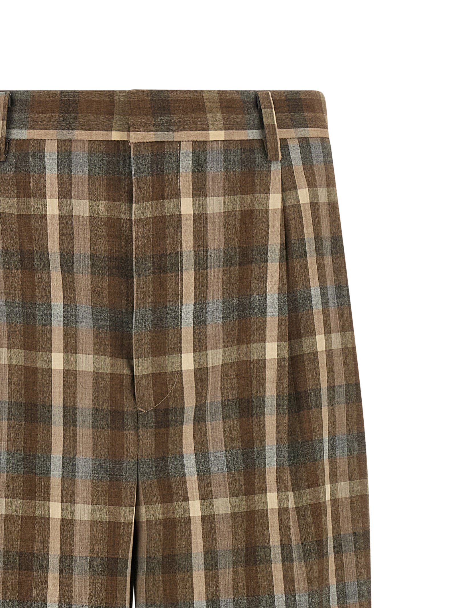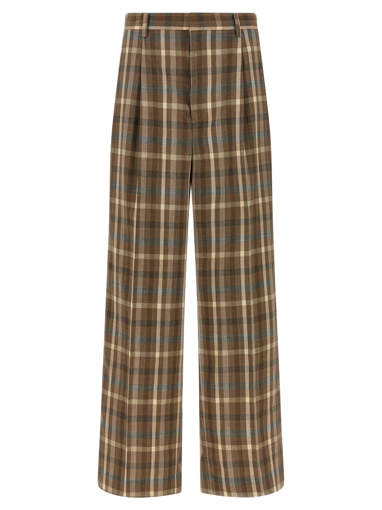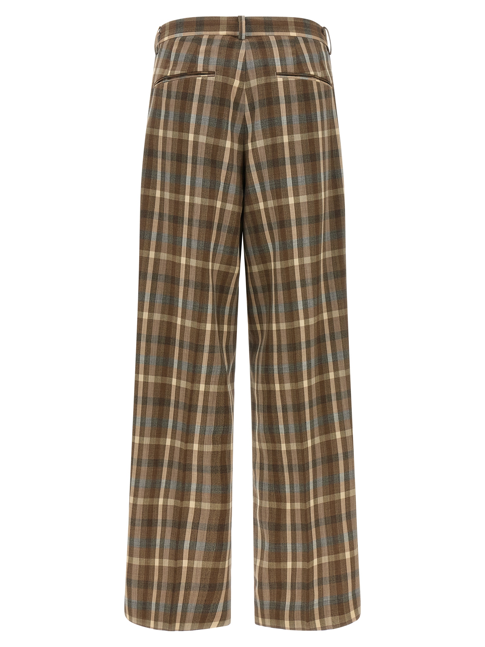 Тропічні вовняні штани, виготовлені з тонких пряж Super 130's, меланжеві багатобарвні нитки та тканини в клітинку з панелями, стрійні виточки (пінс), витягнута складка, широкий прямий крій штанини, передня застібка на блискавку, гачок та ґудзик, передні «френч» кишені, задні кокеткові кишені.
