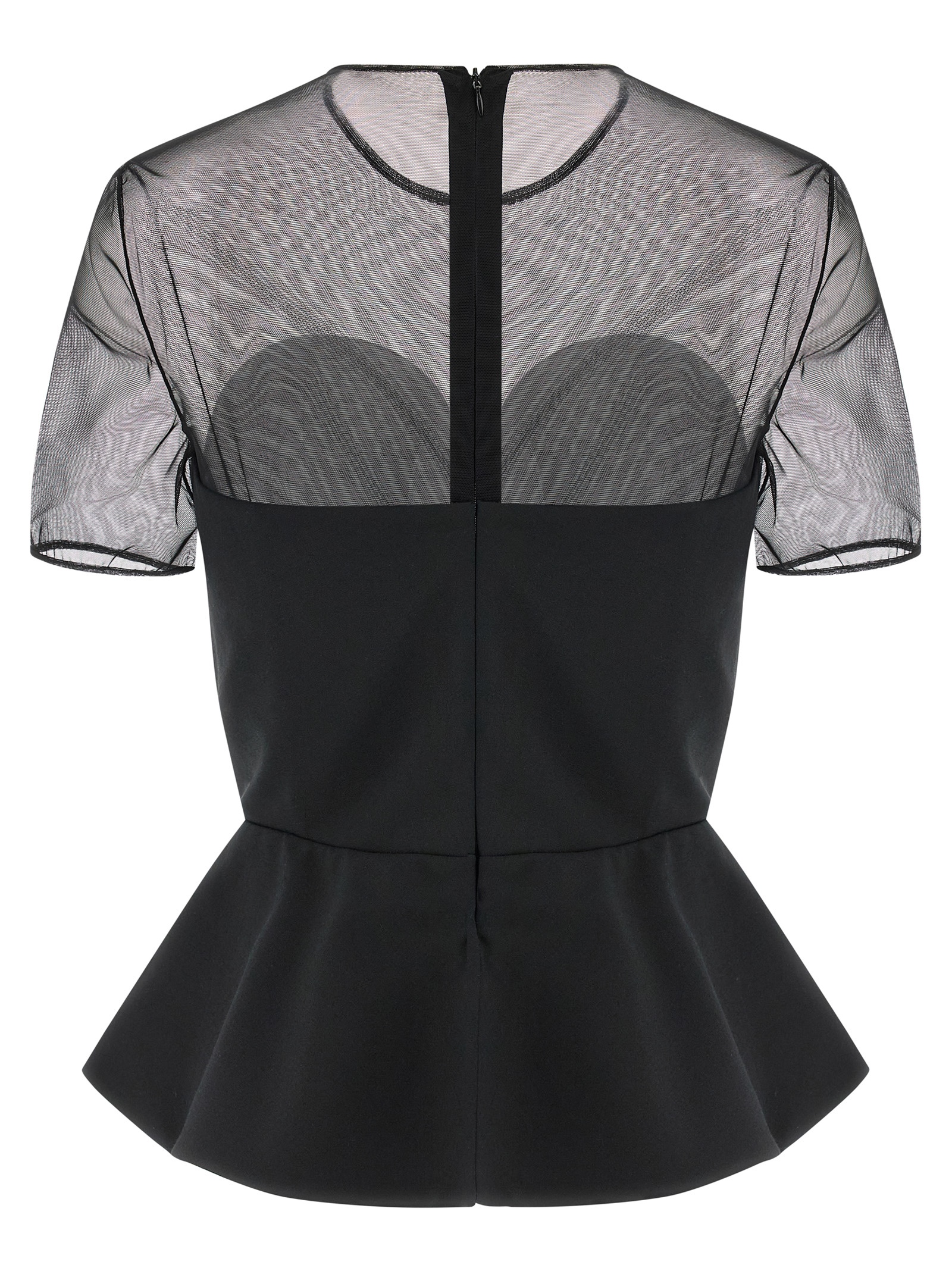 'Tailored Bustier With Sheer Neckline' топ, що складається з напівпрозорого тюлю, круглої горловини, коротких рукавів, застібки на спині та нижньої частини з прохолодної тон в тон вовни, накладних формованих чашок, пеплуму на талії з переднім розрізом.