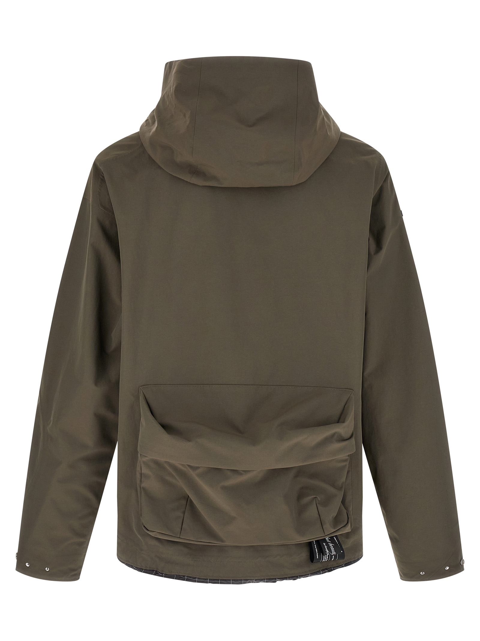 Парка з вітронепроникної та водонепроникної технічної тканини, капюшон, великі передні накладні кишені з клапанами, термозапаяні внутрішні шви, задня накладна кишеня, без підкладки з контрастними профілями на низу, застібка спереду на блискавку та кнопки, бічні вбудовані кишені на блискавці, довгі рукави з регульованими манжетами на кнопках.
