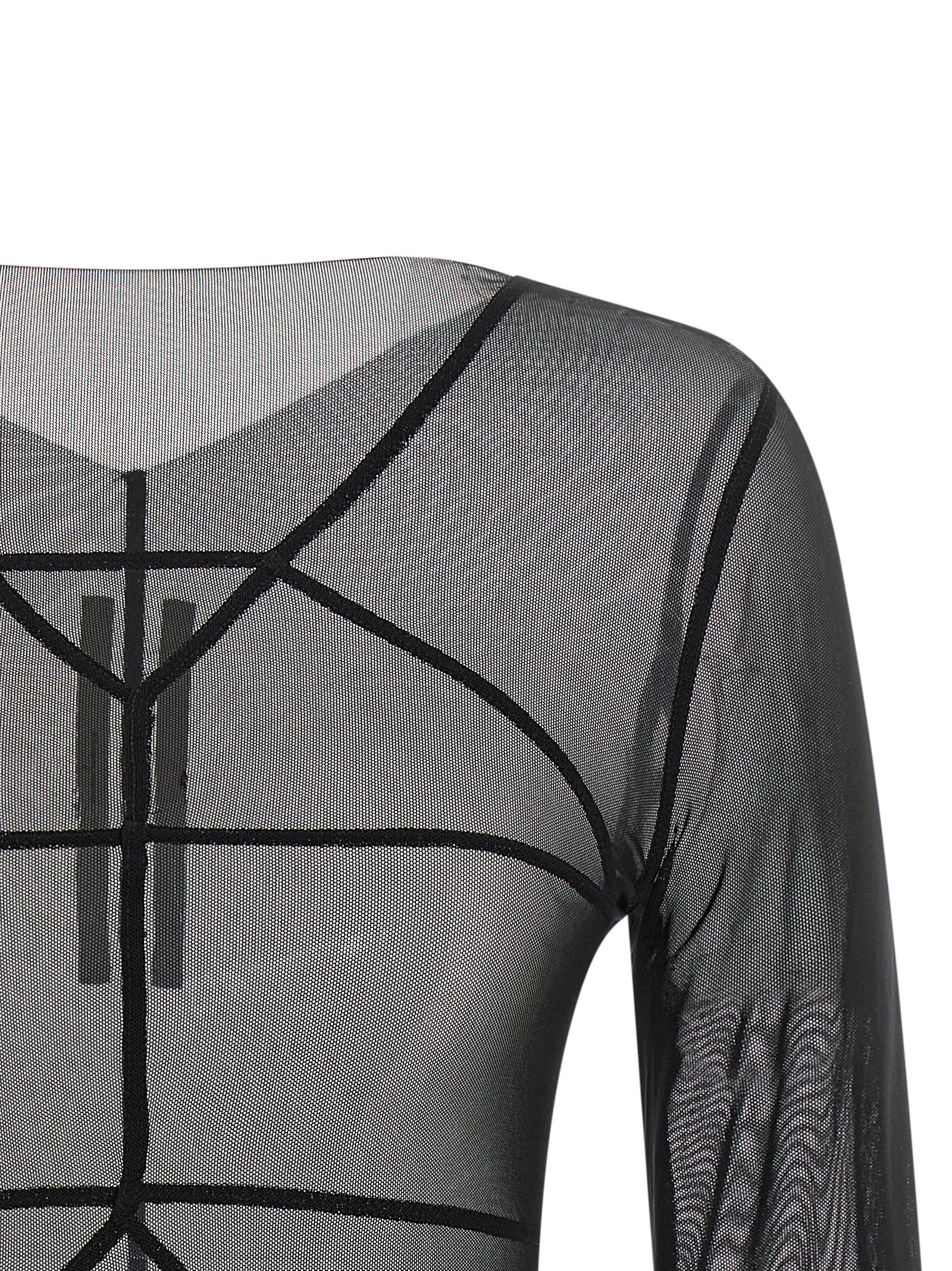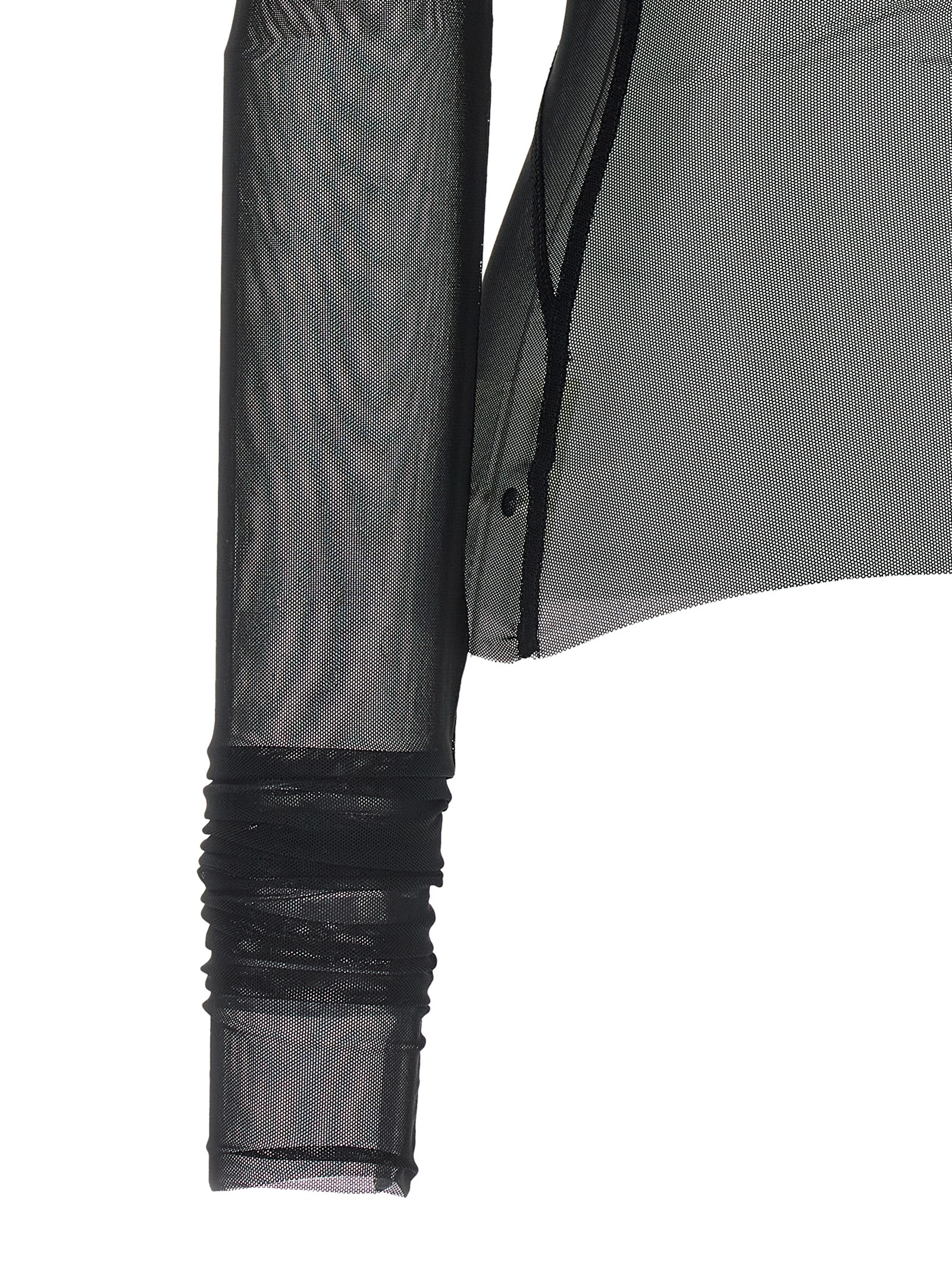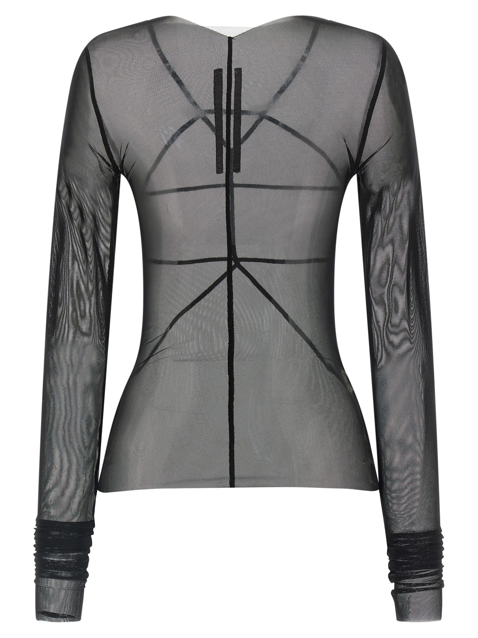 'Temple Top' напівпрозорий светр з еластичного нейлонового тюлю з необробленим низом, асиметричним вирізом з V-деталлю ззаду, наддовгими рукавами, геометричною декоративною строчкою спереду. УПРАВЛЯЄМО: Виріб виготовлено з перероблених матеріалів.
