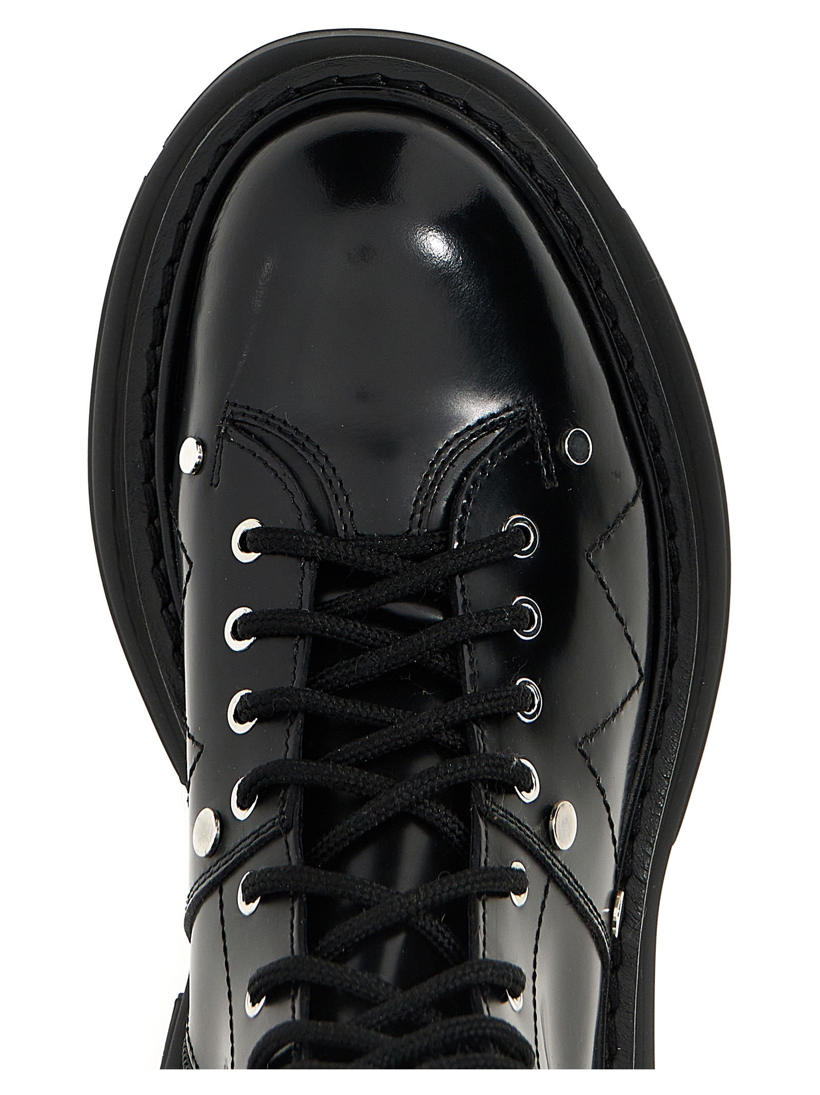 Alexander McQueen iconic 'Tread sole' black patent leather knee-high boots with tone-on-tone laces, iconic oversize sole, silver hardware and buckle.