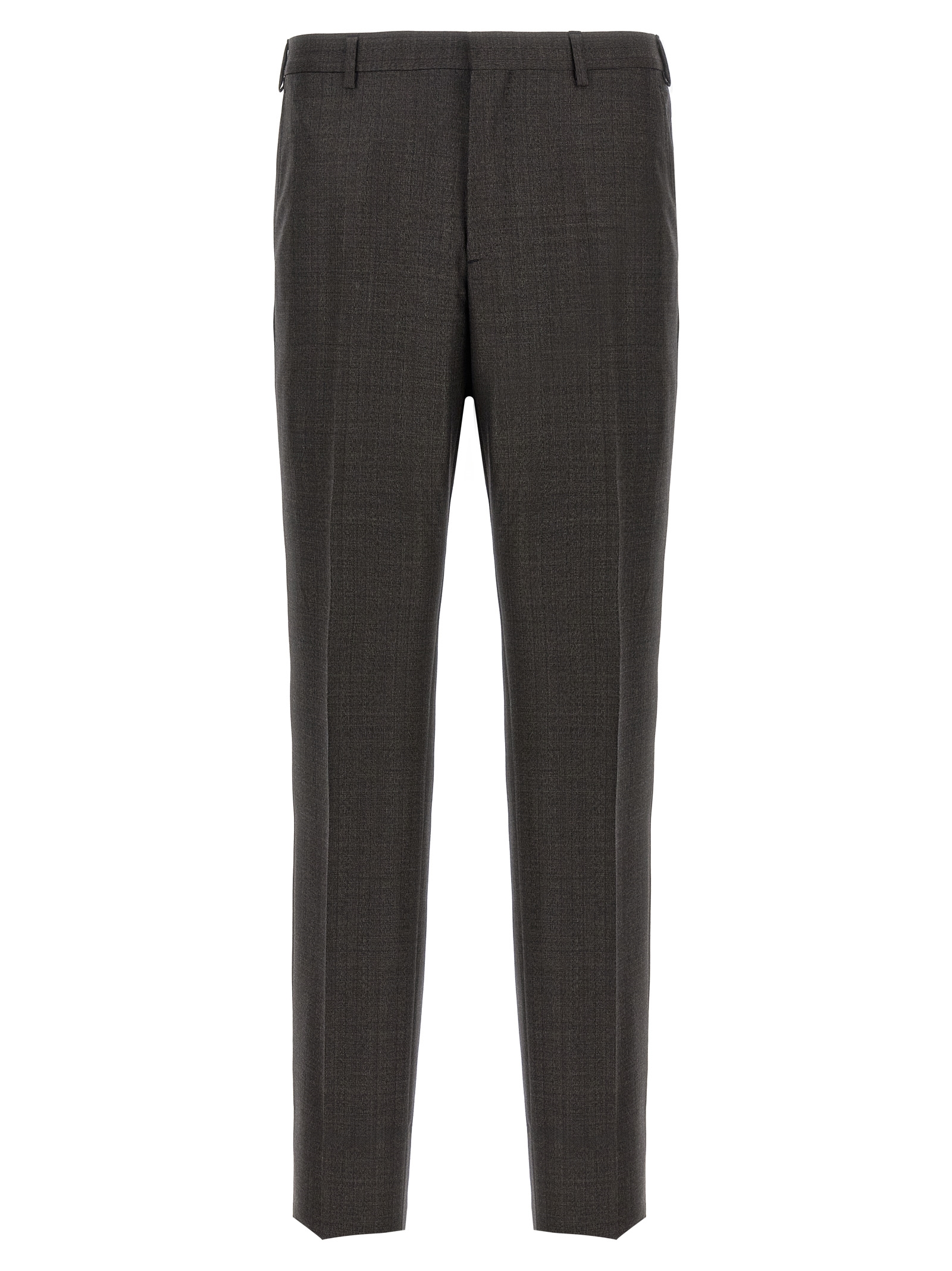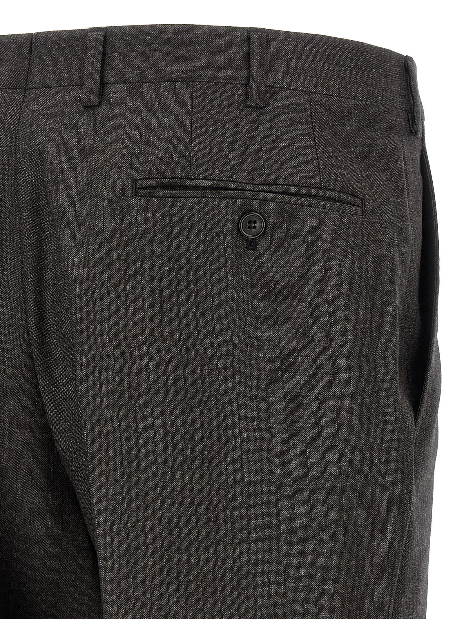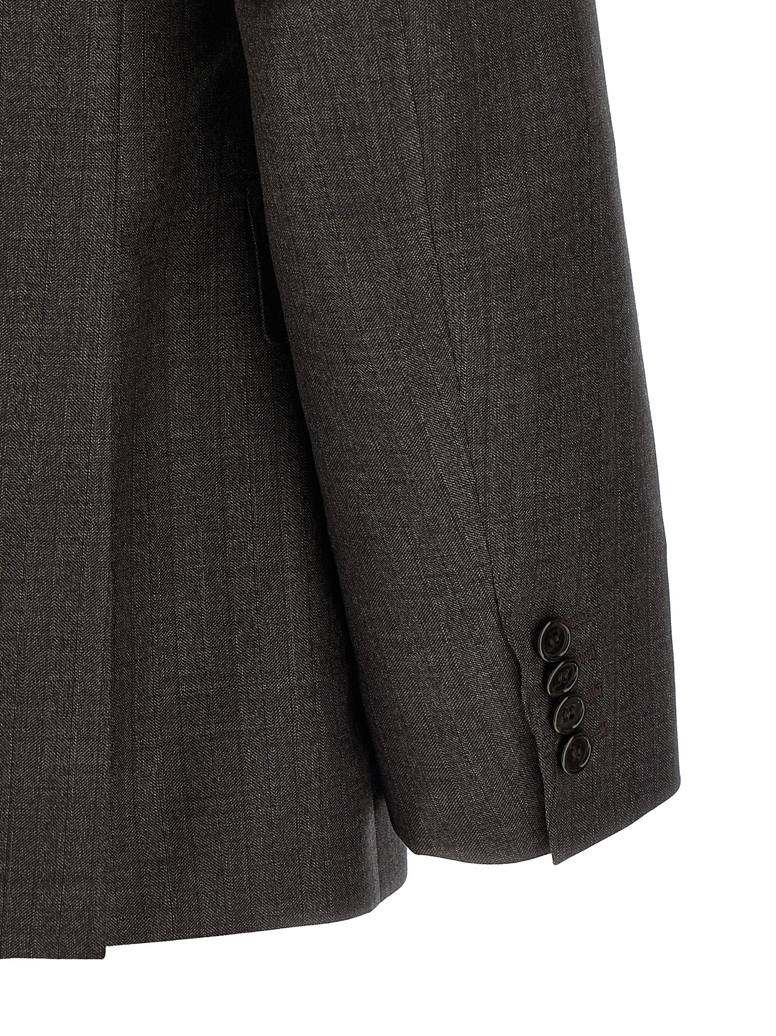 Wool grisaille 'Trevi' dress consisting of a blazer with lightweight construction and relaxed fit, single-breasted style with front button closure, mirror lapels, structured shoulder strap, cupro lining, breast pocket, flap pockets, buttonhole cuffs, back slits and tight flat front pants, stretched pleat, front 'americane pockets', back welt pockets, zip hook and buttons closure on the front.