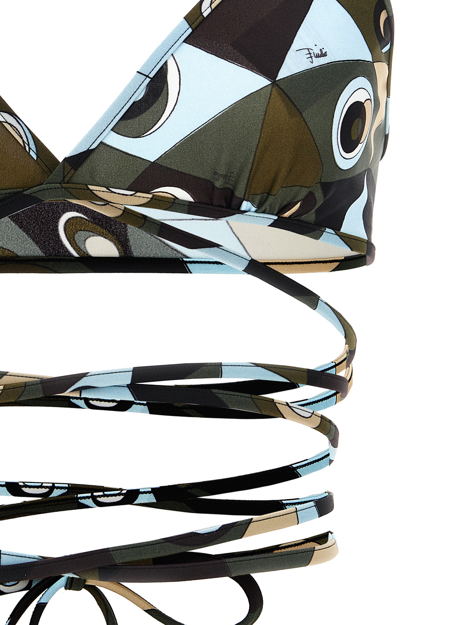 Топ-бікіні трикутної форми з лайкри з принтом 'Occhi', тонкі регульовані зав'язки, що зав'язуються на шиї та на спині, трикутні чашки. Цей виріб, як і багато інших виробів Pucci, виготовлений із принтом по всій поверхні, що лягає по-різному на кожен виріб; відправлений товар може відрізнятися від того, що на фотографії. ЕКОЛОГІЧНИЙ: Цей виріб виготовлений з екологічної анти-УФ лайкри LYCRA®.