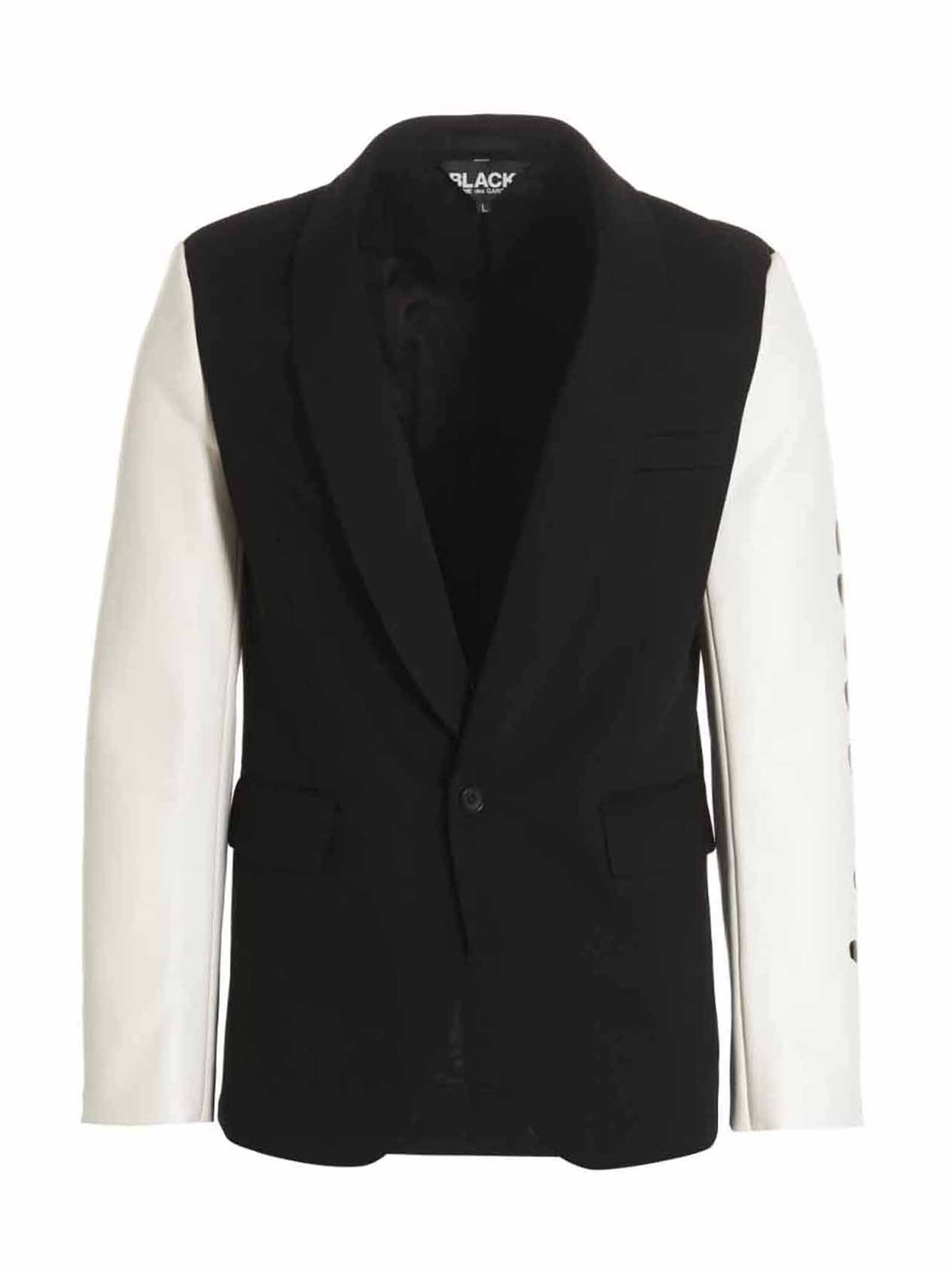 'True heart strong mind' two-material blazer jacket with printed eco leather sleeves and a single breast style.