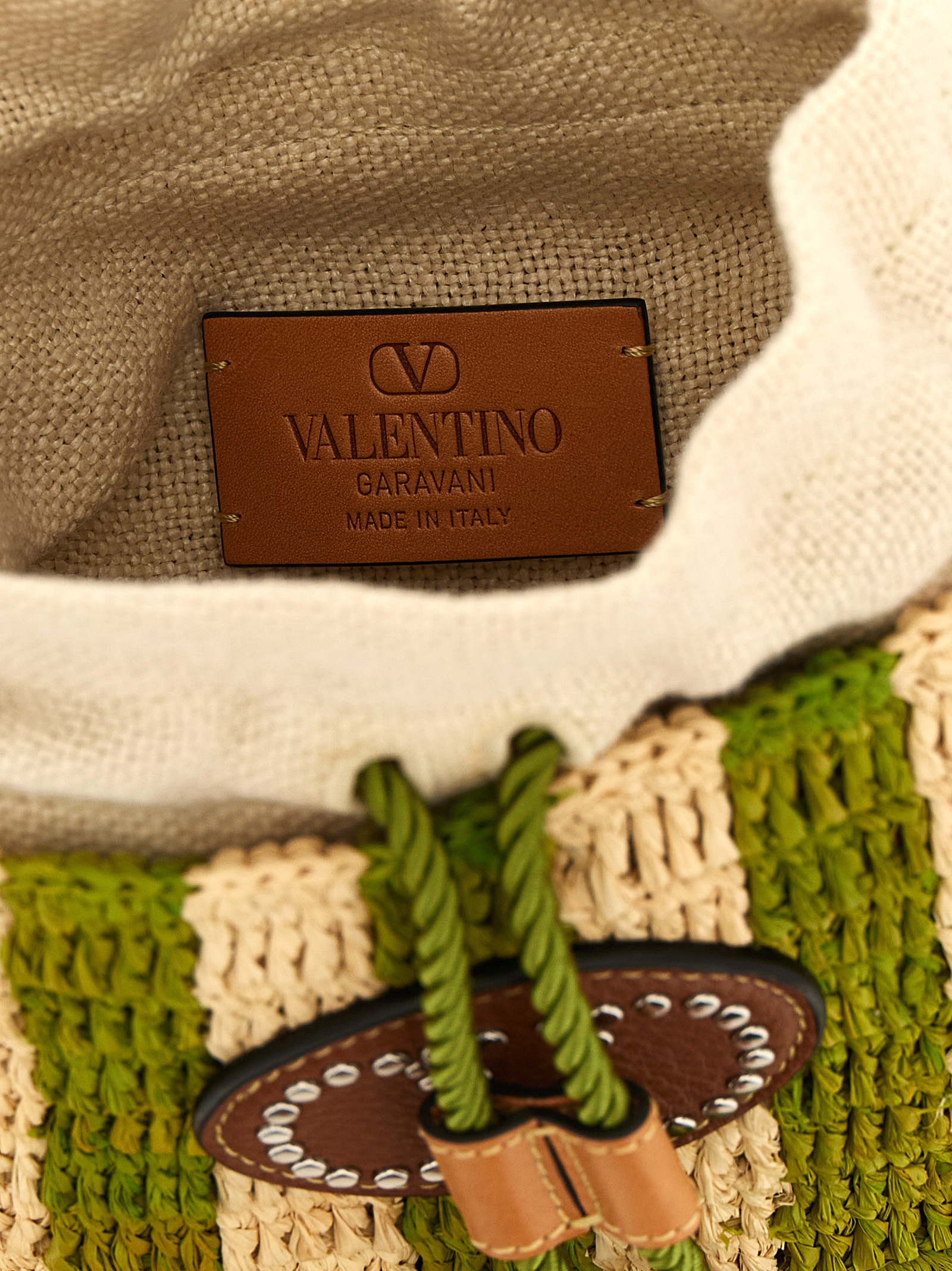 Маленька сумка-кільце з ручного плетіння з натуральної рафії з смугастим візерунком, шкіряна нашивка спереду з логотипом 'VLogo Signature', утвореним металевими заклепками, підкладка з льняного мішечка з шнуровою застібкою та китицями, жорстке дно з металевими ніжками, регульований і знімний шкіряний плечовий ремінь. Виріб ручної роботи, будь-які недосконалості слід вважати характеристиками унікальності.