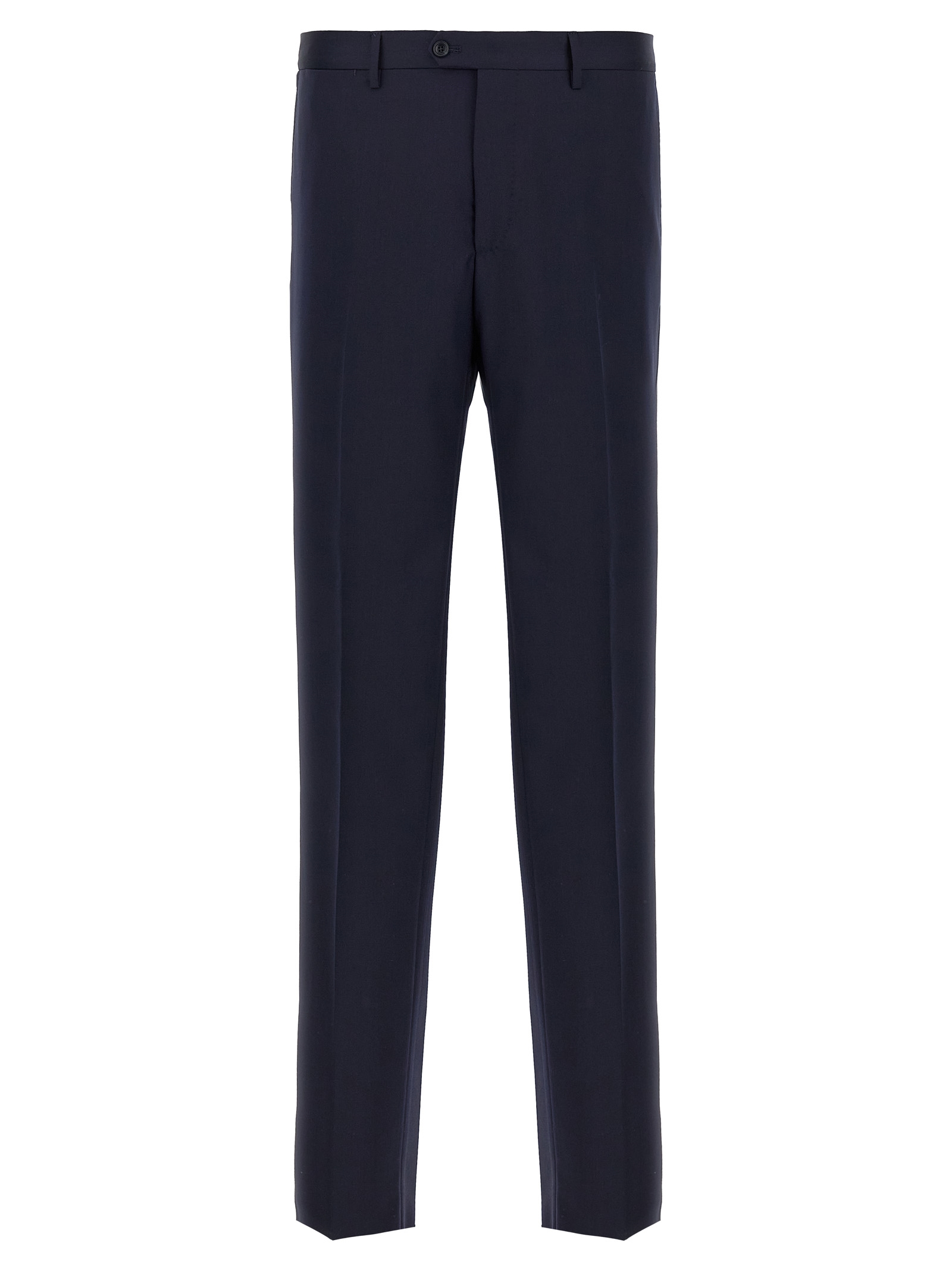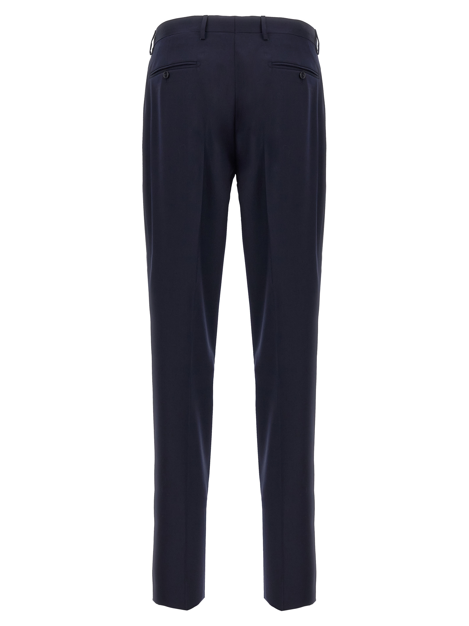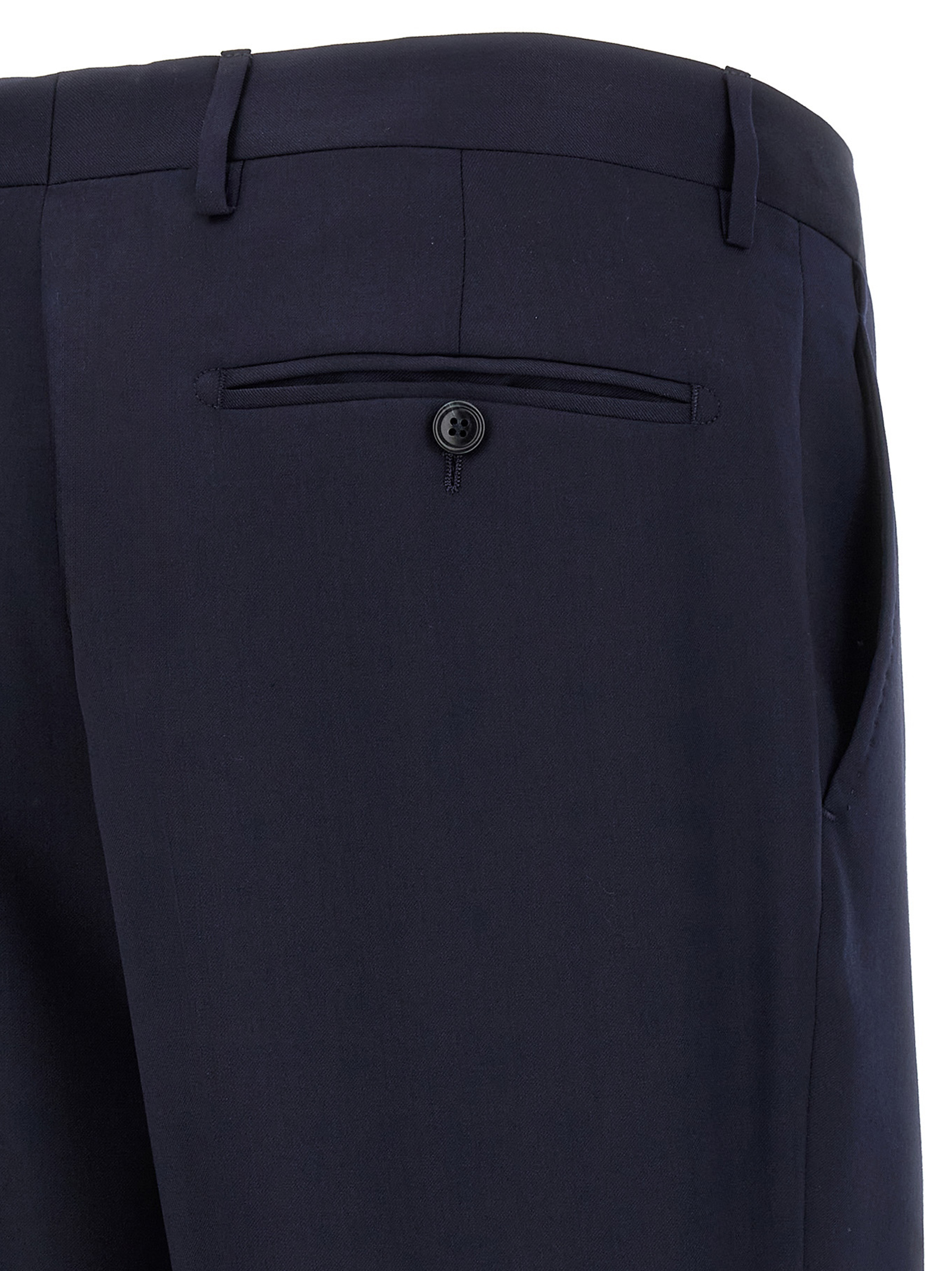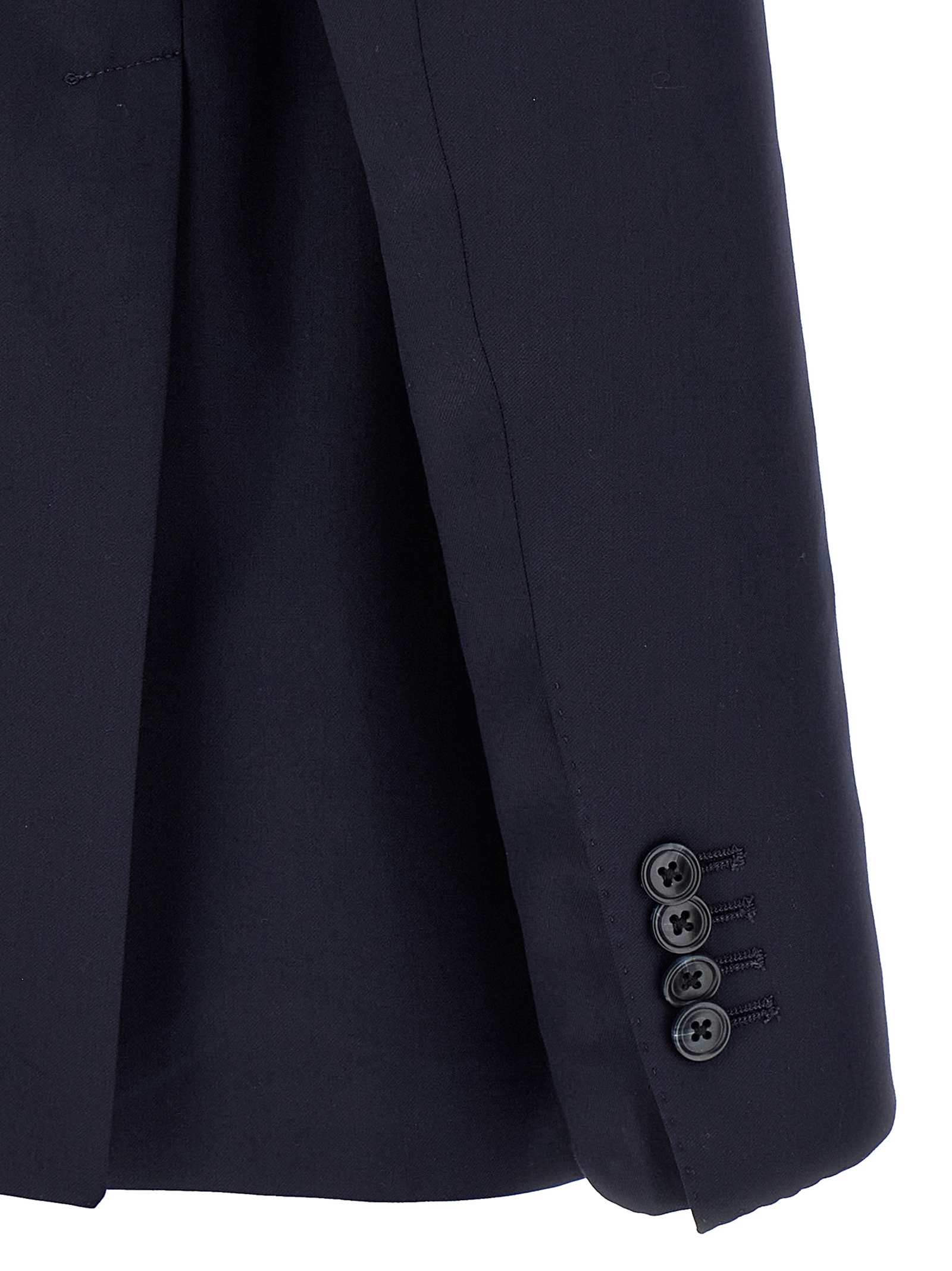 Сукня 'Vesuvio' з virgin wool, що складається з деконструйованого піджака з однобортною застібкою, передніми гудзиками, дзеркальними лацканами з знімною металевою брошкою, напівпідкладкою, нагрудною кишенею, клапанними кишенями, манжетами з гудзиками, розрізами ззаду та звичайними плоскими штанами, еластичними складками, передніми кишенями 'американського' типу, задніми welt кишенями, застібкою на блискавці та передніми гудзиками.