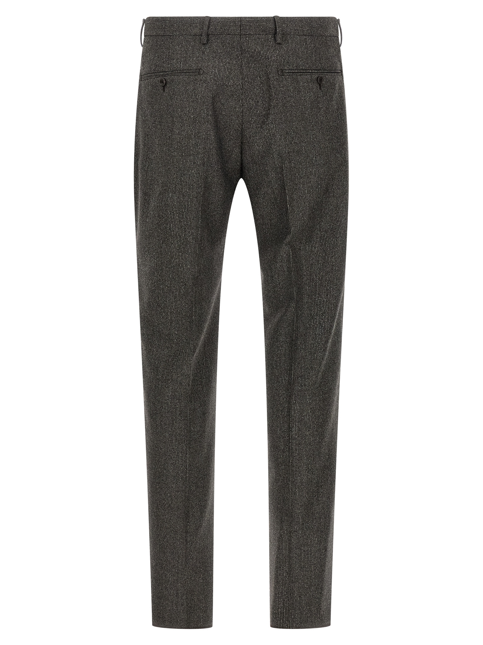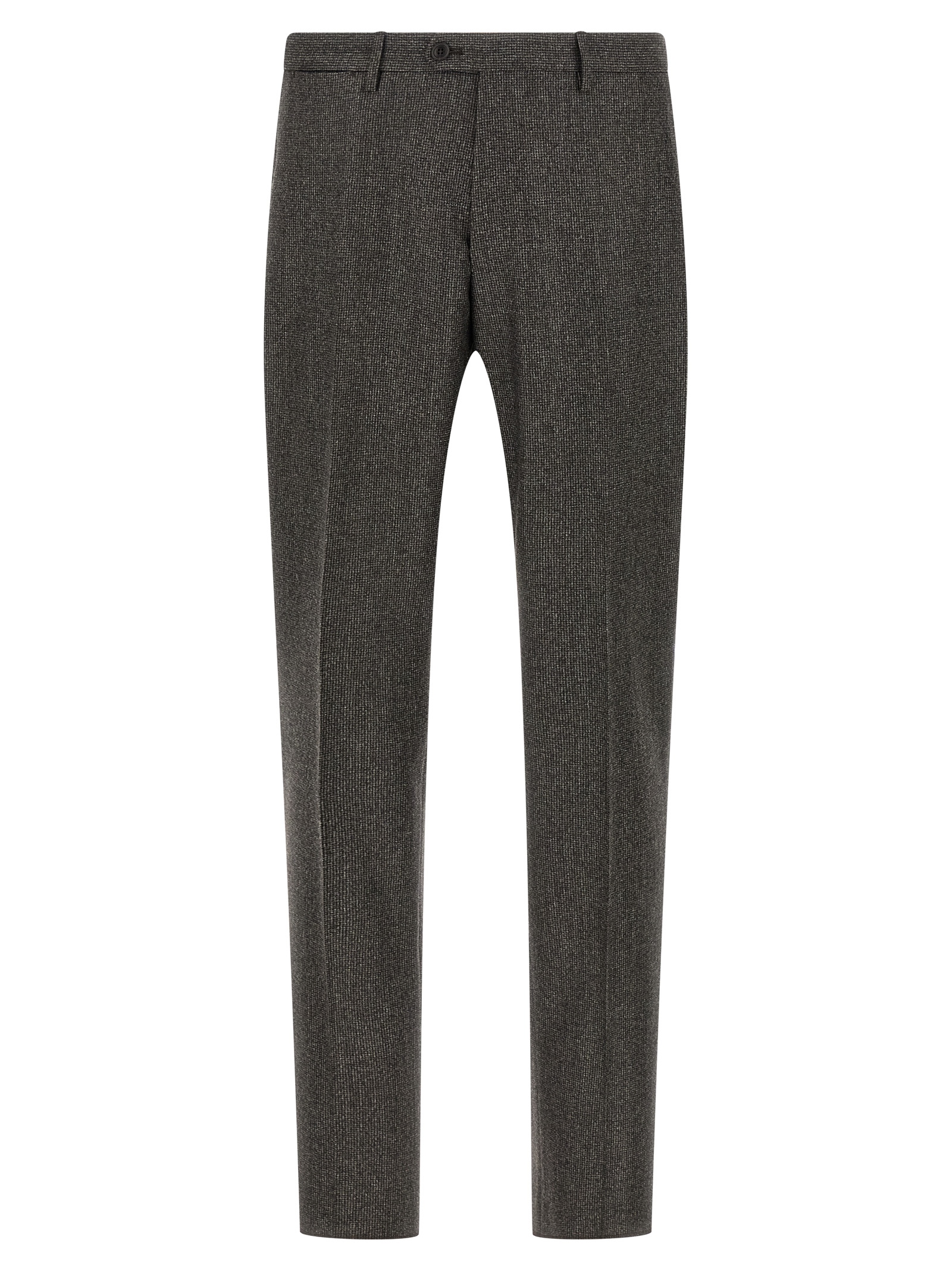 'Vesuvio' сукня з супер 110's вовни з мікро гусинкою, що складається з однобортного блейзера з передньою застібкою на ґудзику, дзеркальними лацканами з знімною брошкою, грудною кишенею, клапанними кишенями, манжетами з відкритими ґудзиками, задніми розрізами, штанами з застібкою на блискавці та ґудзику, кишенями, розтягнутими складками.