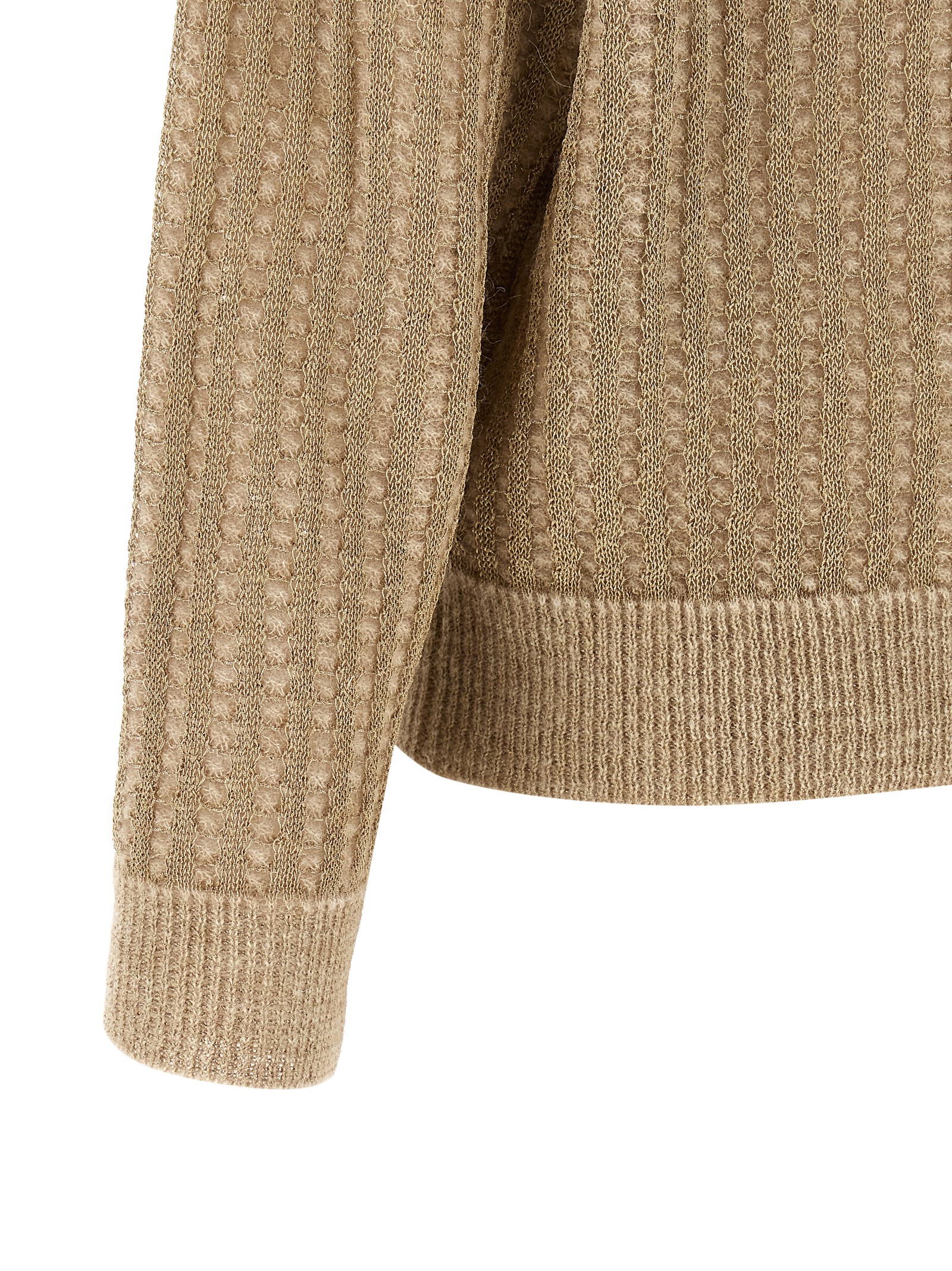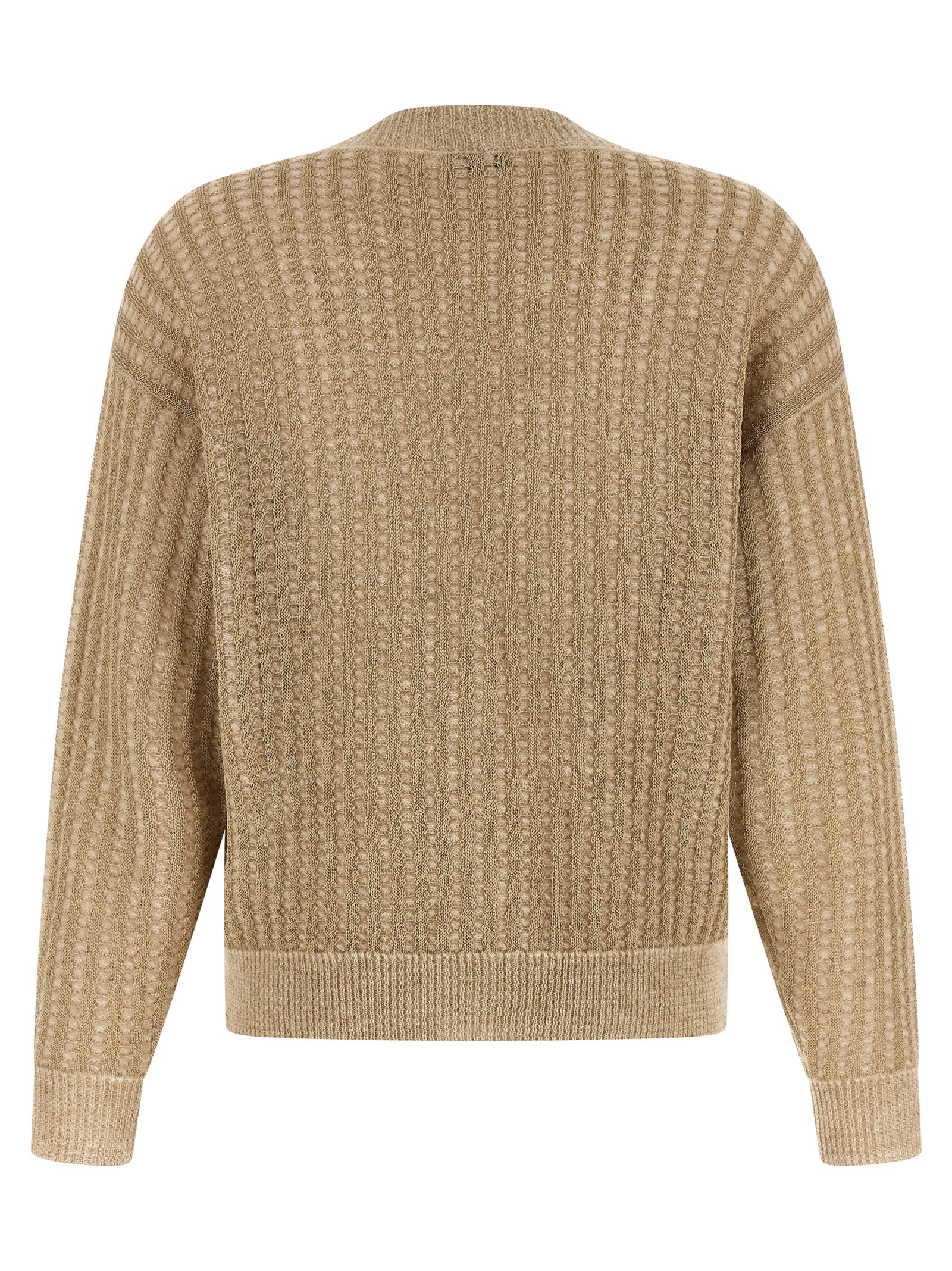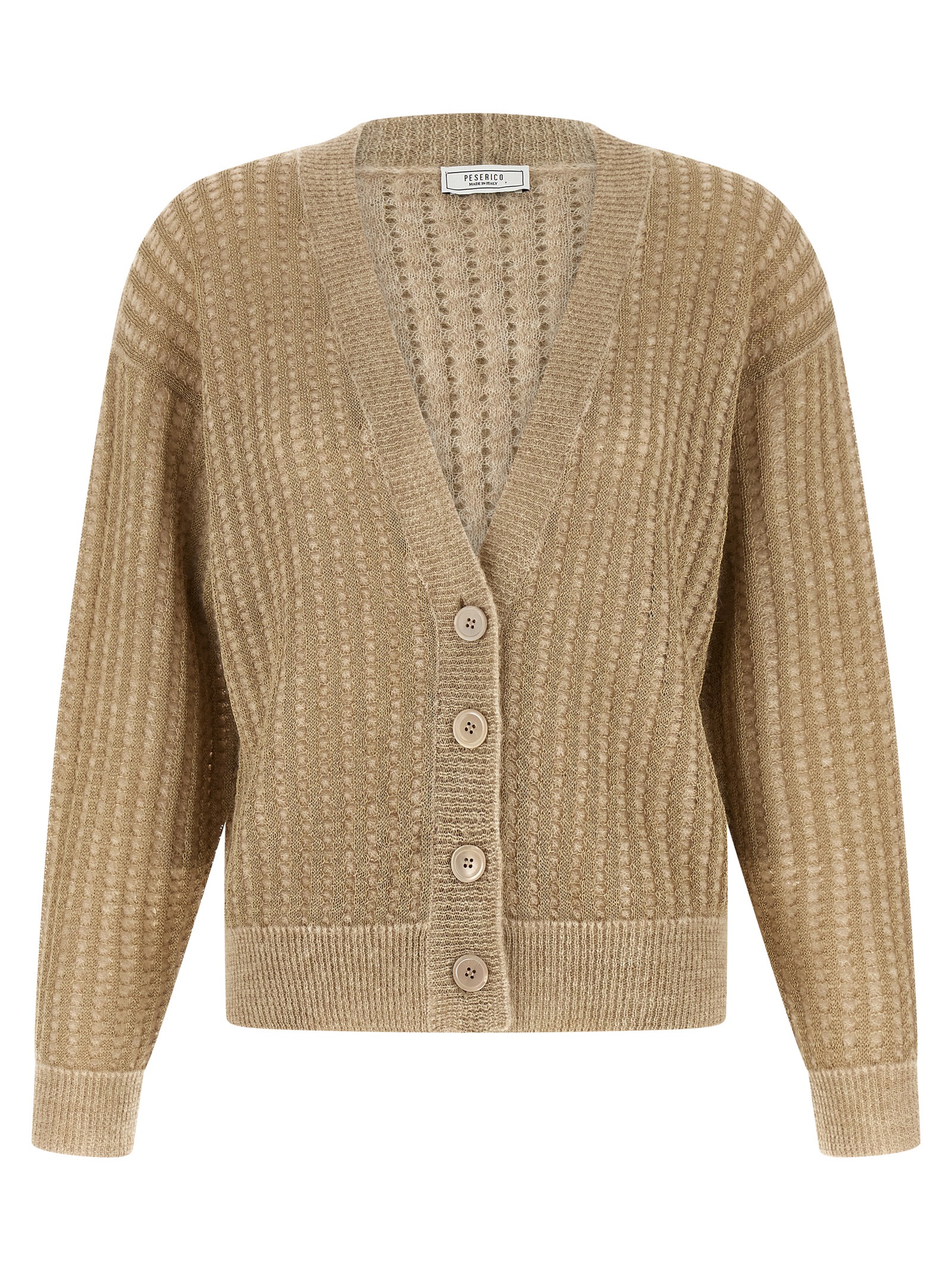 В'язаний кардиган з суміші віскози, альпаки та нової вовни з вафельним ефектом, оздоблений металізованою ниткою (ламé), V-подібний виріз, передня застібка на ґудзики, довгі рукави з манжетами і заниженим плечем, та резинка на низу.
