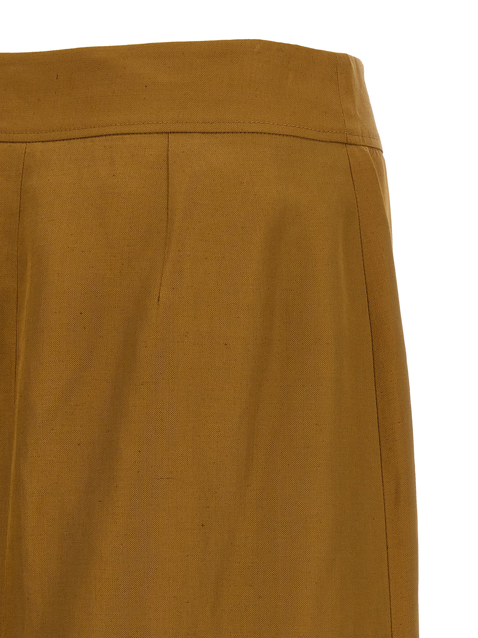 Спідниця на запах міді зі суміші віскози та льону, фасон «гаманець» з асиметричною застібкою і переднім гачком.