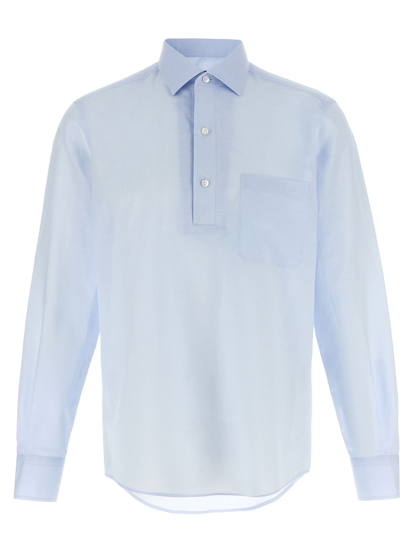 Сорочка з льняної суміші, комір, три ґудзики спереду, довгі рукави з манжетами.