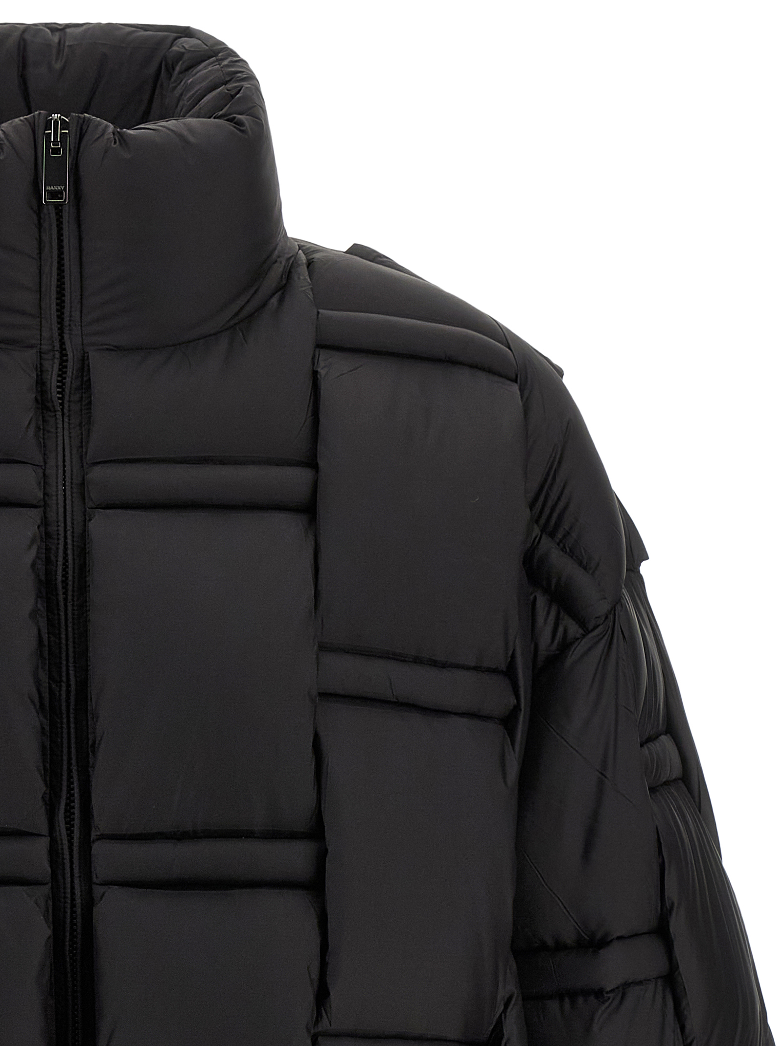 Нейлоновий пуховик з плетеною 3D структурою та утепленням з гусиного пуху, високий комір, застібка на блискавці спереду, кишені, довгі рукави.