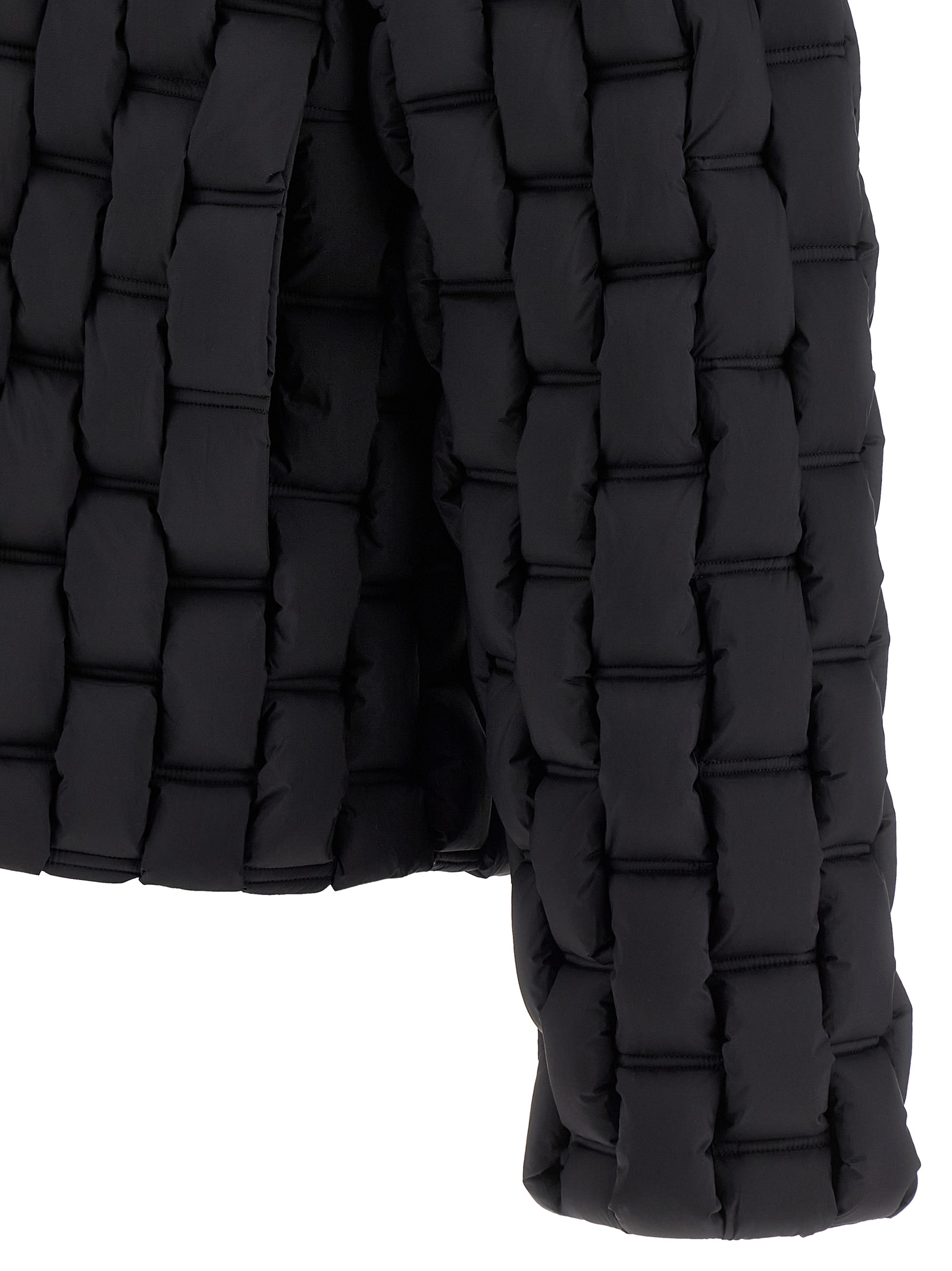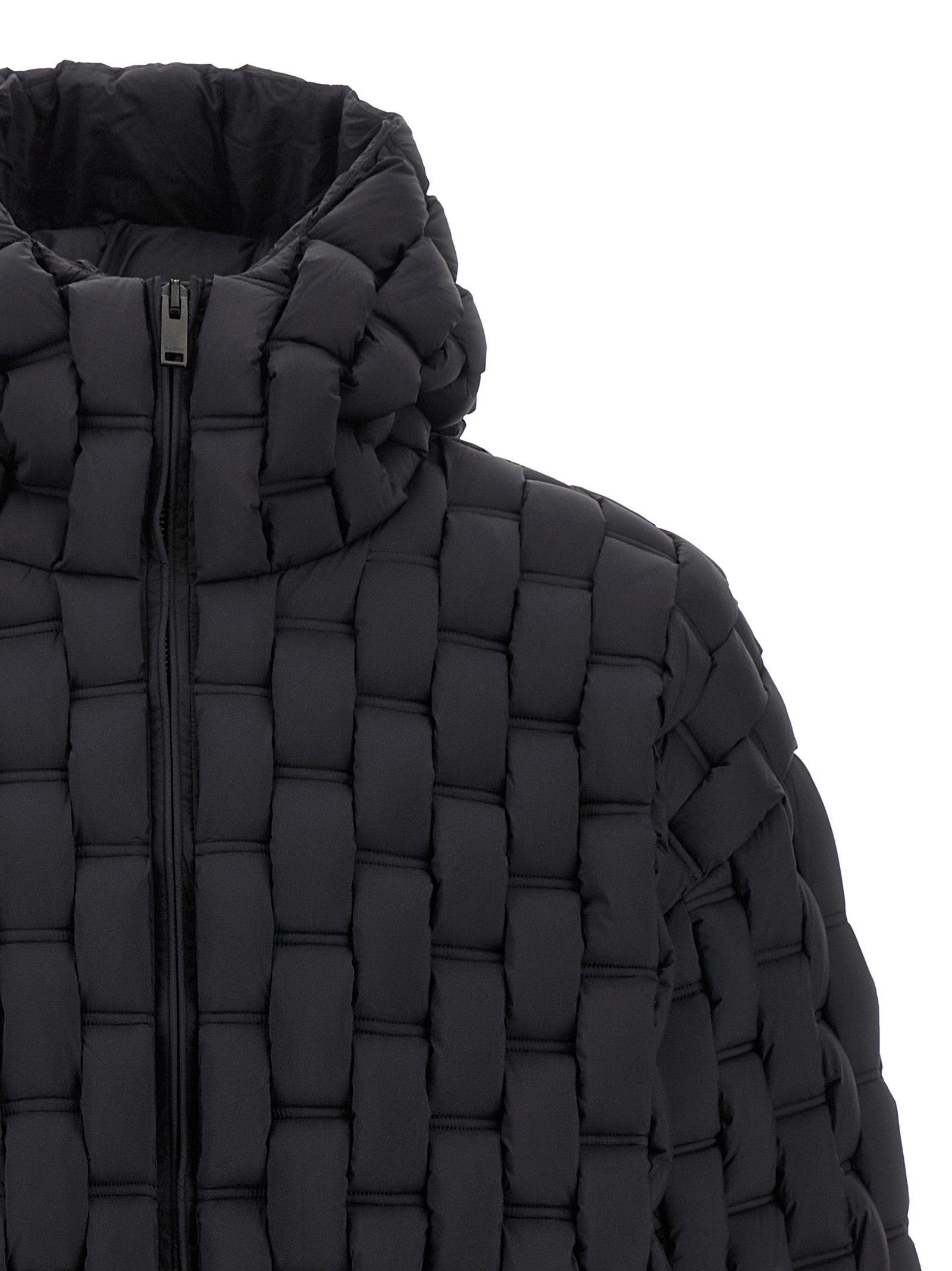 Нейлоновий пуховик з 3D структурою плетеного та пухом з гуски, капюшон, високий комір, застібка на блискавку спереду, кишені, довгі рукави.