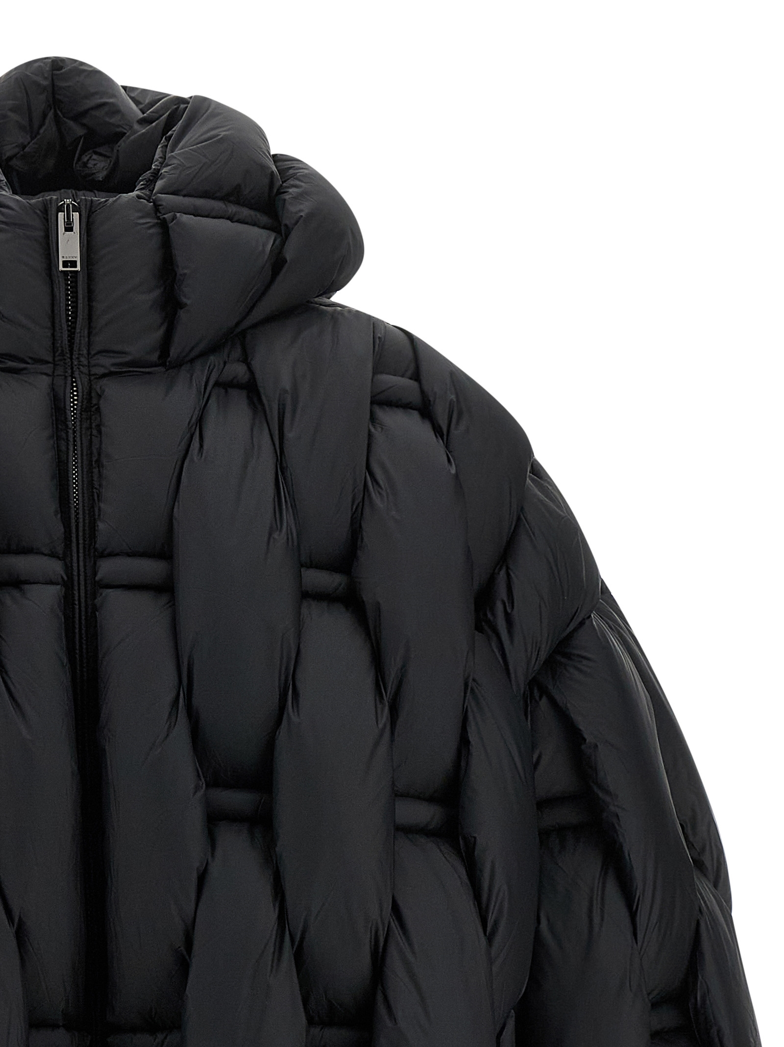 Нейлоновий пуховик з плетеною 3D структурою та утепленням з гусиного пуху, капюшон, високий комір, застібка на блискавці спереду, кишені, довгі рукави з манжетами та опущеними плечима, шнурок на краю.
