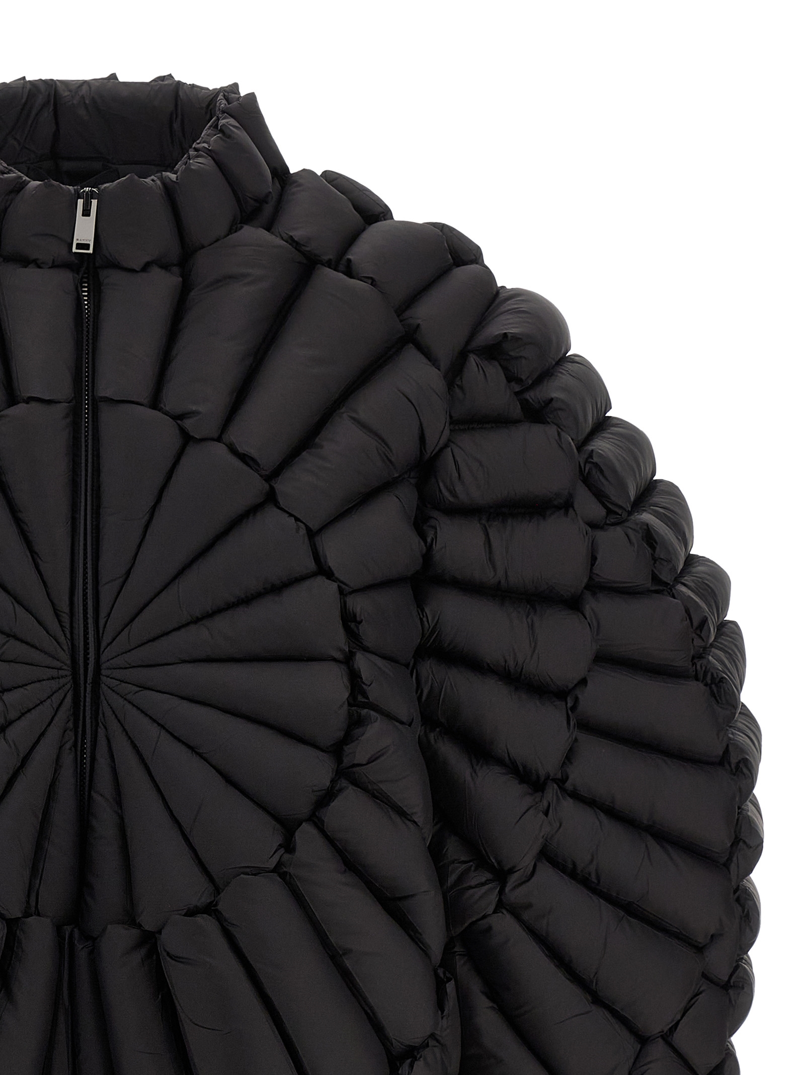 Нейлоновий пуховик з 3D структурою та наповнювачем з гусячого пір'я, високий комір, передня застібка на блискавці, кишені, довгі вигнуті рукави, округлий подол.