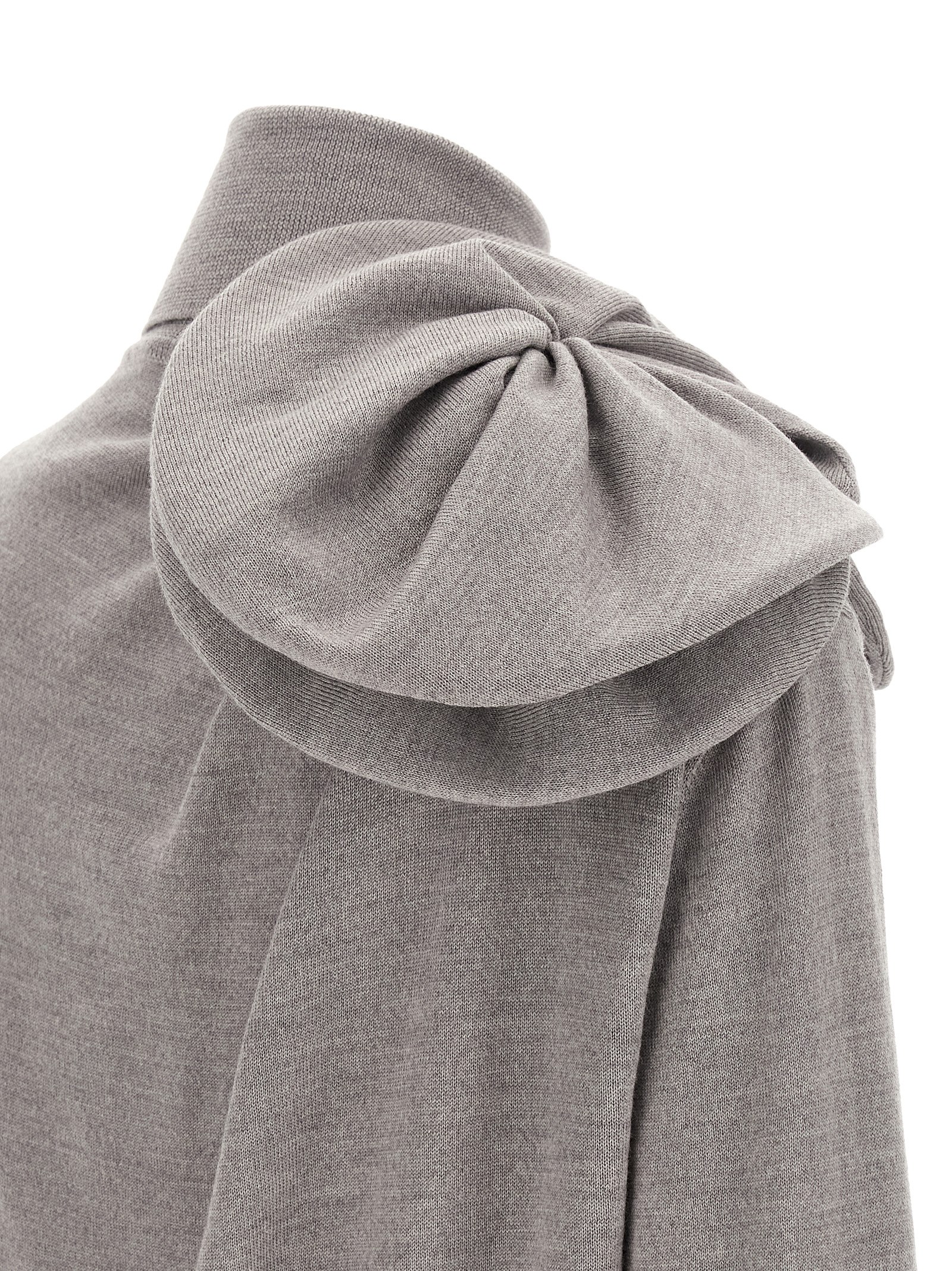 Светр з екстра-фінської меріносової вовни, декорований 3D-квітами на плечі, піднята горловина, довгі рукави з манжетами.