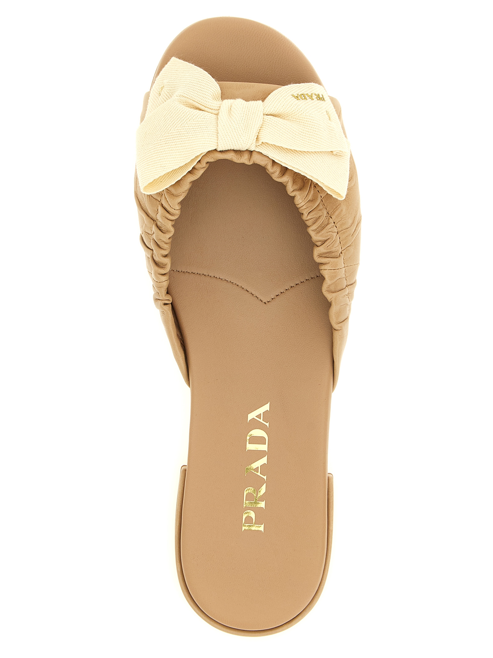 Слайди з м'якої шкіри з вигнутим антикварним вигином, контрастний бавовняний канвас з бантом спереду з тисненим логотипом, шкіряна підошва з ненависними гумовими деталями.