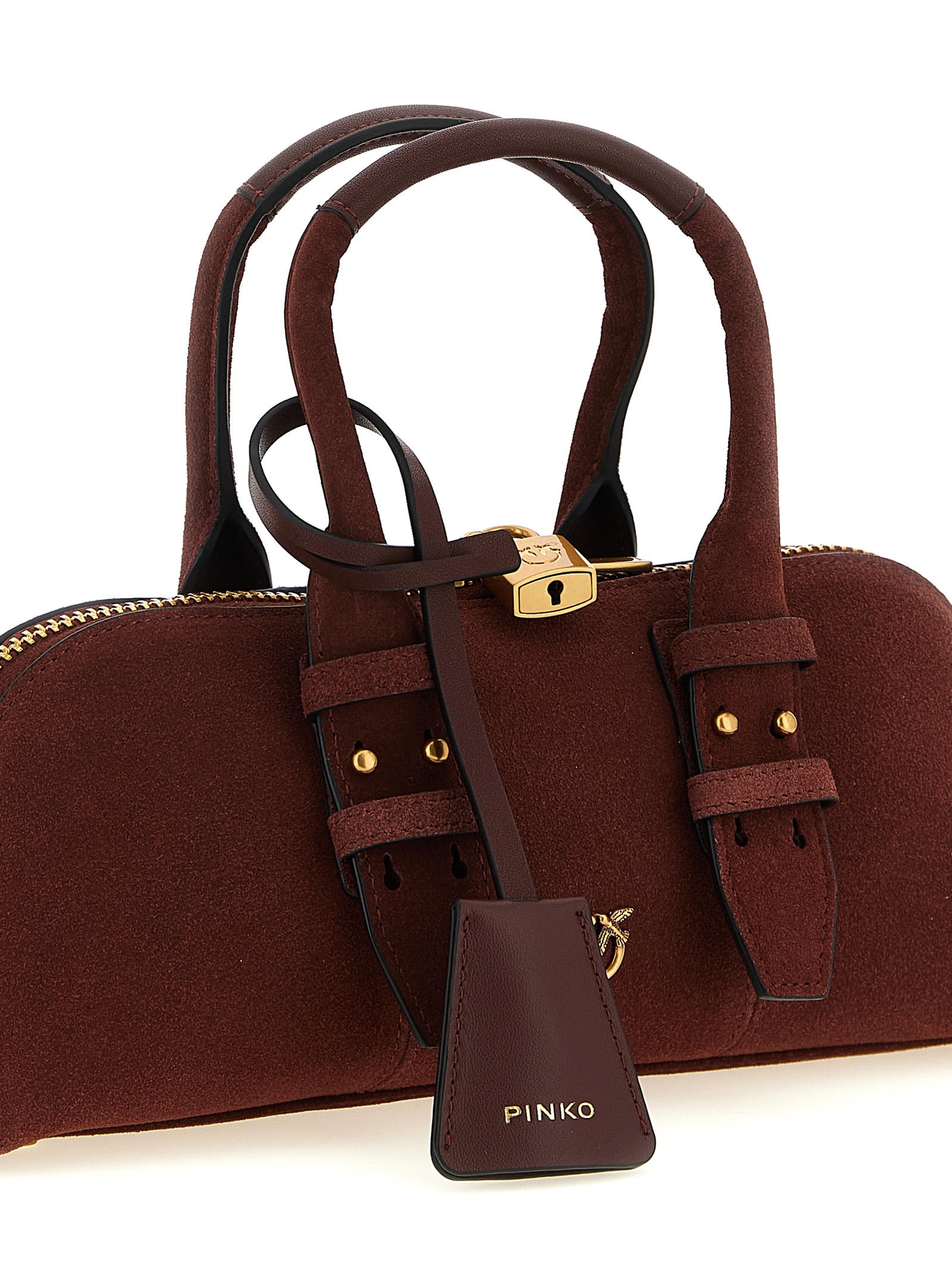 'Bowling Baguette' замшена сумка через плече, металевий логотип 'Love Birds' спереду та вишивка на спині, подвійна регульована ручка, верхня застібка на блискавці з замковою деталлю, жорстке дно з металевими ніжками, регульований і знімний плечовий ремінь.