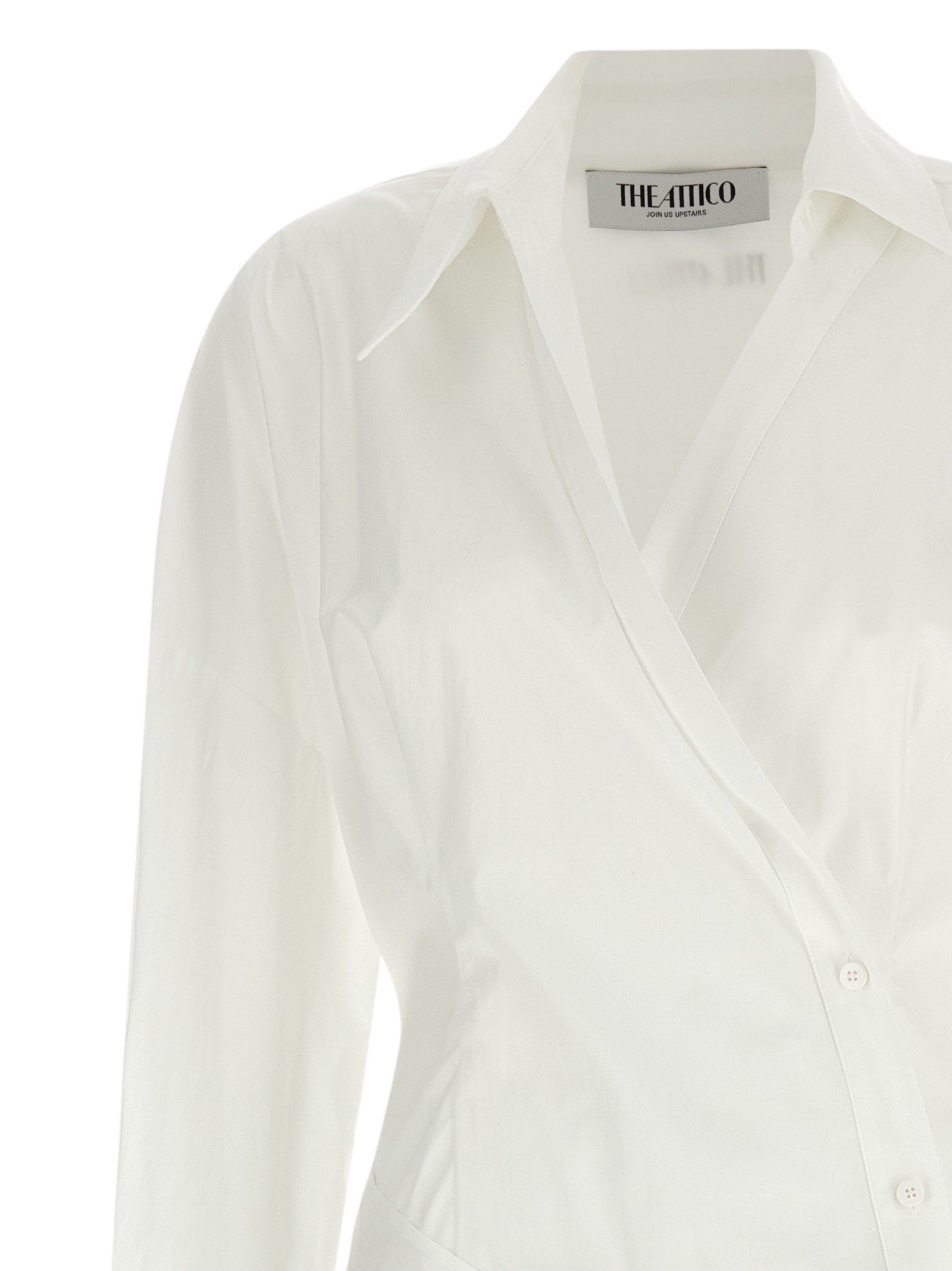 Міні-сукня з бавовняного попліну з асиметричною застібкою на гудзиках спереду, довгі широкі рукави з манжетами та спущеними плечима, спідниця з поясом, щоб зав'язати за бажанням.