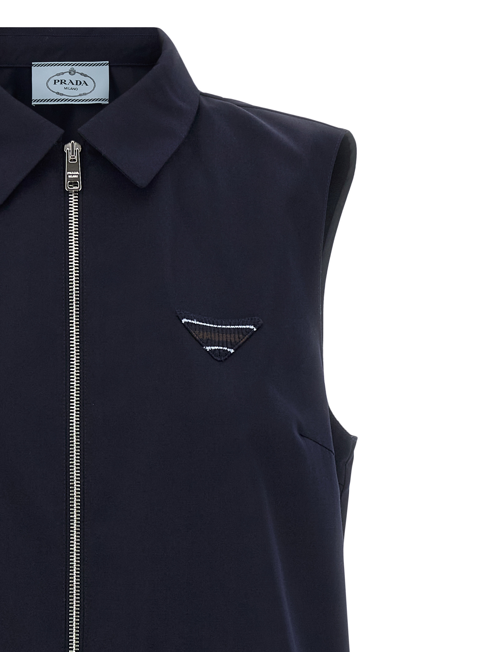 Poplin mini dress, chemisier model, triangle fabric logo and front half-zip, flared, sleeveless silhouette, pockets, drawstring on the hem, unlined.