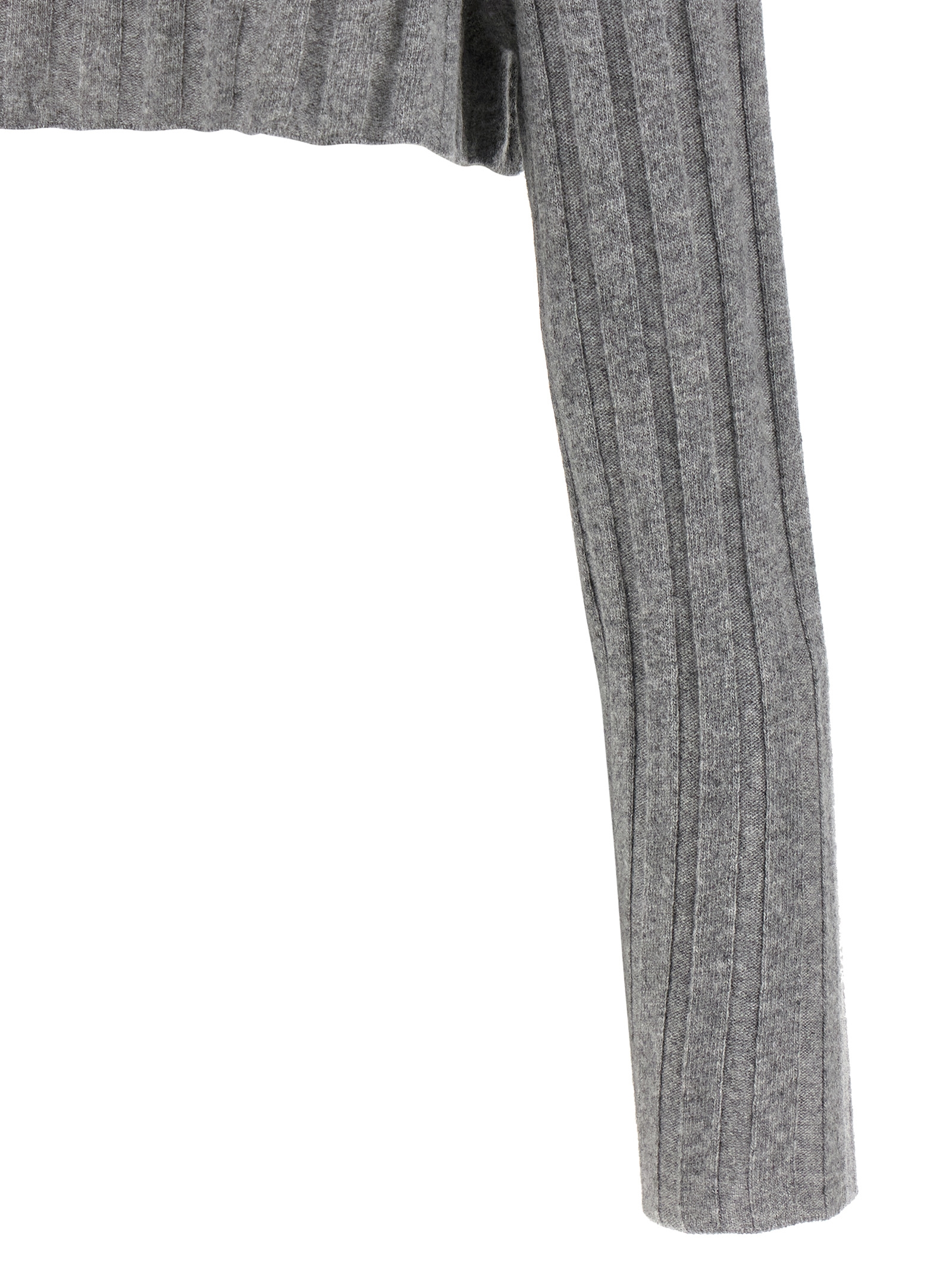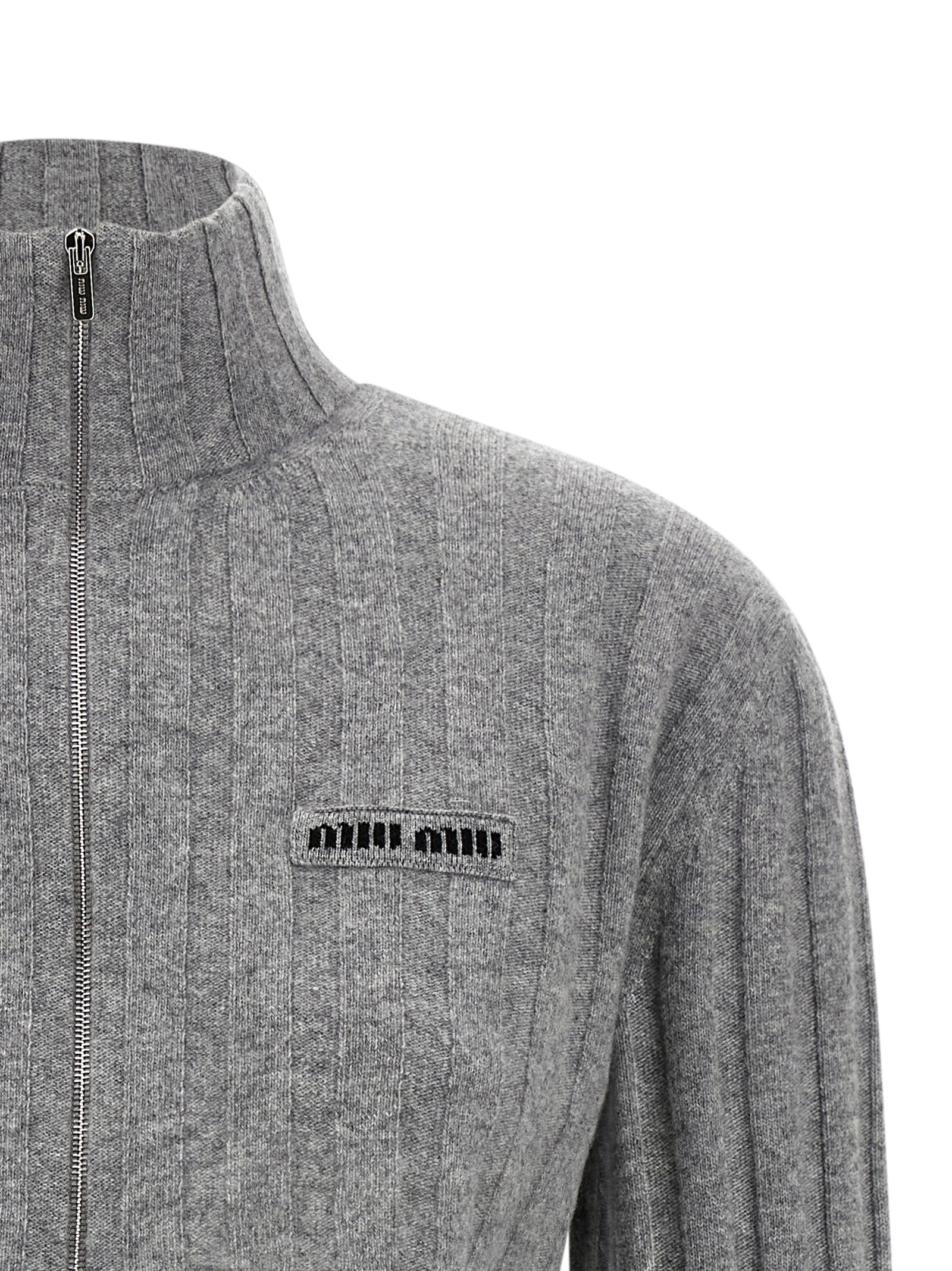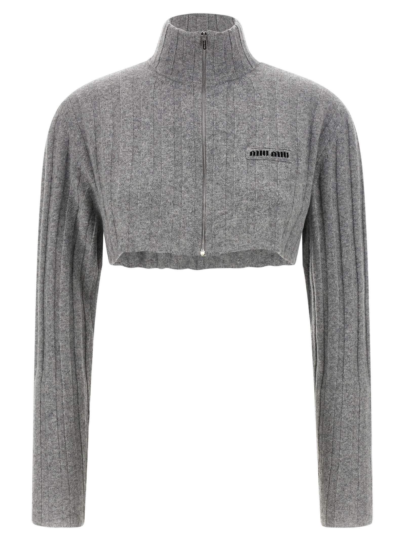 Короткий кардиган з рифленої вовни, передній логотип, високий комір, передня металева застібка на блискавці, довгі рукави.