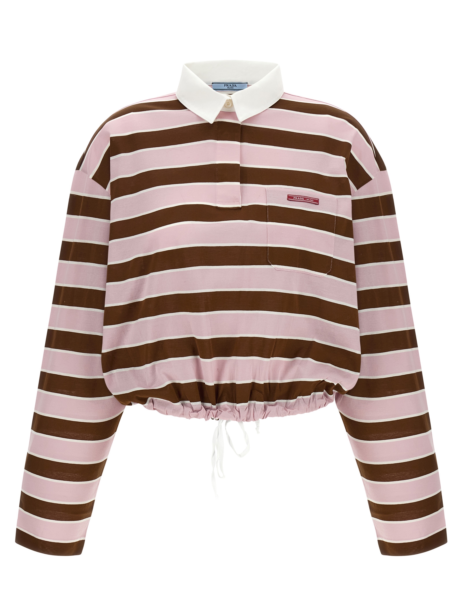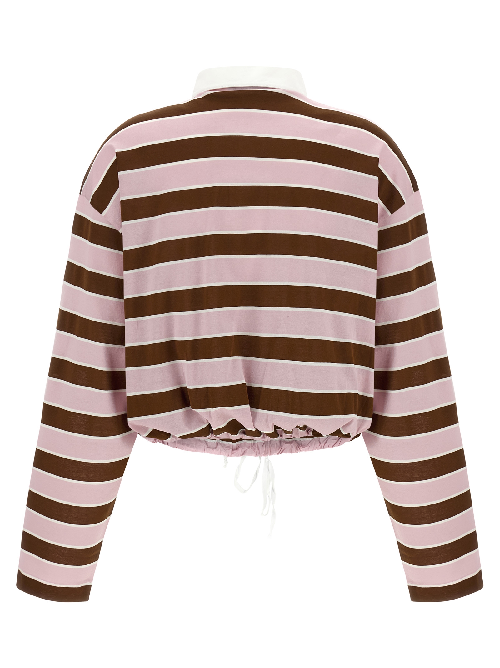 Смугаста бавовняна поло з контрастним коміром та гудзиками з оксфорда, укорочена модель, патч з логотипом, довгі рукави, шнурок на подолі.