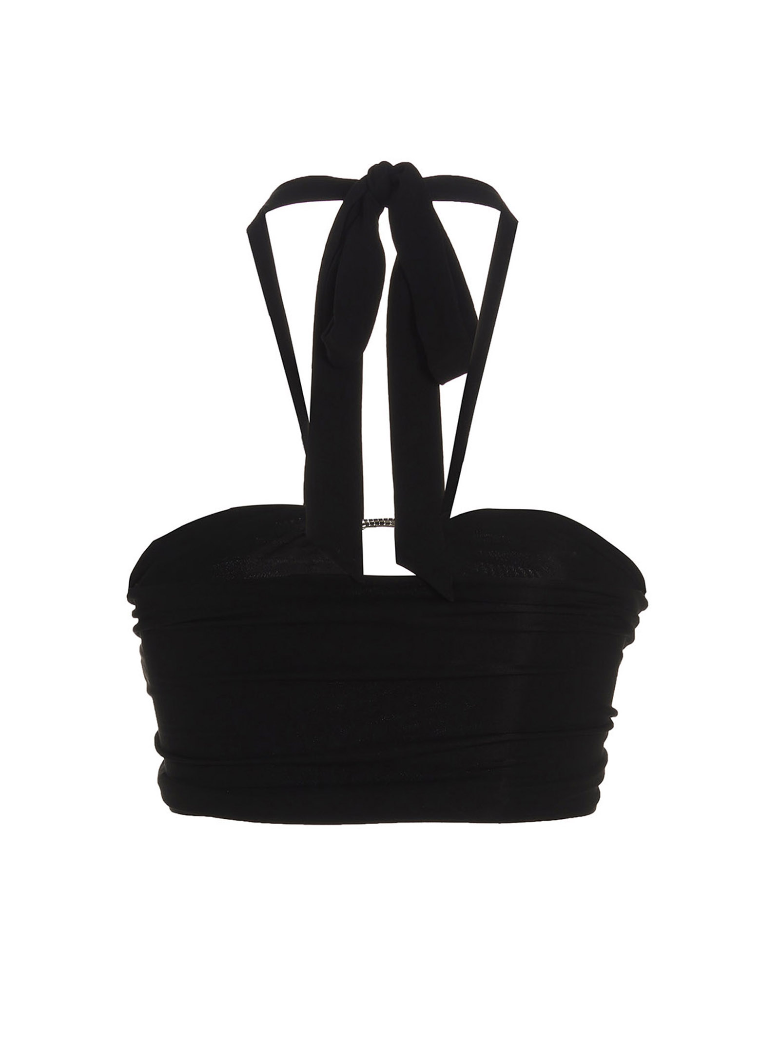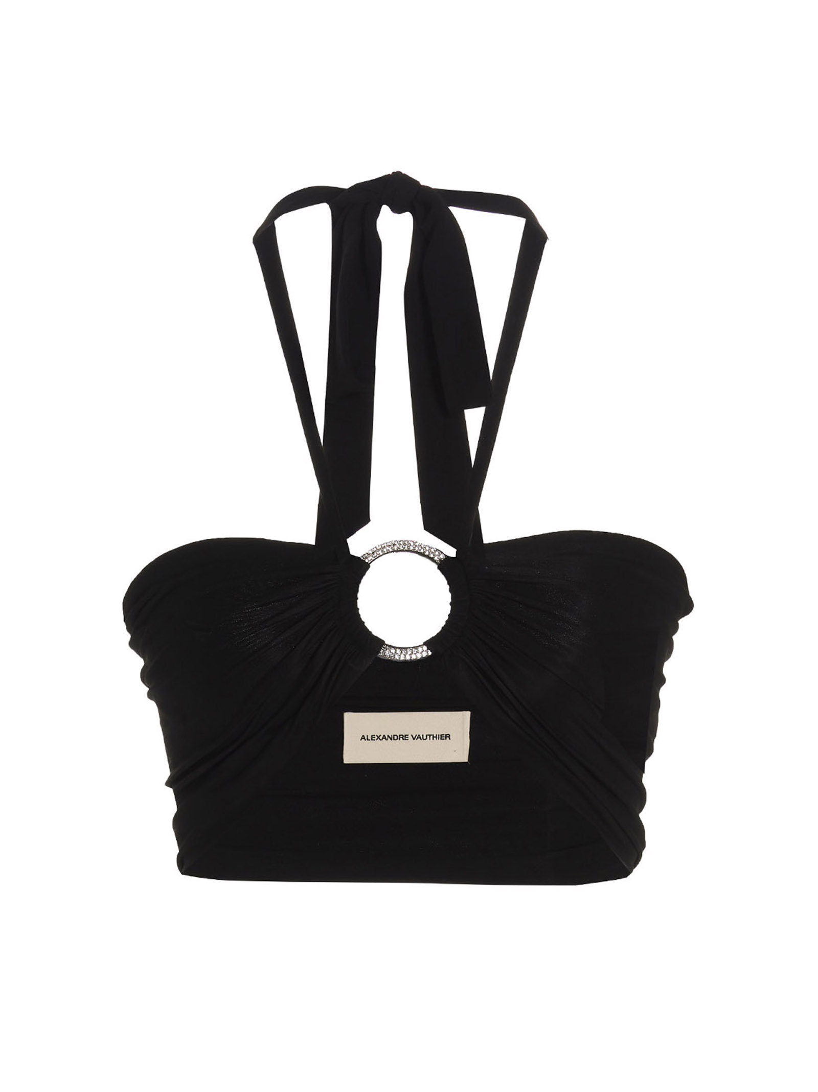 Укорочений топ з еластичної тканини з металевим кільцем і кристалом спереду, а також шнурівкою на шиї.